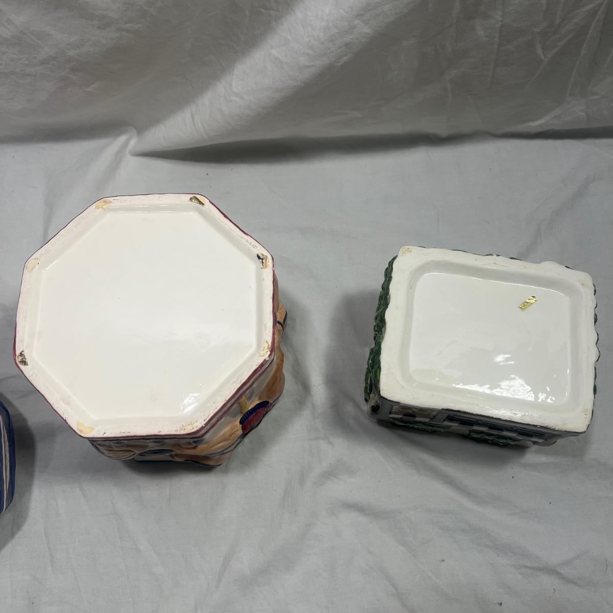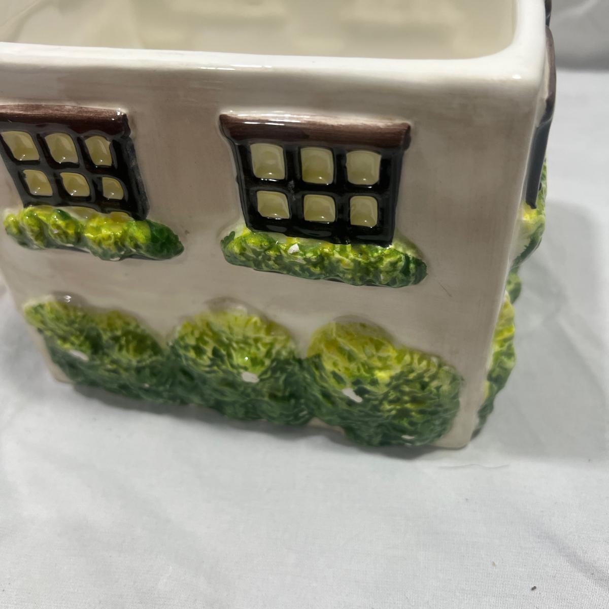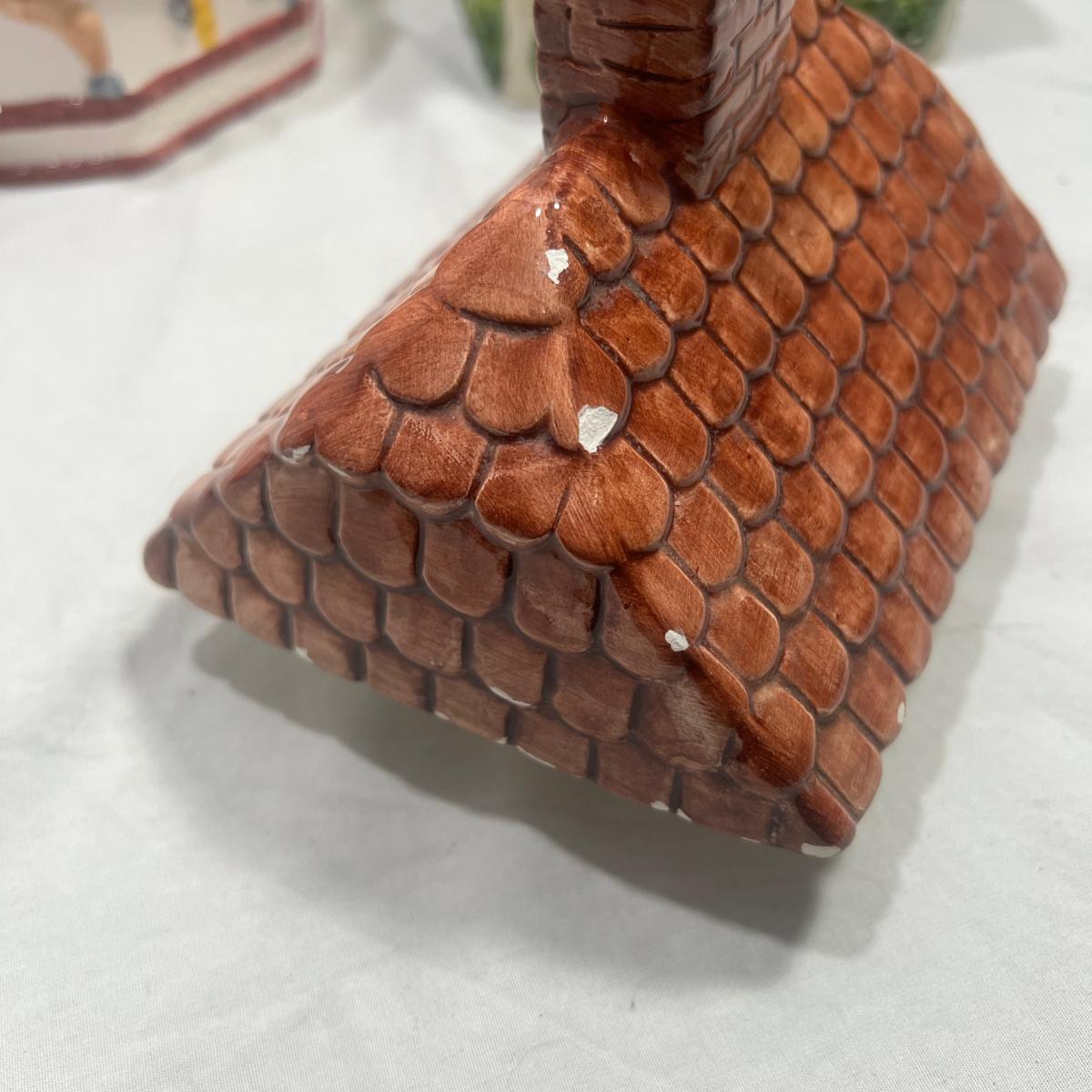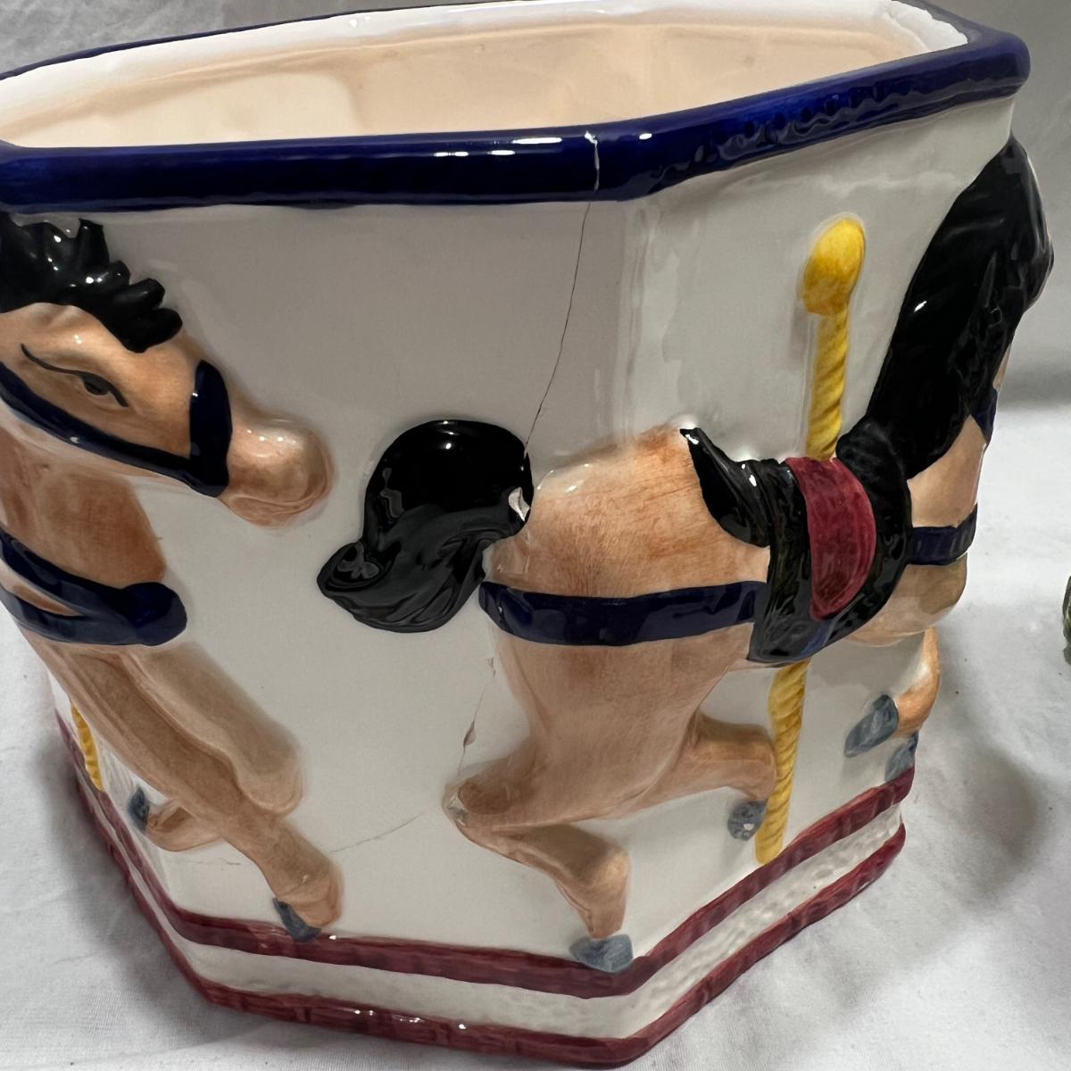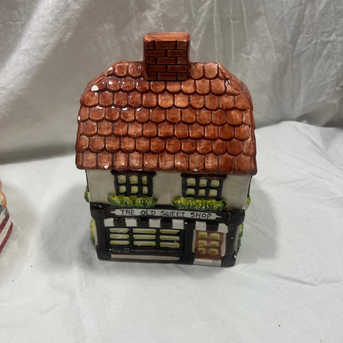 Well Loved Cookie jars; carousel cookie jar with long crack on the inside and Cookie house, with many dings and chips but could easily be touched up with paint.