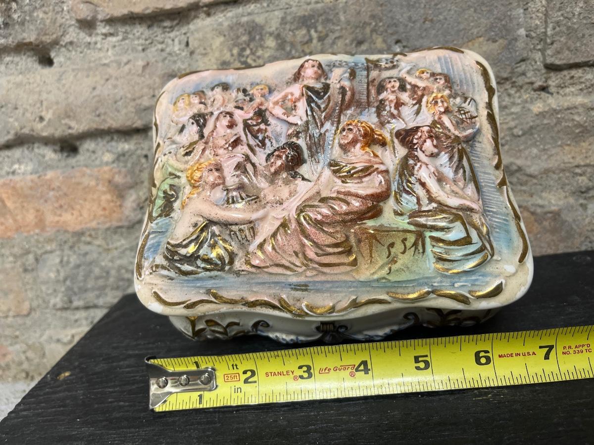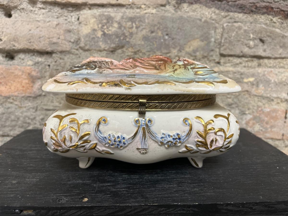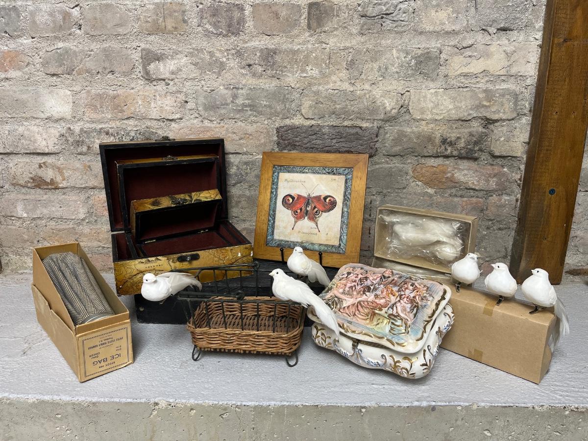 Set of three nesting trinket boxes, large porcelain trinket box, butterfly trivet, vintage water bottle with box, a dozen feather dove clips, and raffia & metal handled basket