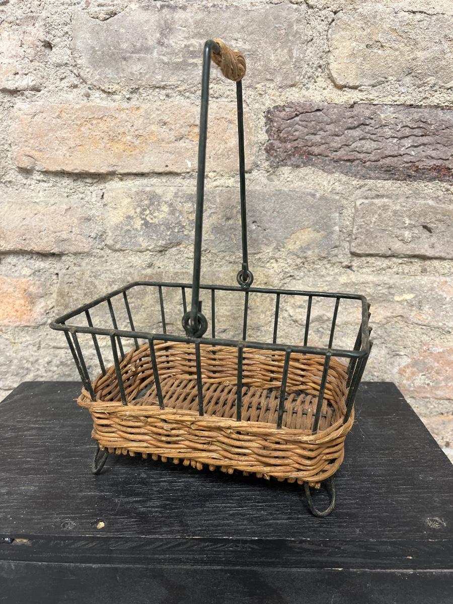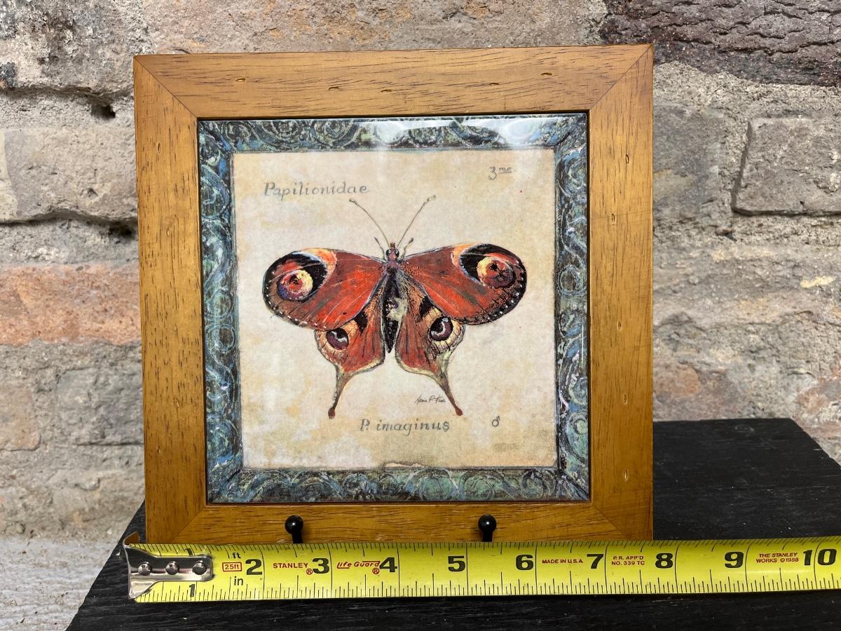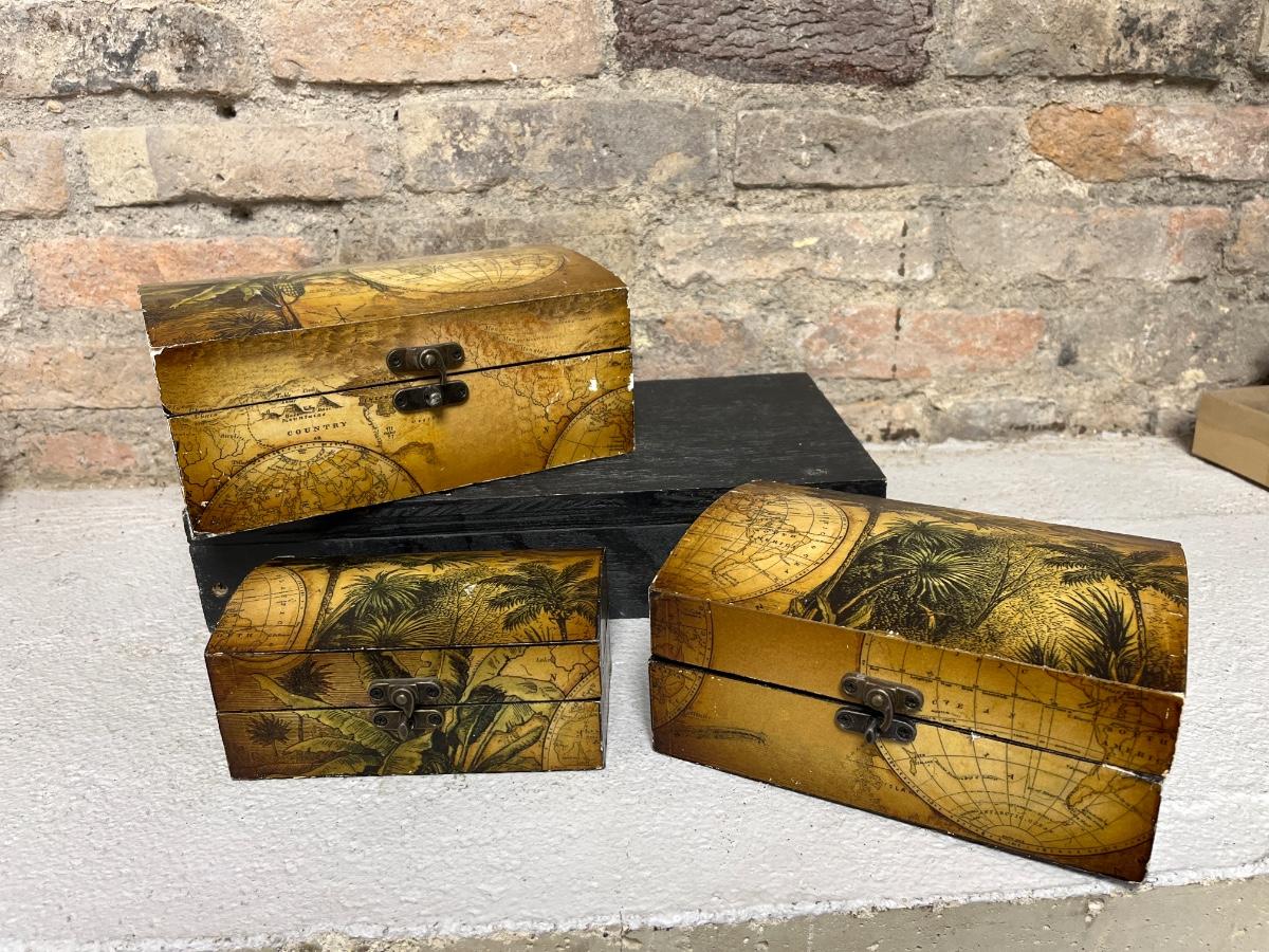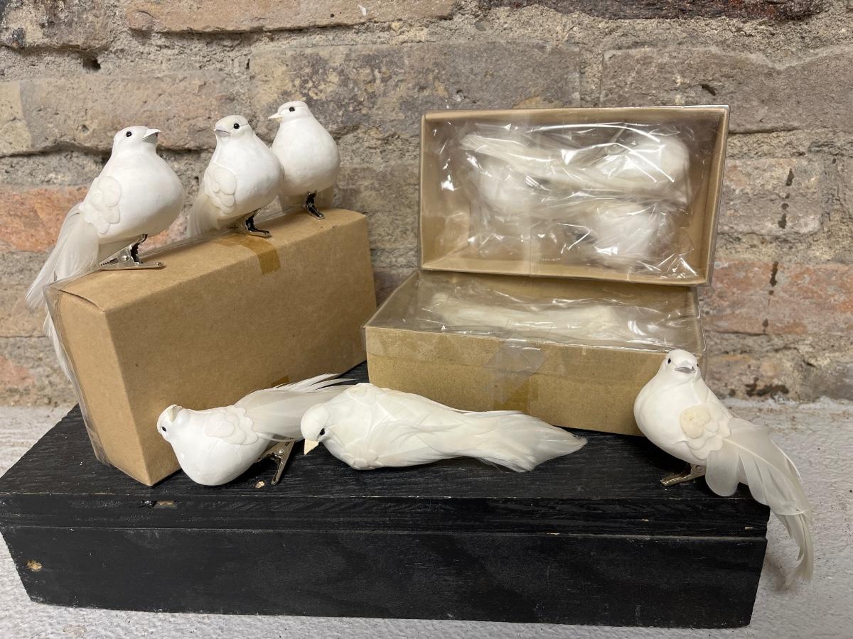 Set of three nesting trinket boxes, large porcelain trinket box, butterfly trivet, vintage water bottle with box, a dozen feather dove clips, and raffia & metal handled basket