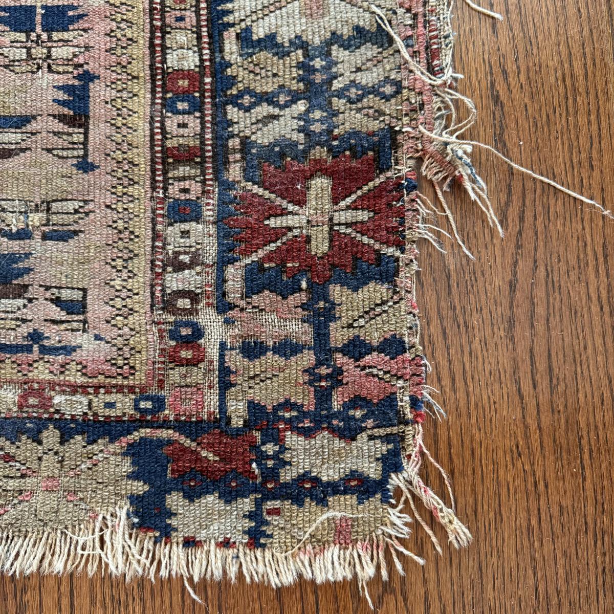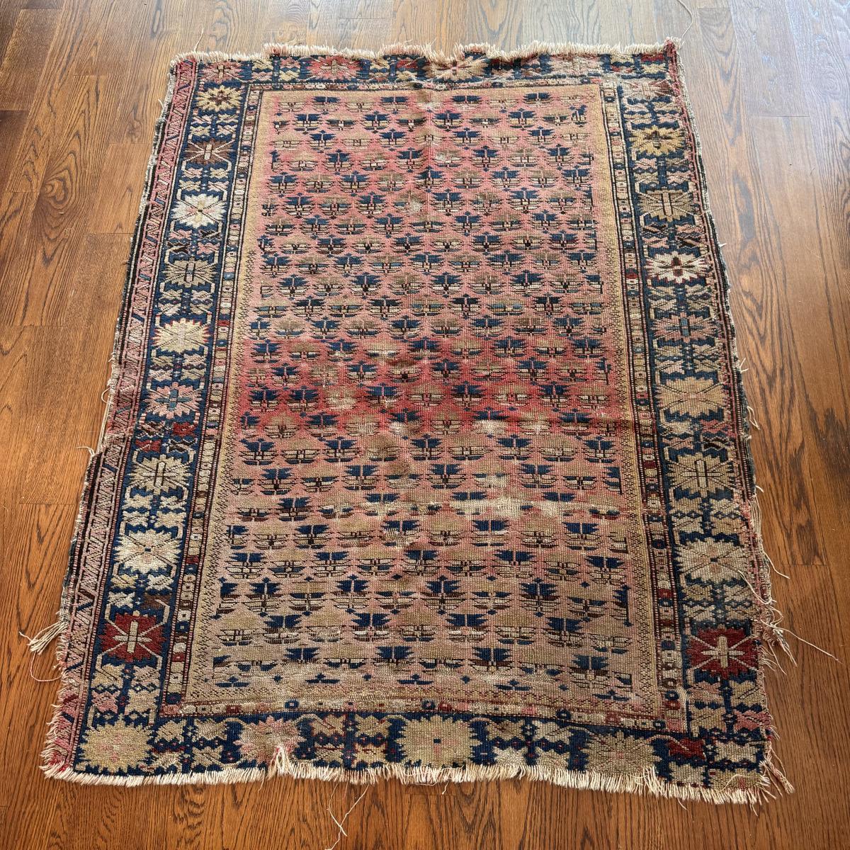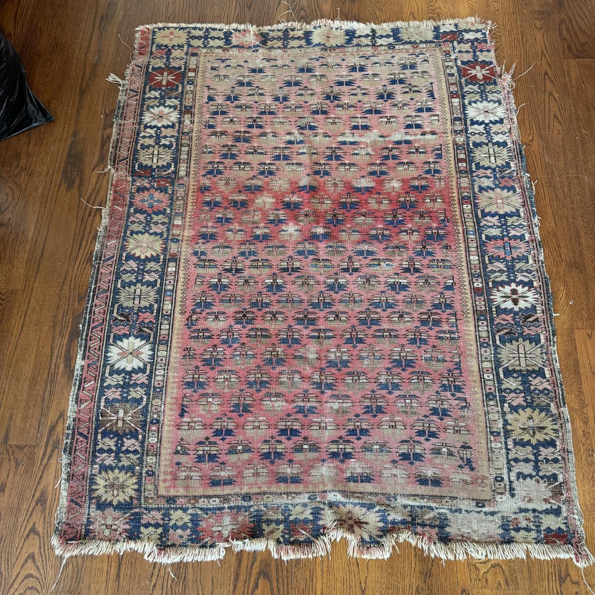 This lot includes one well-worn Persian style rug. The rug measures approximately 4' x 5'. There are several spots with wear and tear from age - see pictures included. Shipping available.
