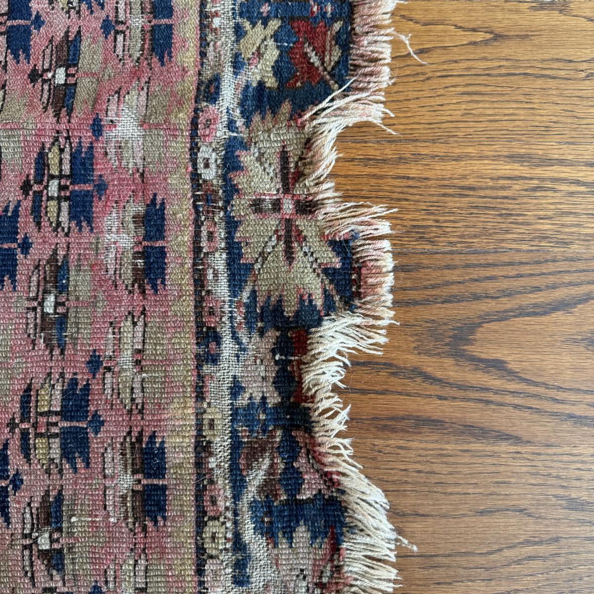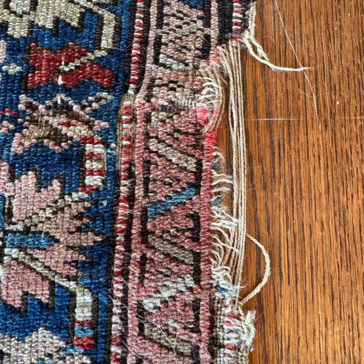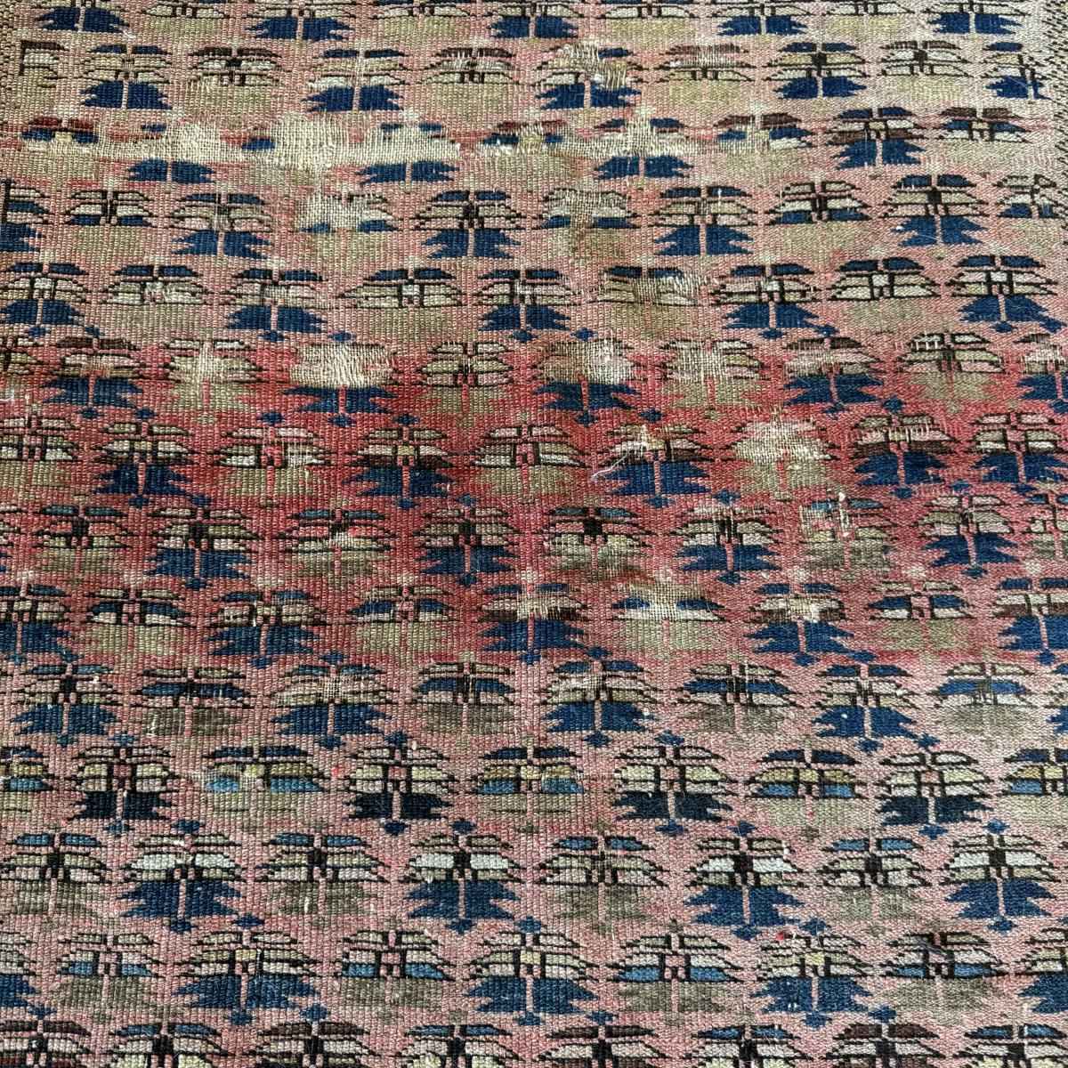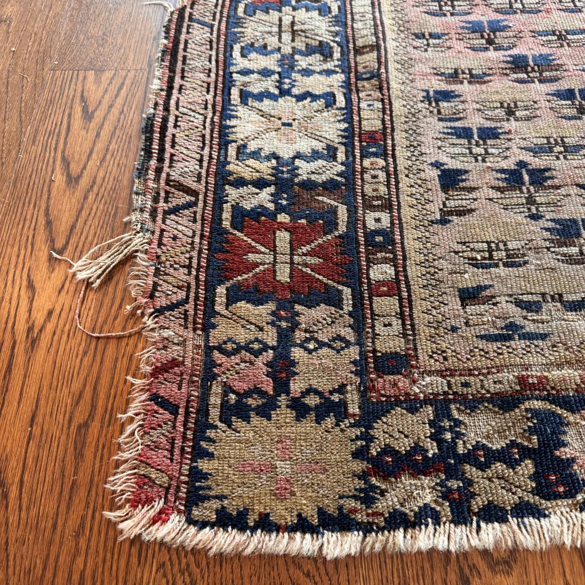 This lot includes one well-worn Persian style rug. The rug measures approximately 4' x 5'. There are several spots with wear and tear from age - see pictures included. Shipping available.