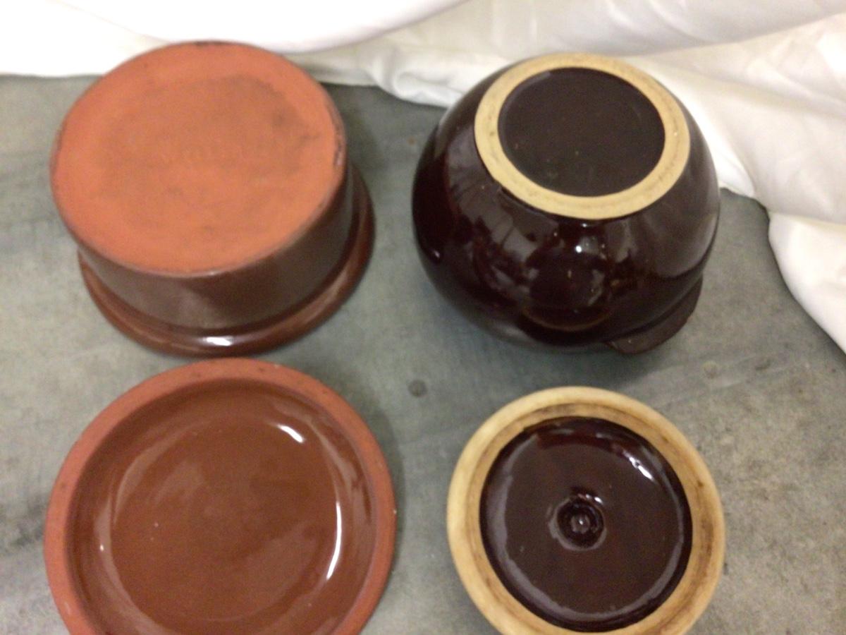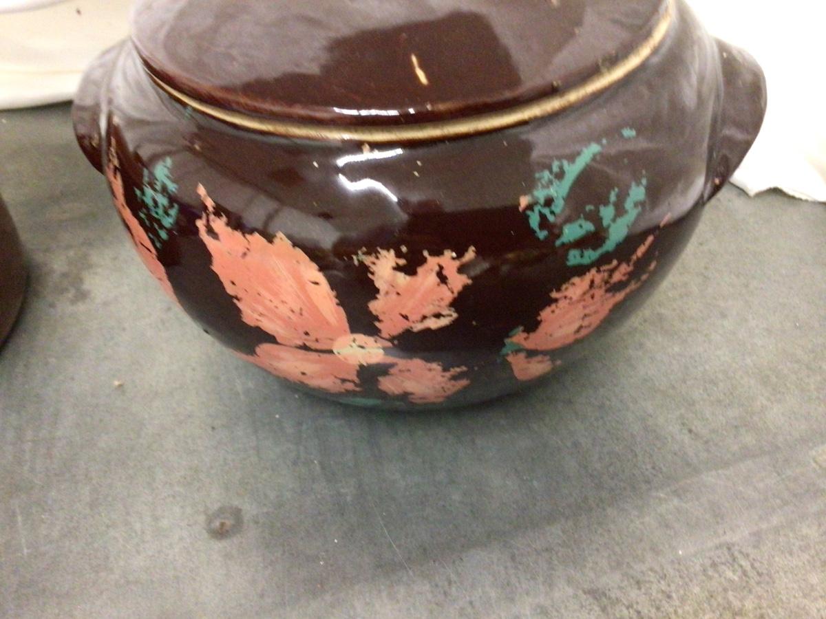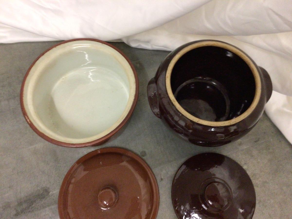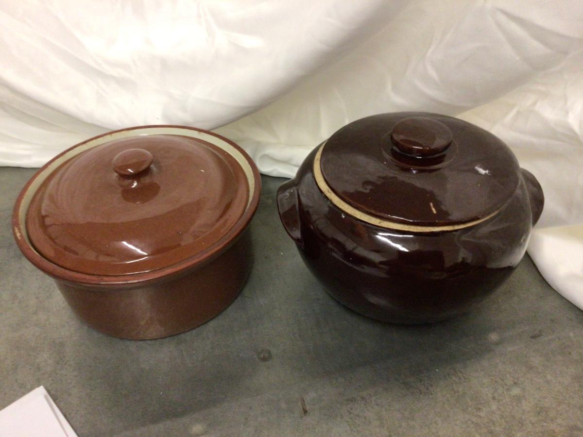 You get a Weller casserole covered dish and USA bean pot with painted flower. Both in good condition no cracks or chips.