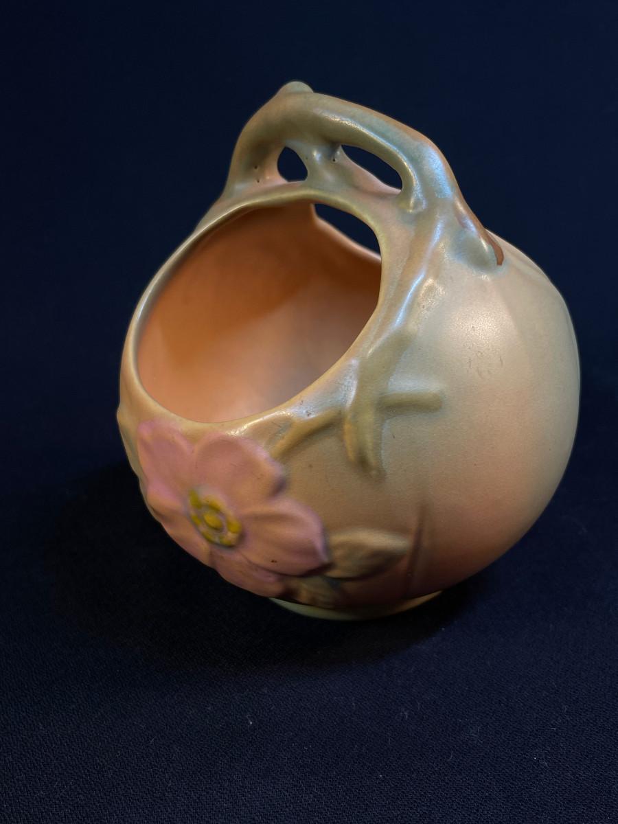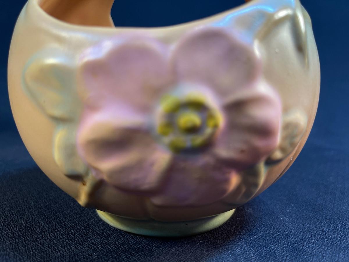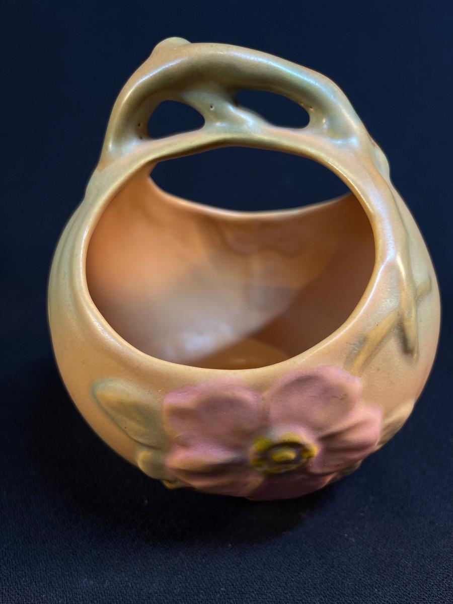 Weller Pottery Wild Rose Handled Basket with soft Arts Crafts glaze colors