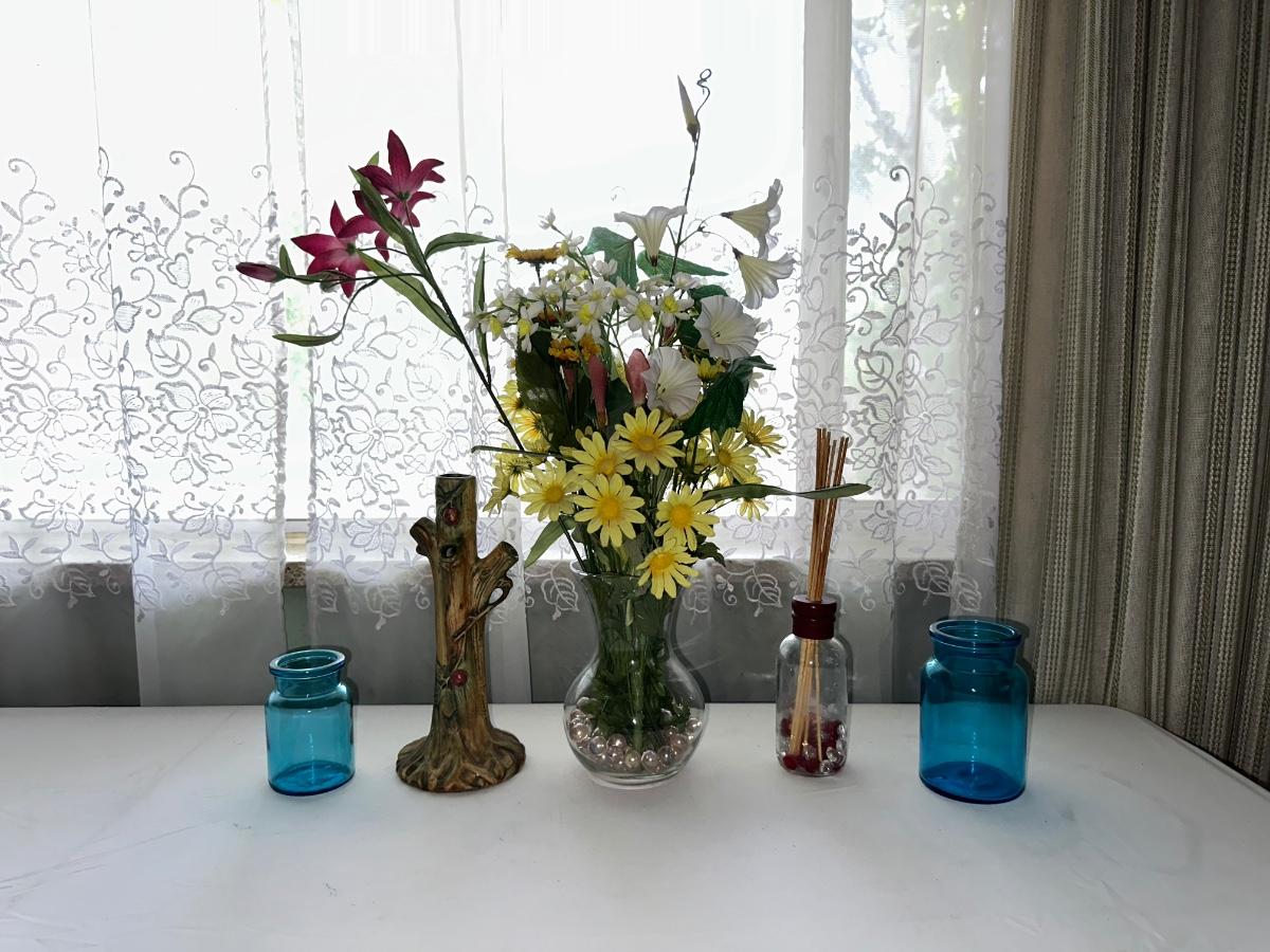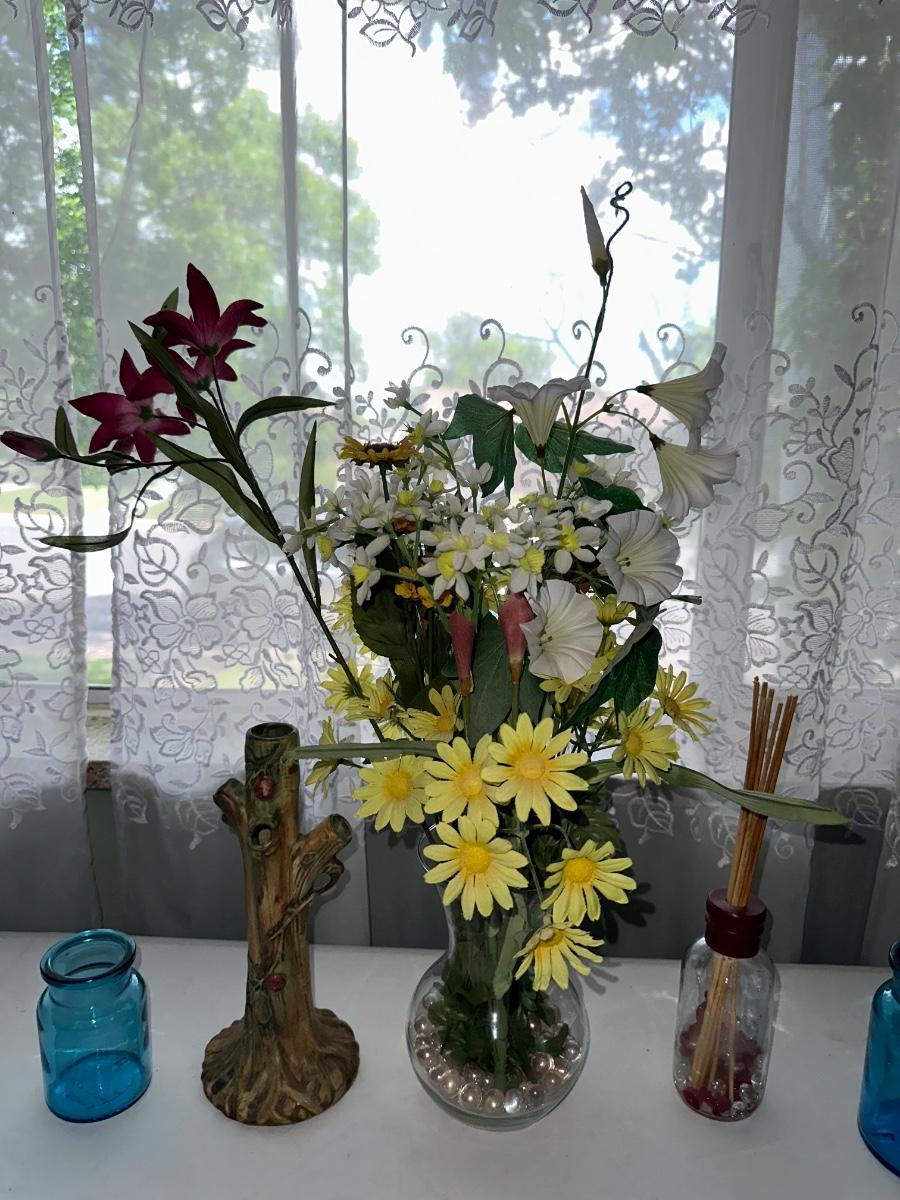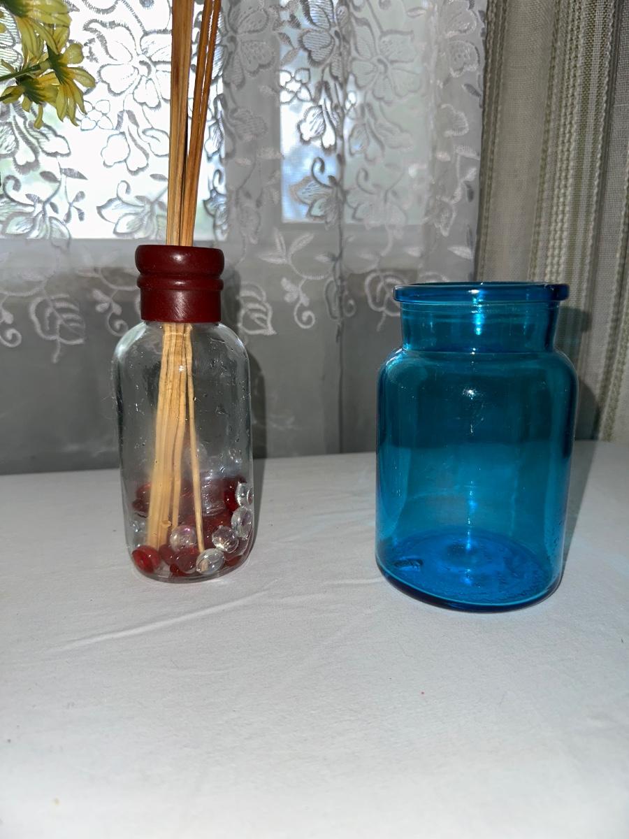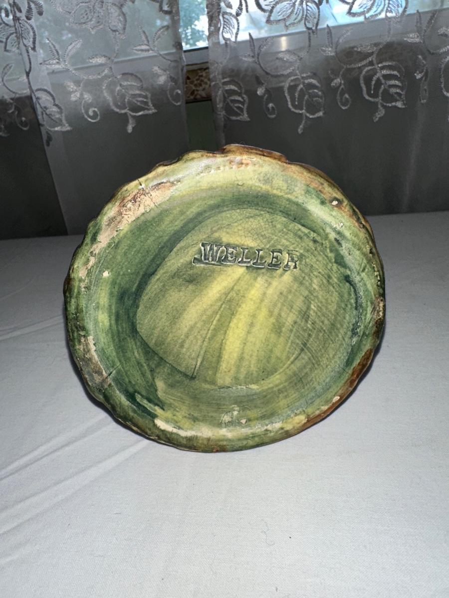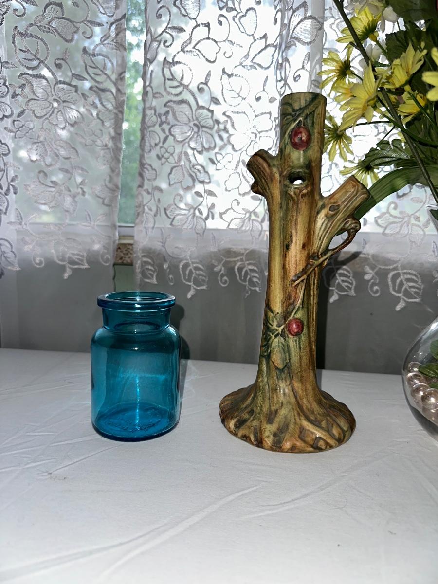 WELLER VASE, BLUE GLASS CONTAINERS AND MORE