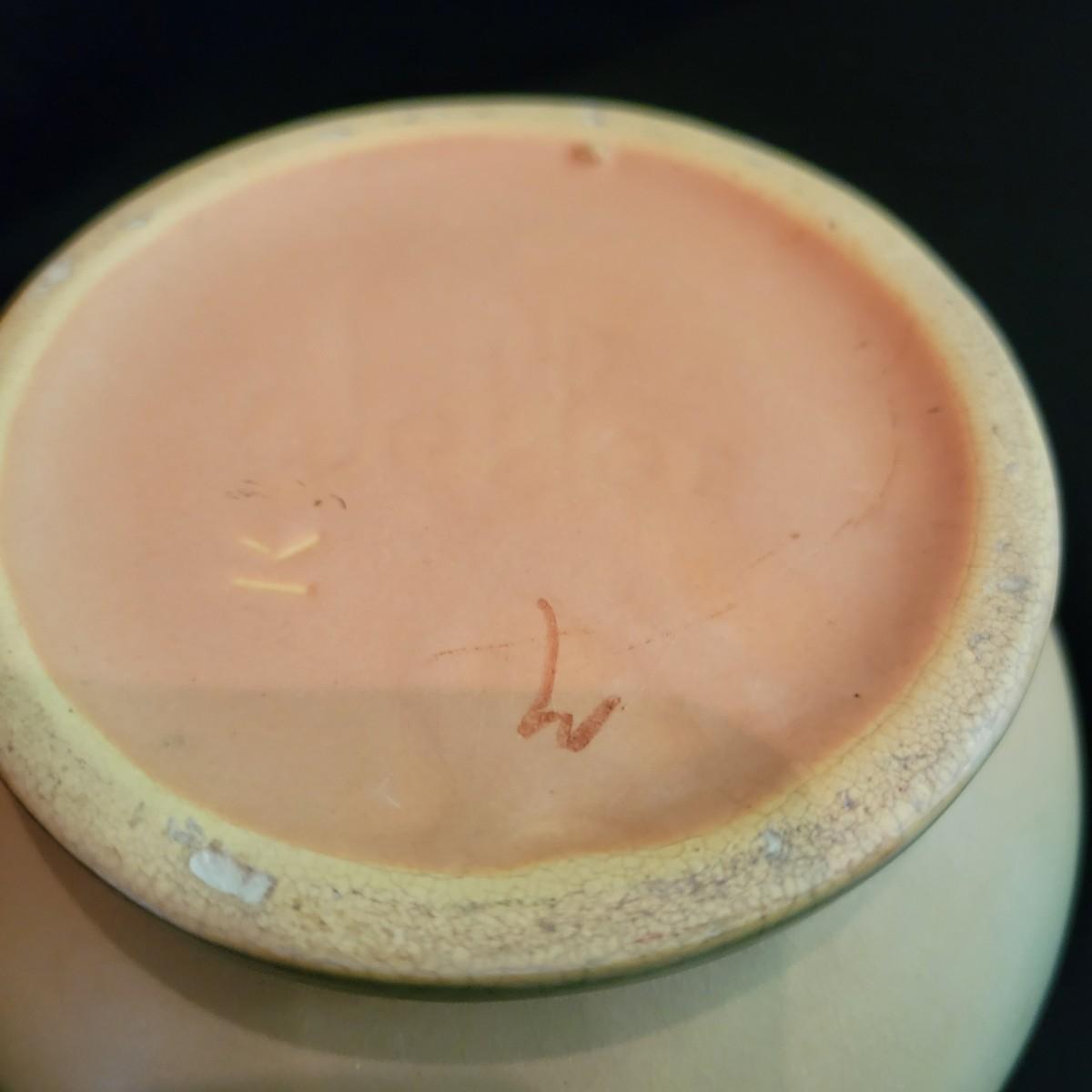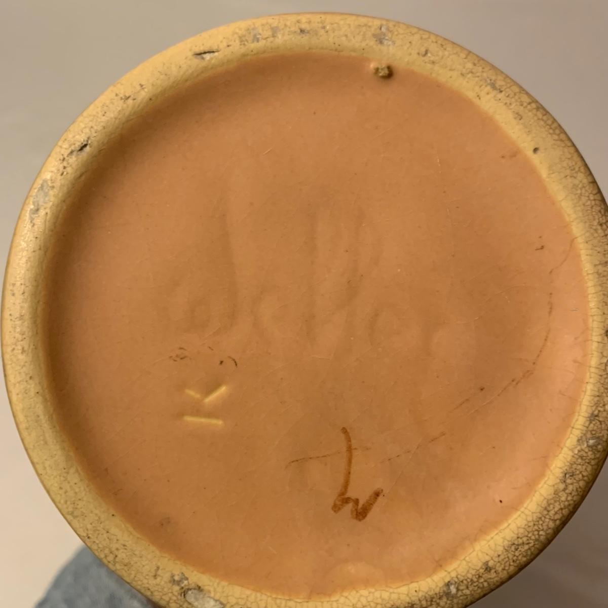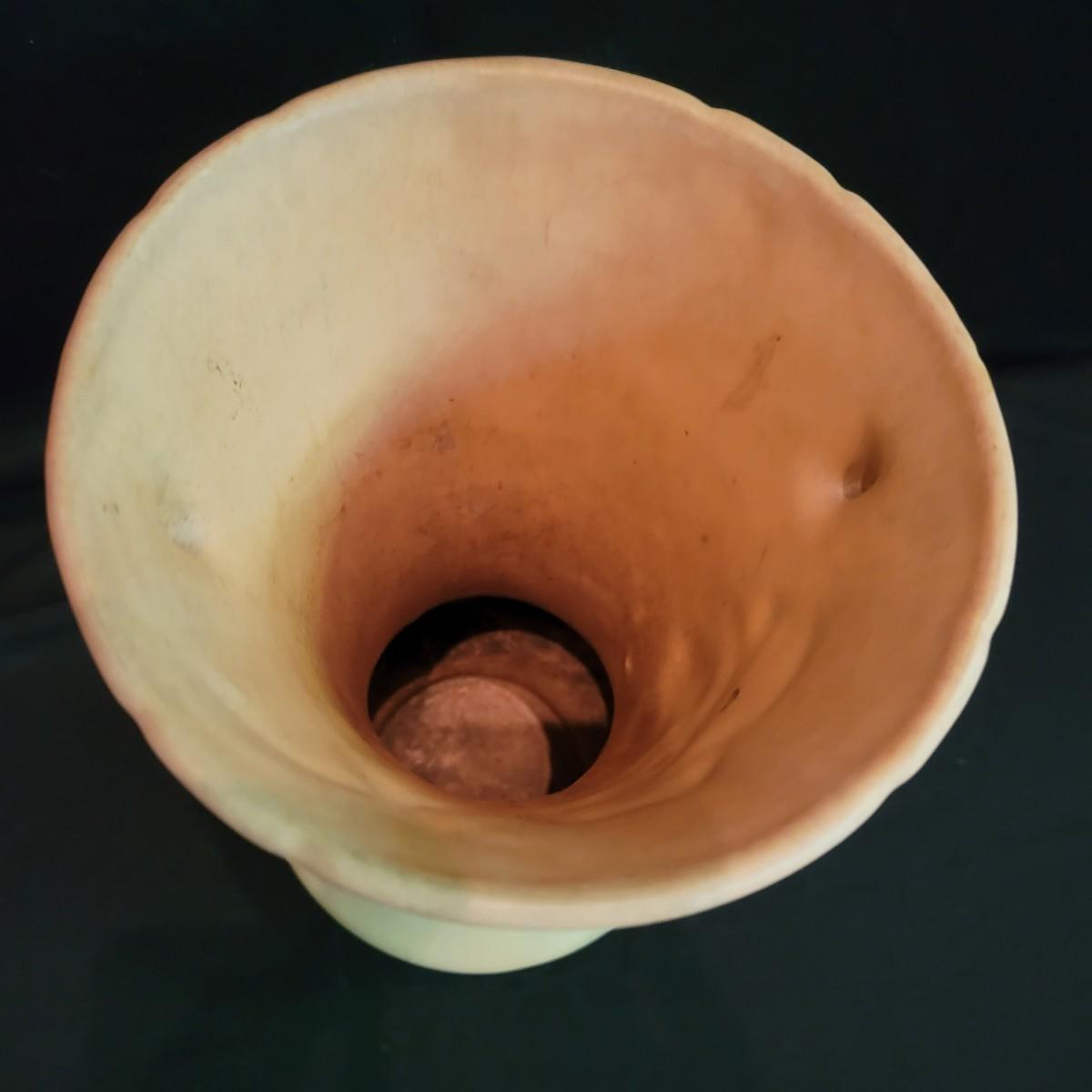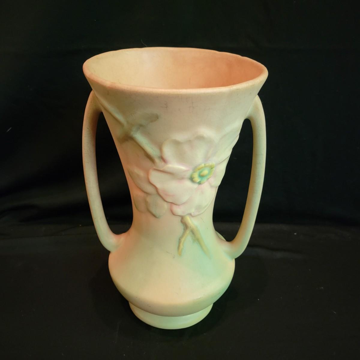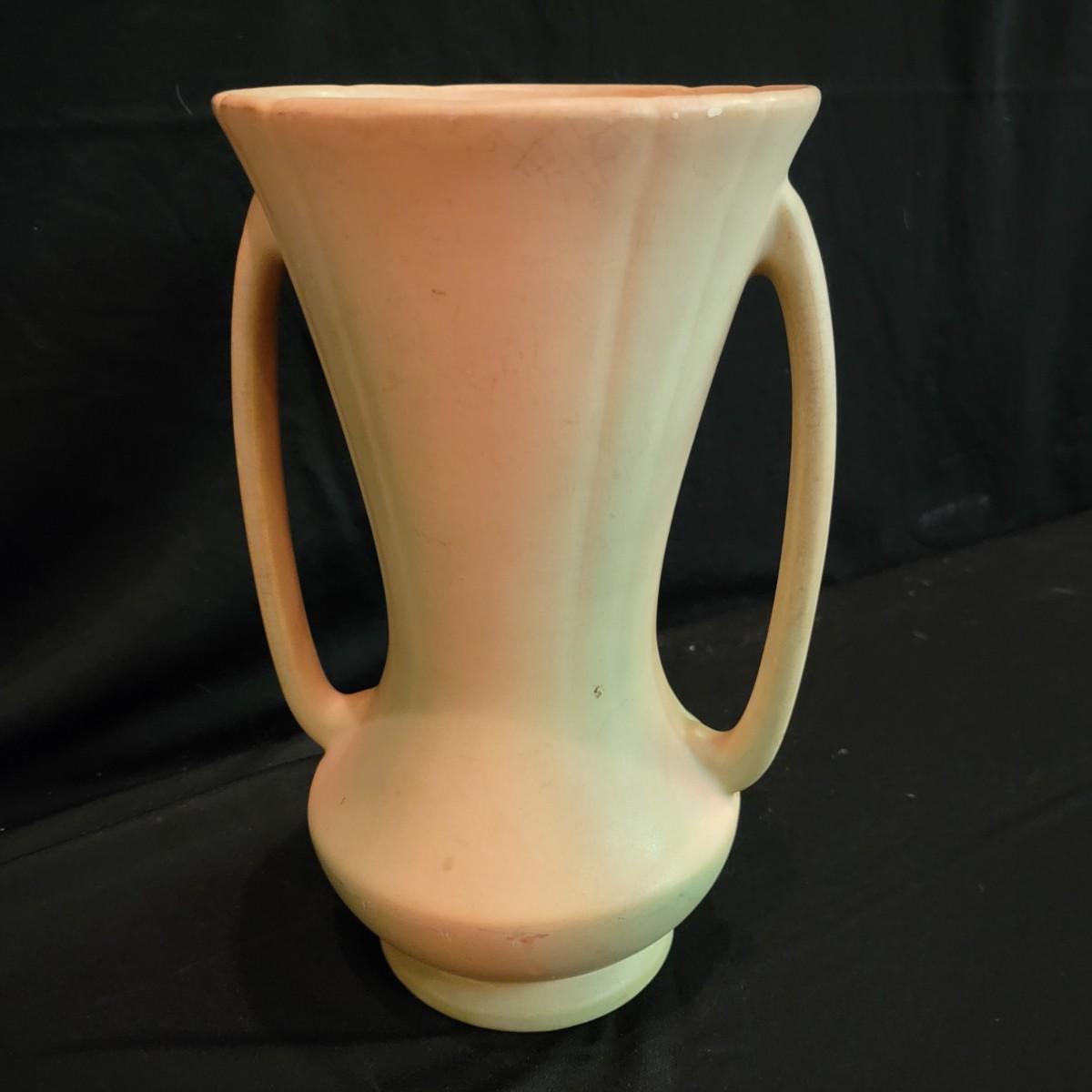 A vintage wild rose peach vase with two handles, signed “˜Weller’. This piece is a very smooth feeling ceramic vase that measures approximately 6.5"D x 9.5"H. Shipping available. Shipping can be costly. We suggest contacting our preferred local shipping provider, Postage Express, with dimensions and getting an estimate before bidding: (828) 670-5501 or postageexpress@yahoo.com.