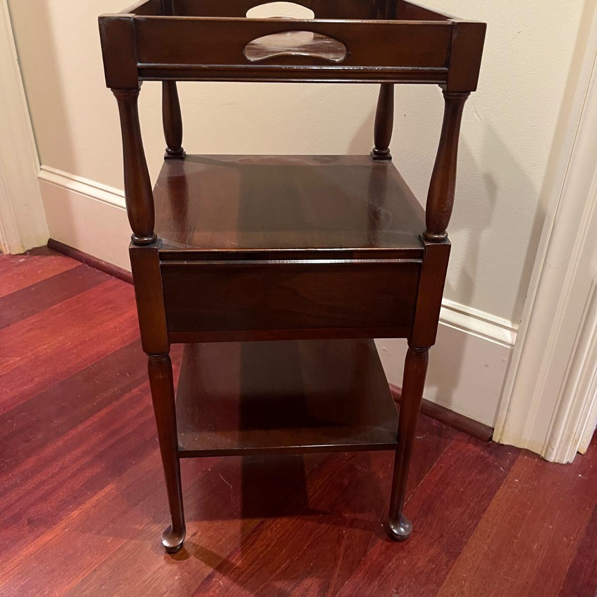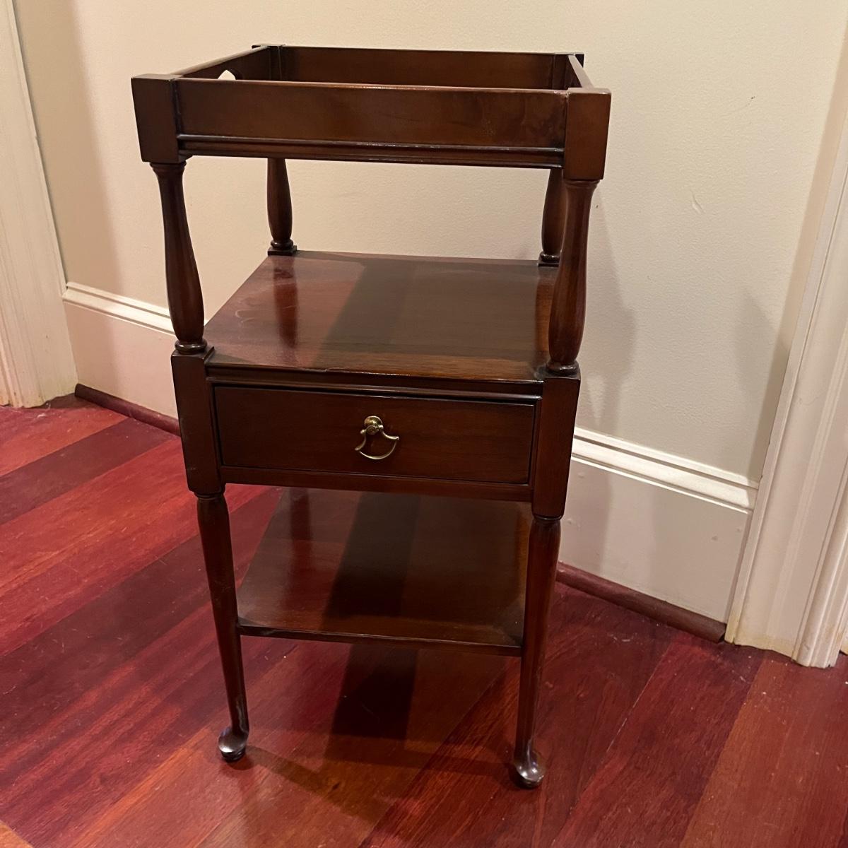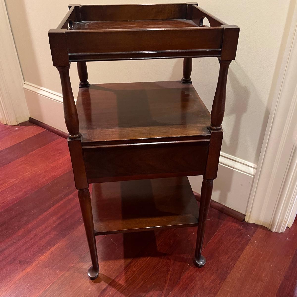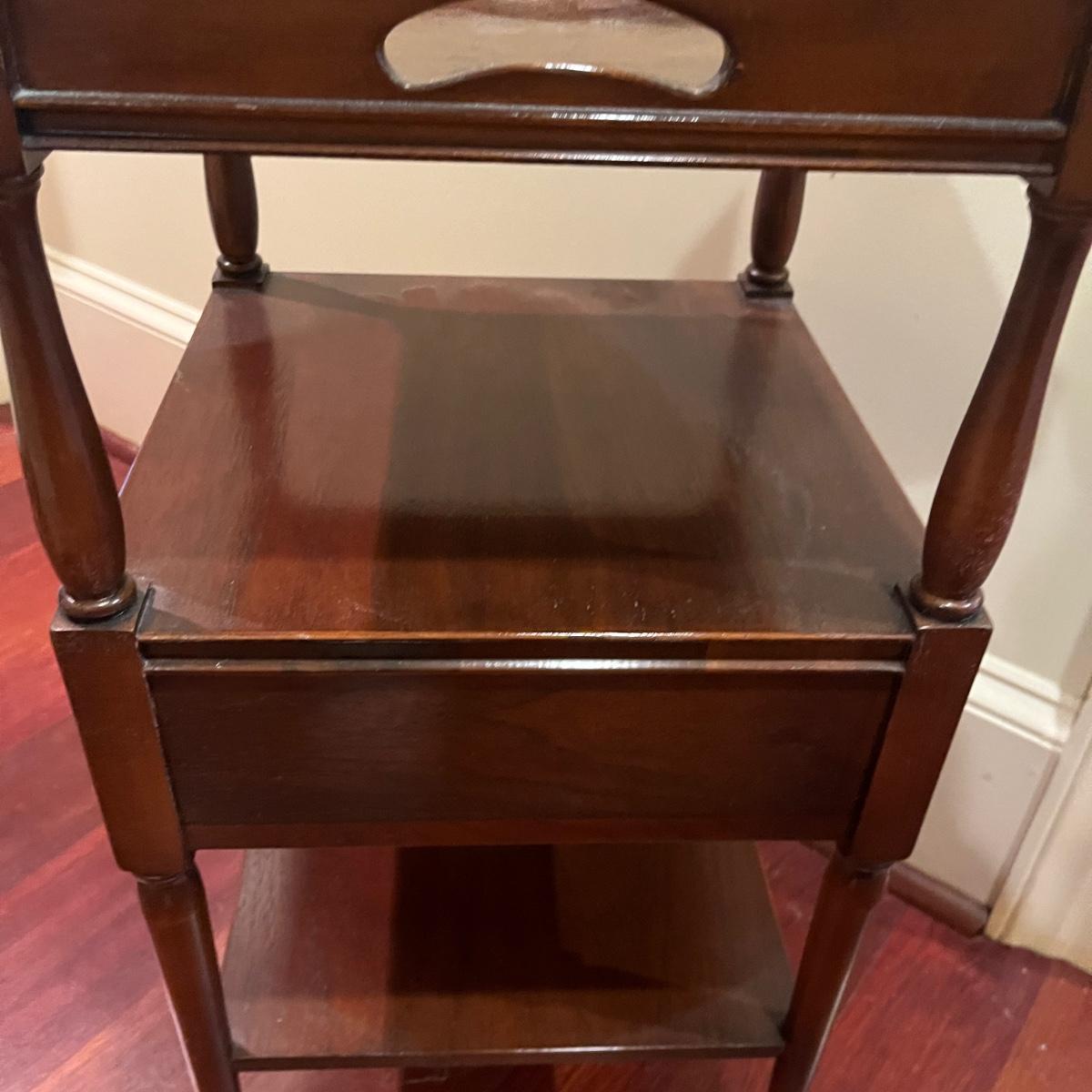 This Wellington Hall side has one dovetailed drawer and two shelves. Table measures 13” x 13” x 26”H.