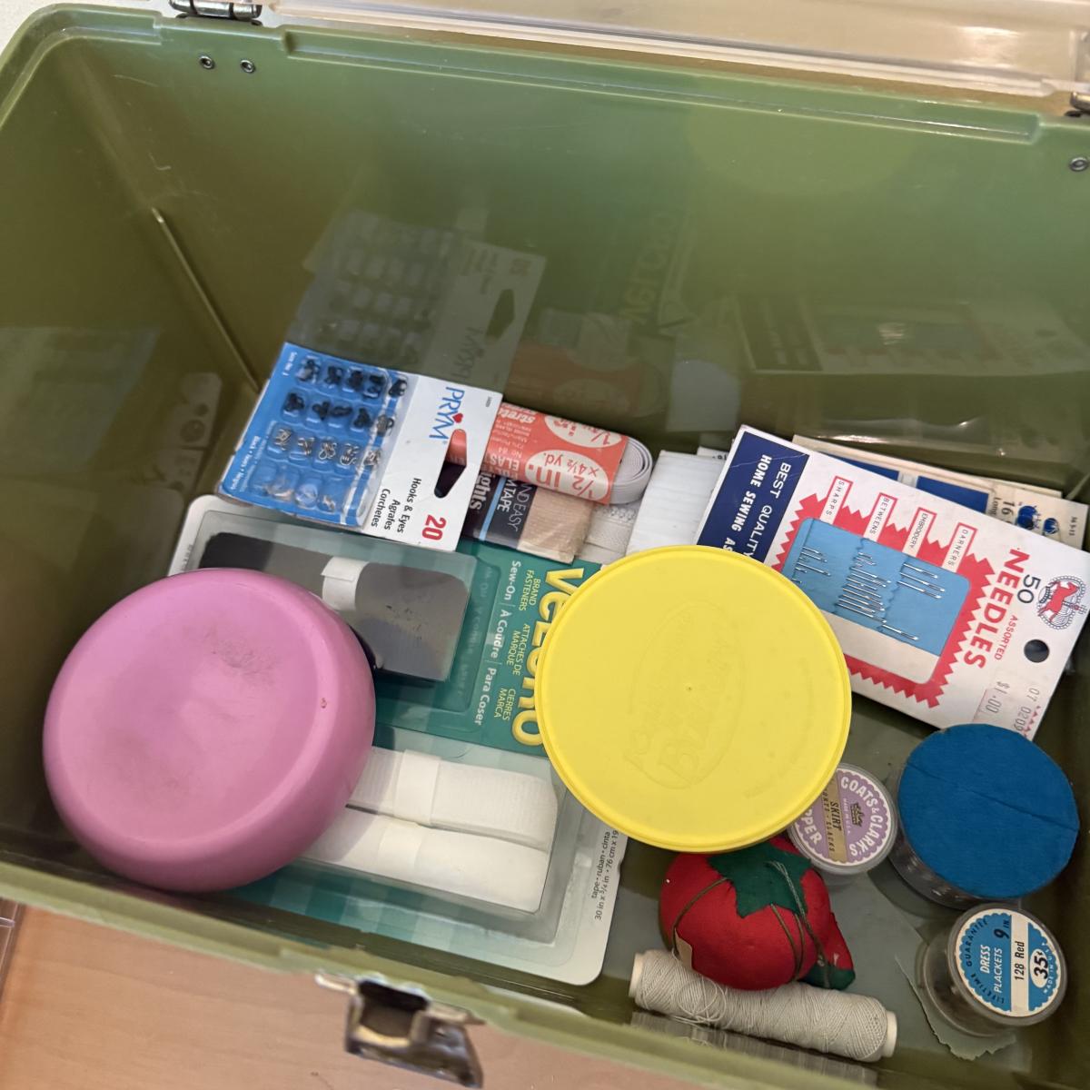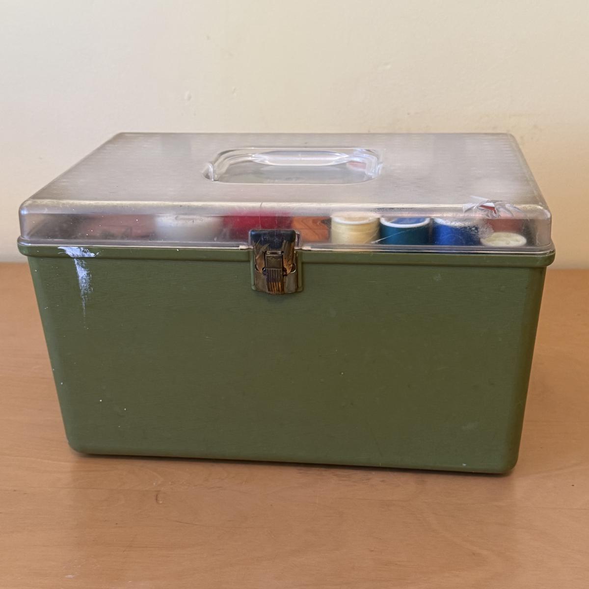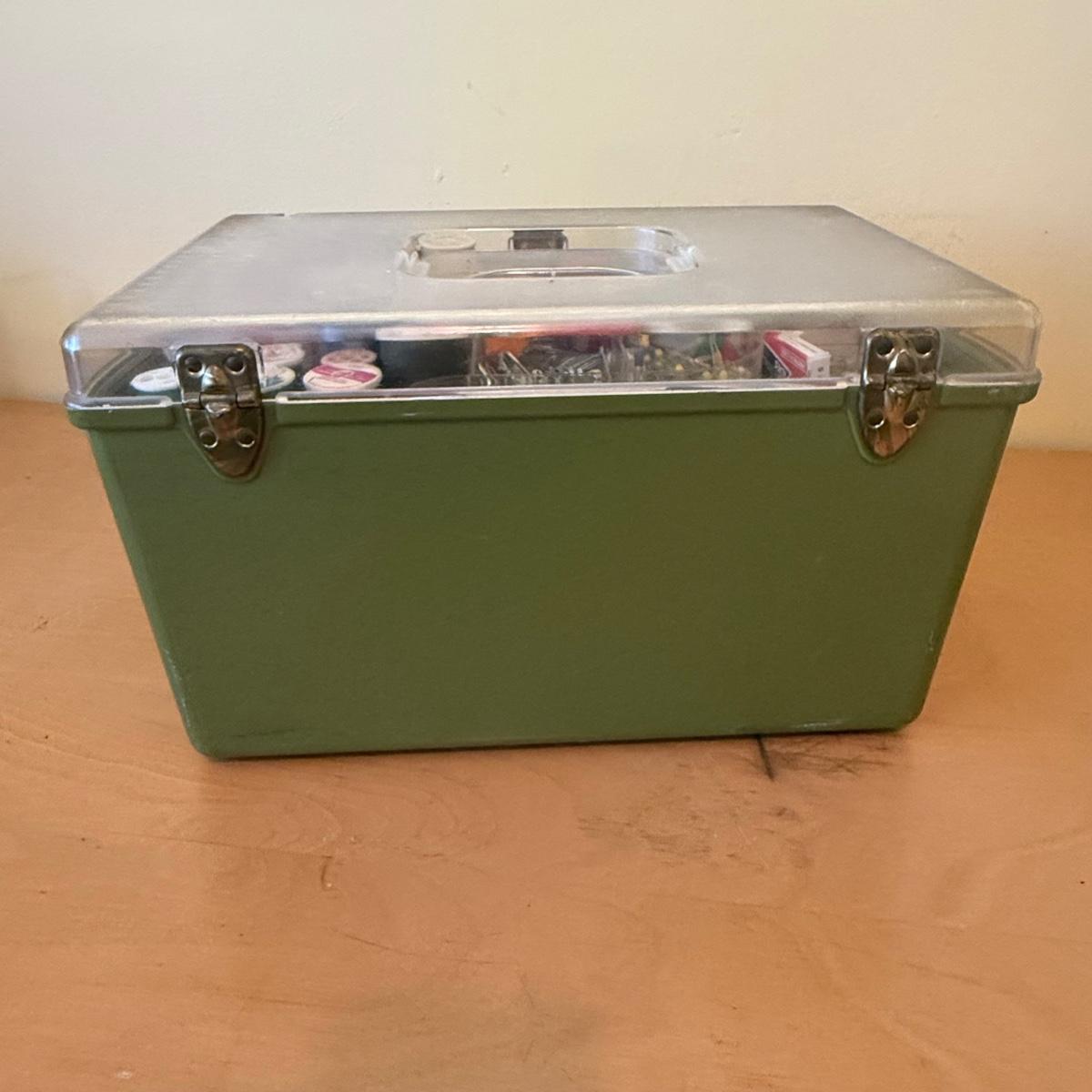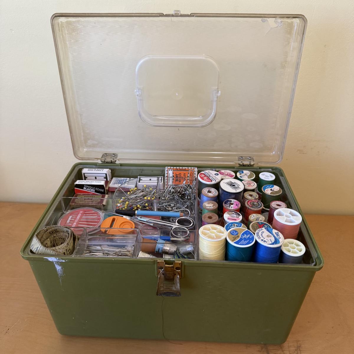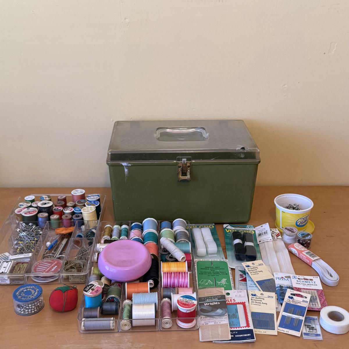 Green and clear plastic sewing kit is well stocked with 70+ rolls of thread, a variety of sewing machine and sewing needles, thimbles (one is glass), safety pins, and other sewing accessories. Please see photos for inventory. The kit measures 14“ x 9“ x 8.5“H. There is some damage to the kit, see photos.