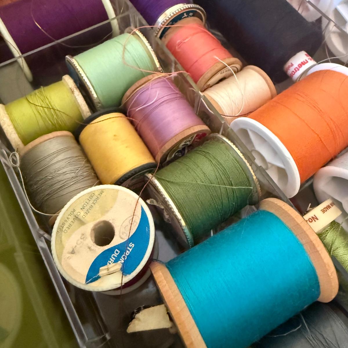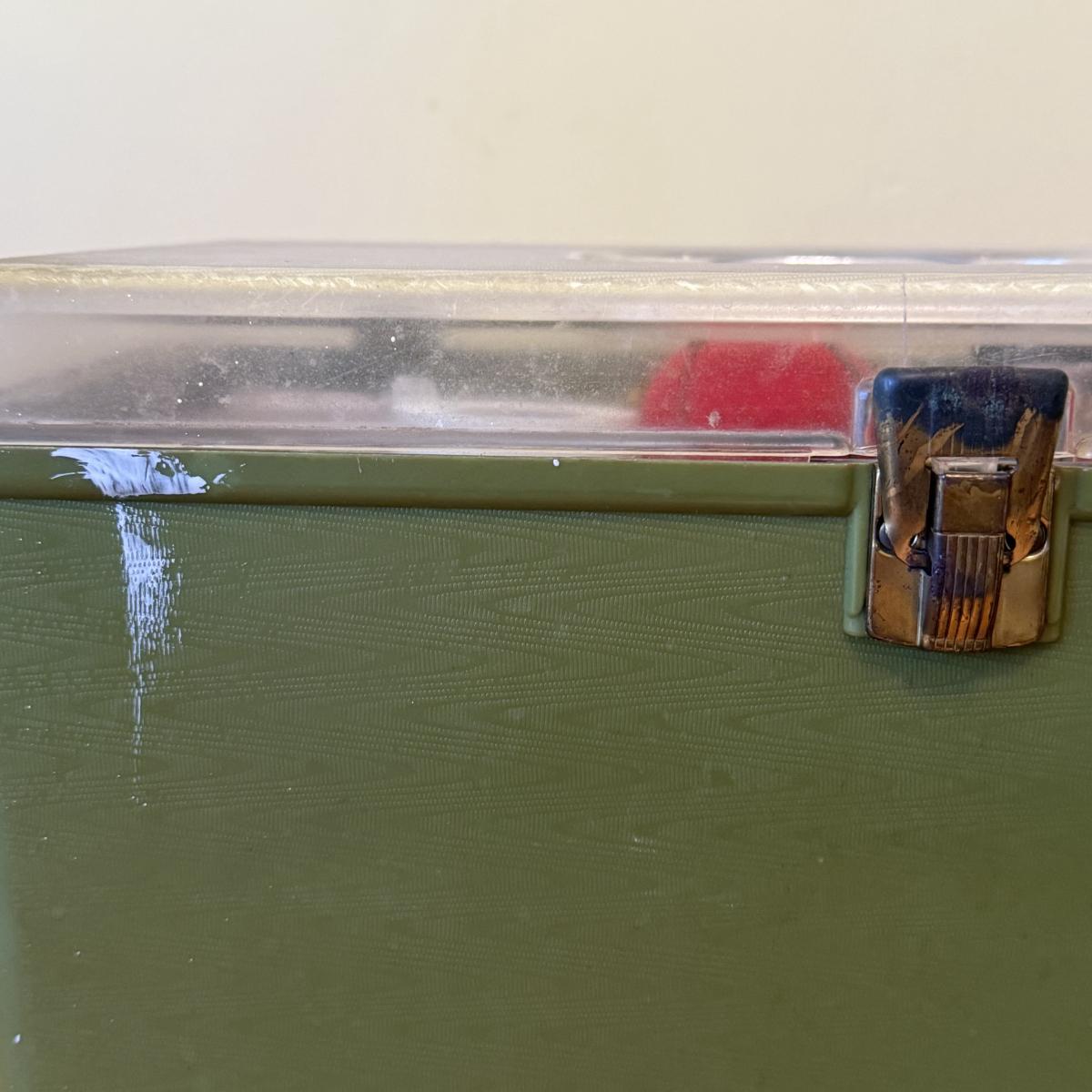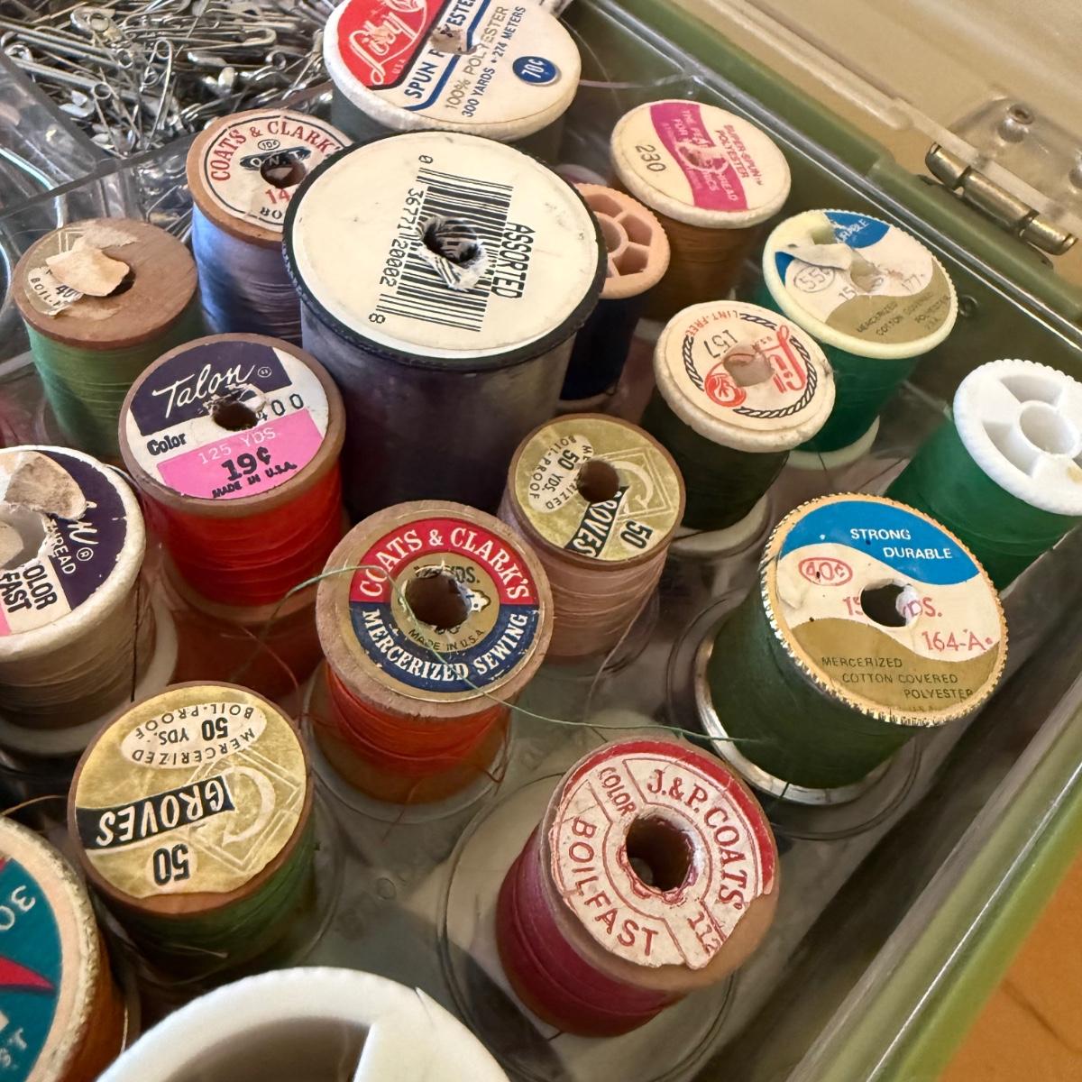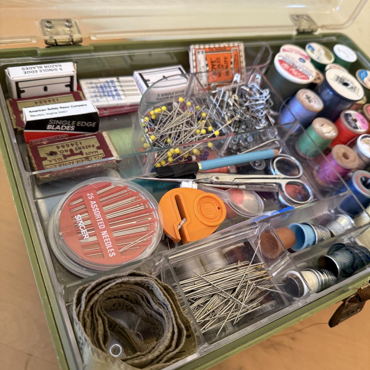 Green and clear plastic sewing kit is well stocked with 70+ rolls of thread, a variety of sewing machine and sewing needles, thimbles (one is glass), safety pins, and other sewing accessories. Please see photos for inventory. The kit measures 14“ x 9“ x 8.5“H. There is some damage to the kit, see photos.
