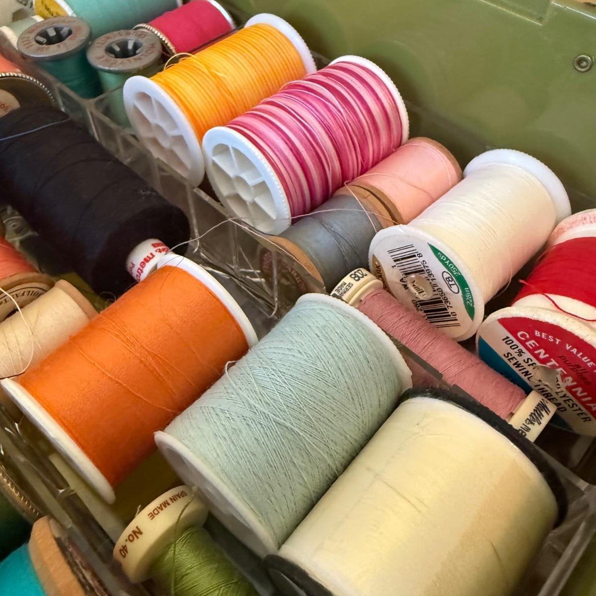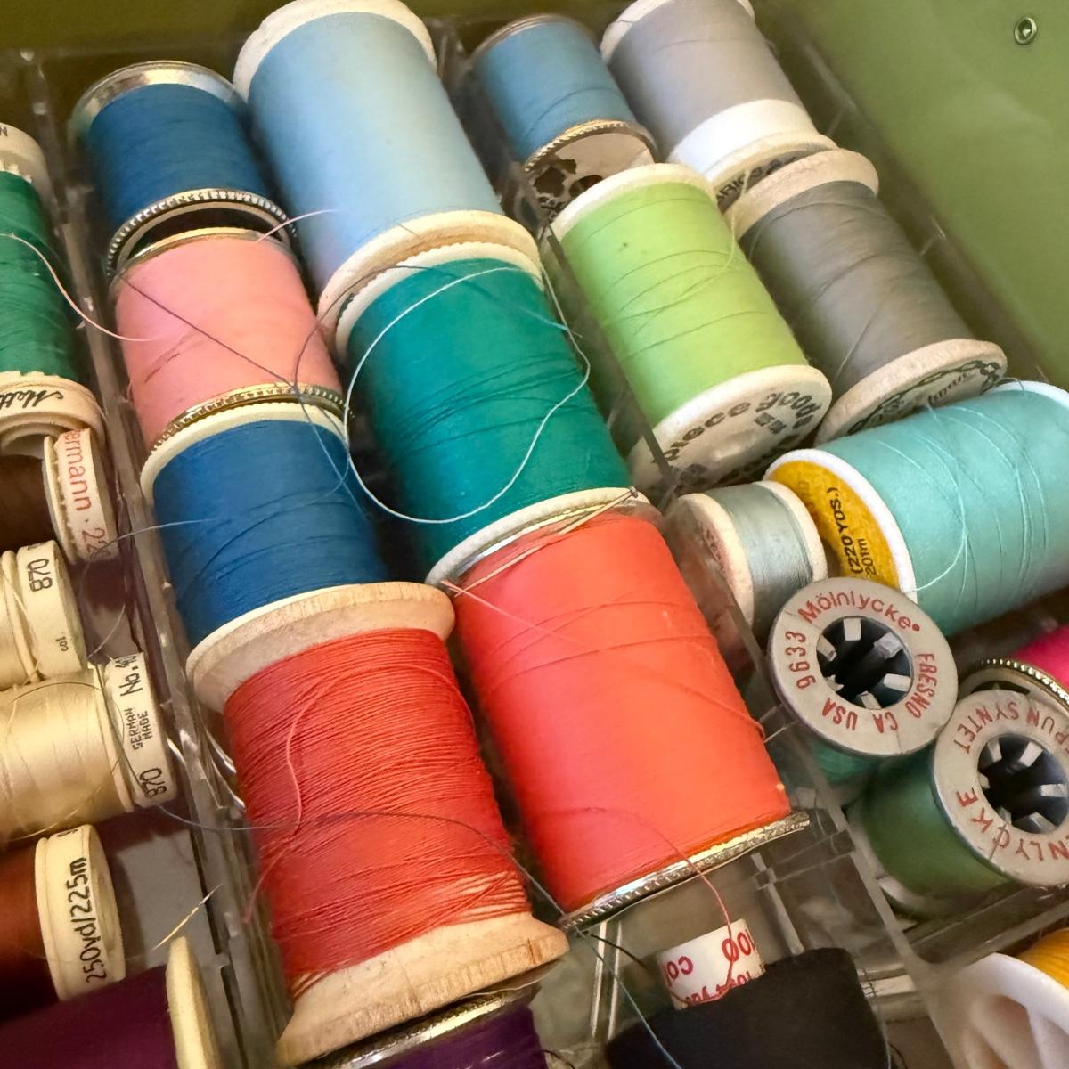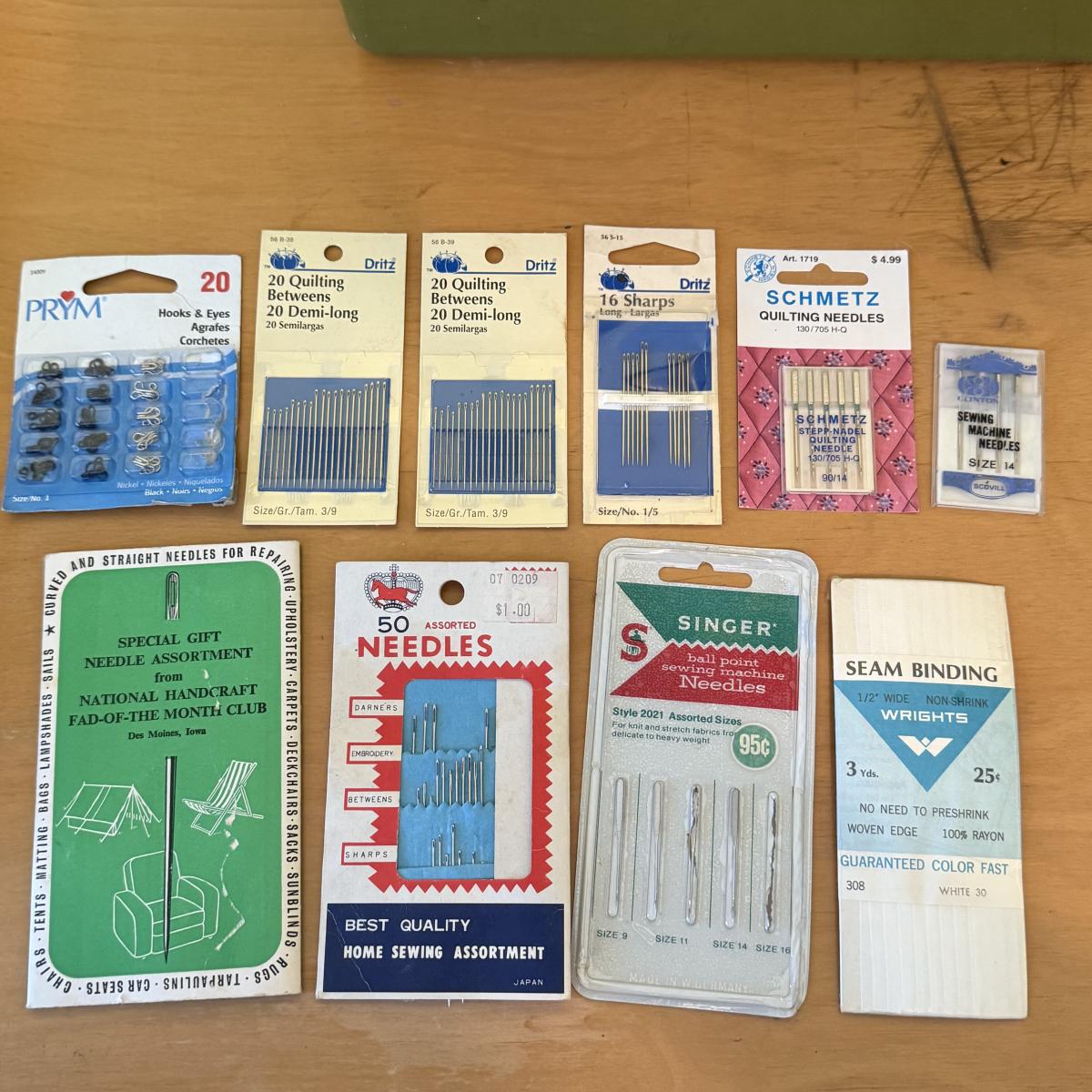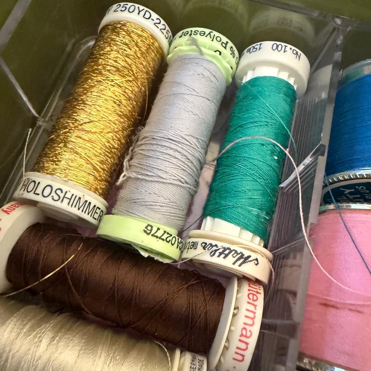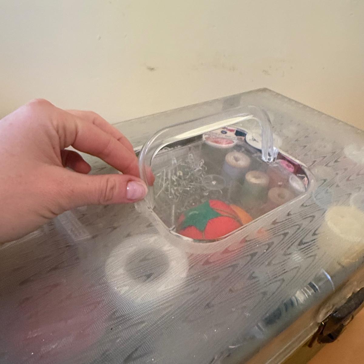 Green and clear plastic sewing kit is well stocked with 70+ rolls of thread, a variety of sewing machine and sewing needles, thimbles (one is glass), safety pins, and other sewing accessories. Please see photos for inventory. The kit measures 14“ x 9“ x 8.5“H. There is some damage to the kit, see photos.