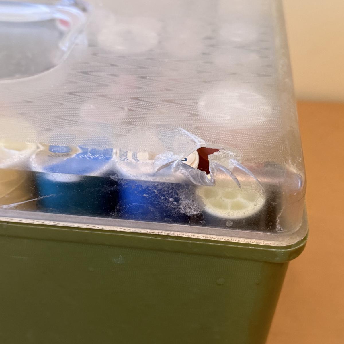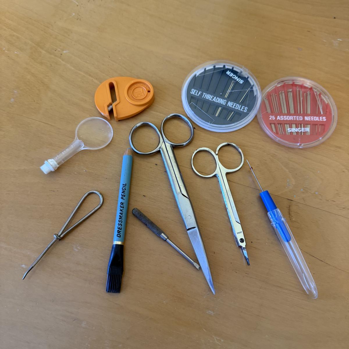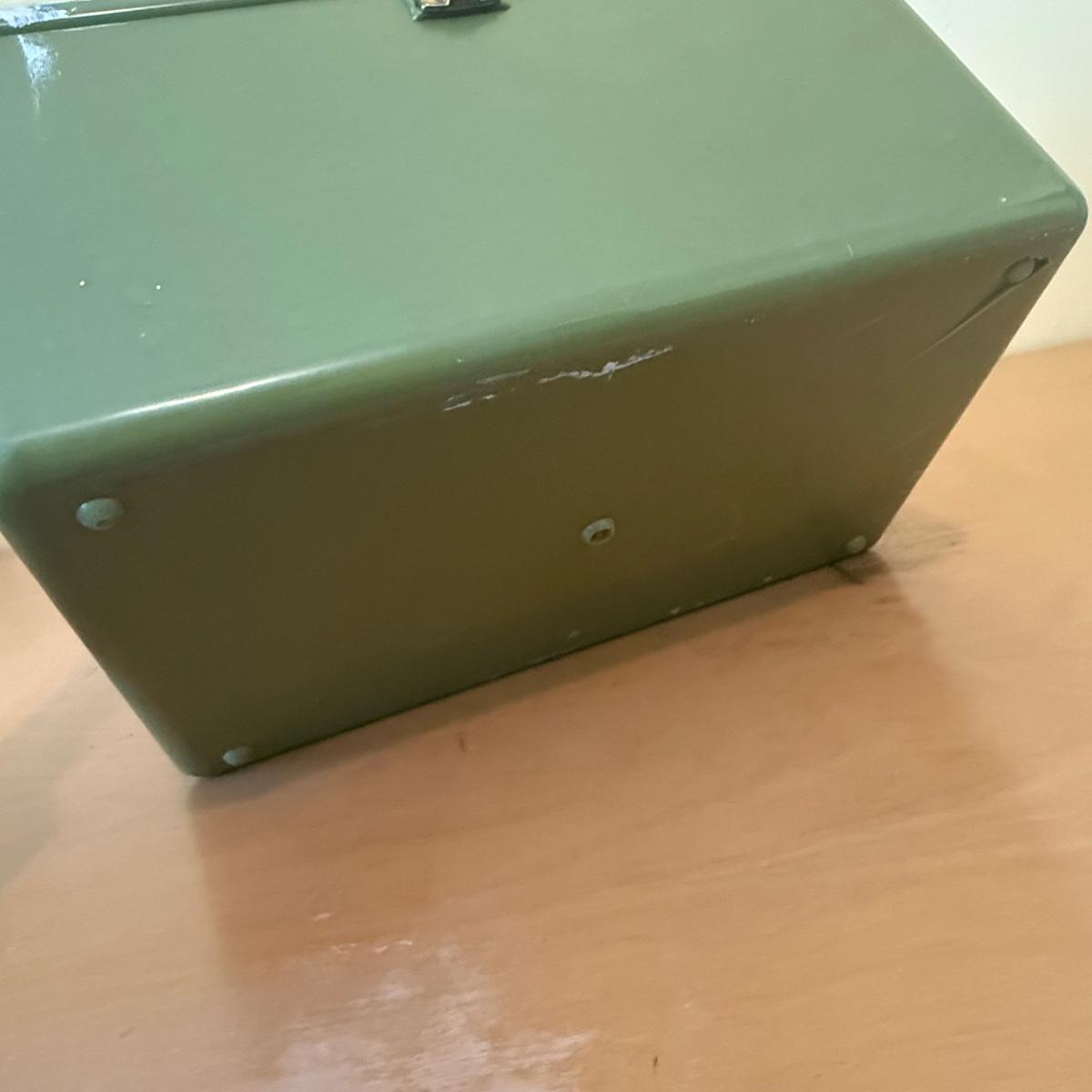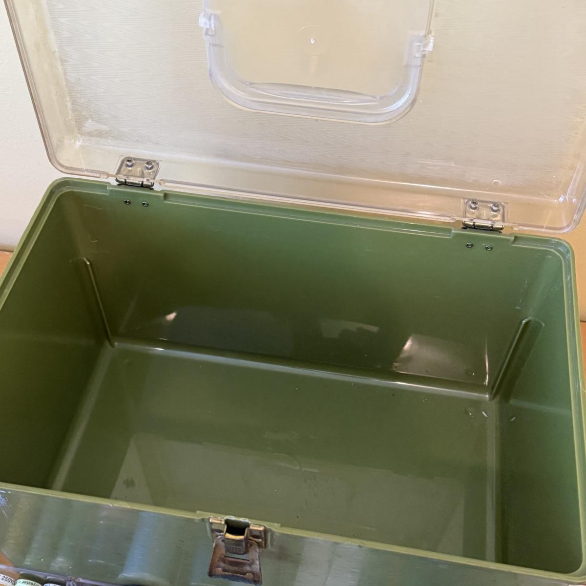Green and clear plastic sewing kit is well stocked with 70+ rolls of thread, a variety of sewing machine and sewing needles, thimbles (one is glass), safety pins, and other sewing accessories. Please see photos for inventory. The kit measures 14“ x 9“ x 8.5“H. There is some damage to the kit, see photos.
