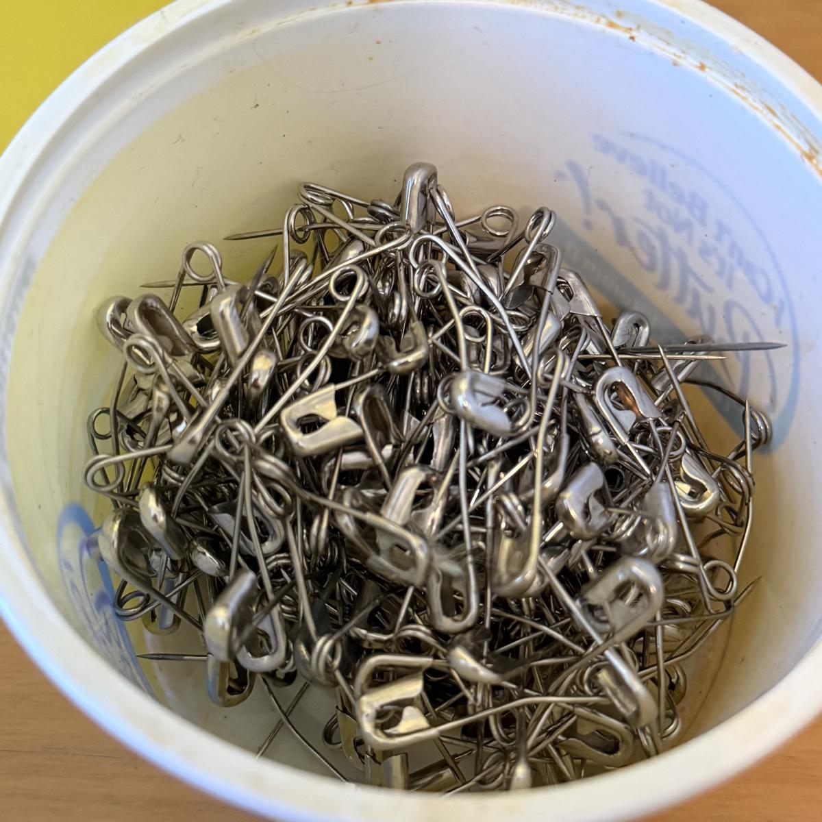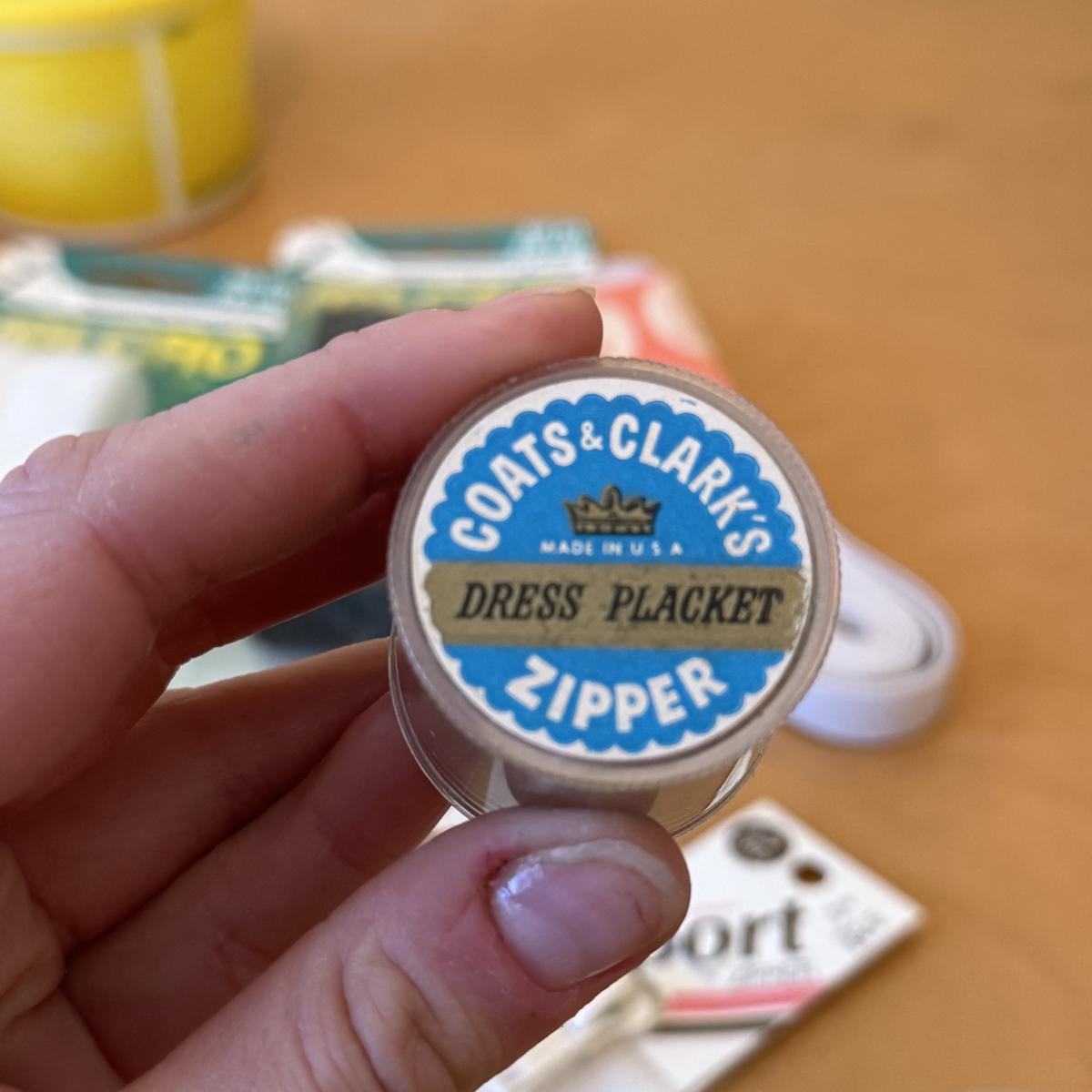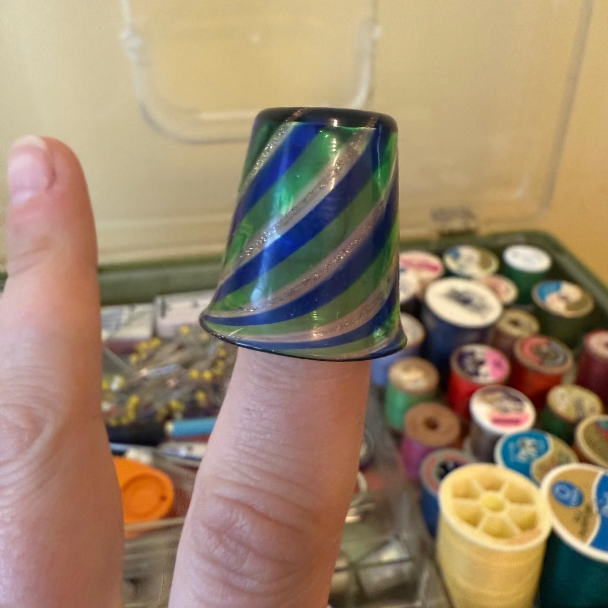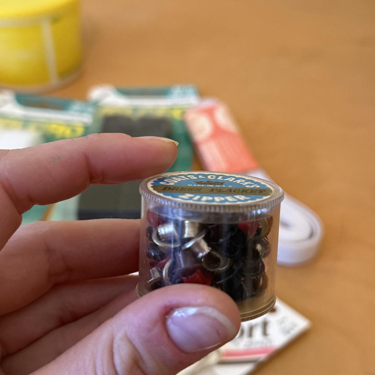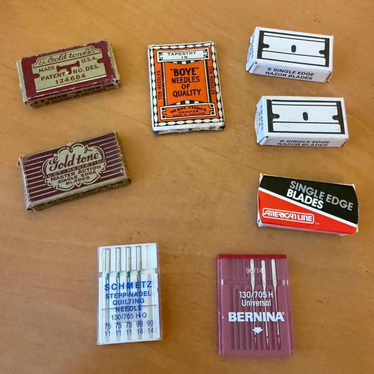 Green and clear plastic sewing kit is well stocked with 70+ rolls of thread, a variety of sewing machine and sewing needles, thimbles (one is glass), safety pins, and other sewing accessories. Please see photos for inventory. The kit measures 14“ x 9“ x 8.5“H. There is some damage to the kit, see photos.