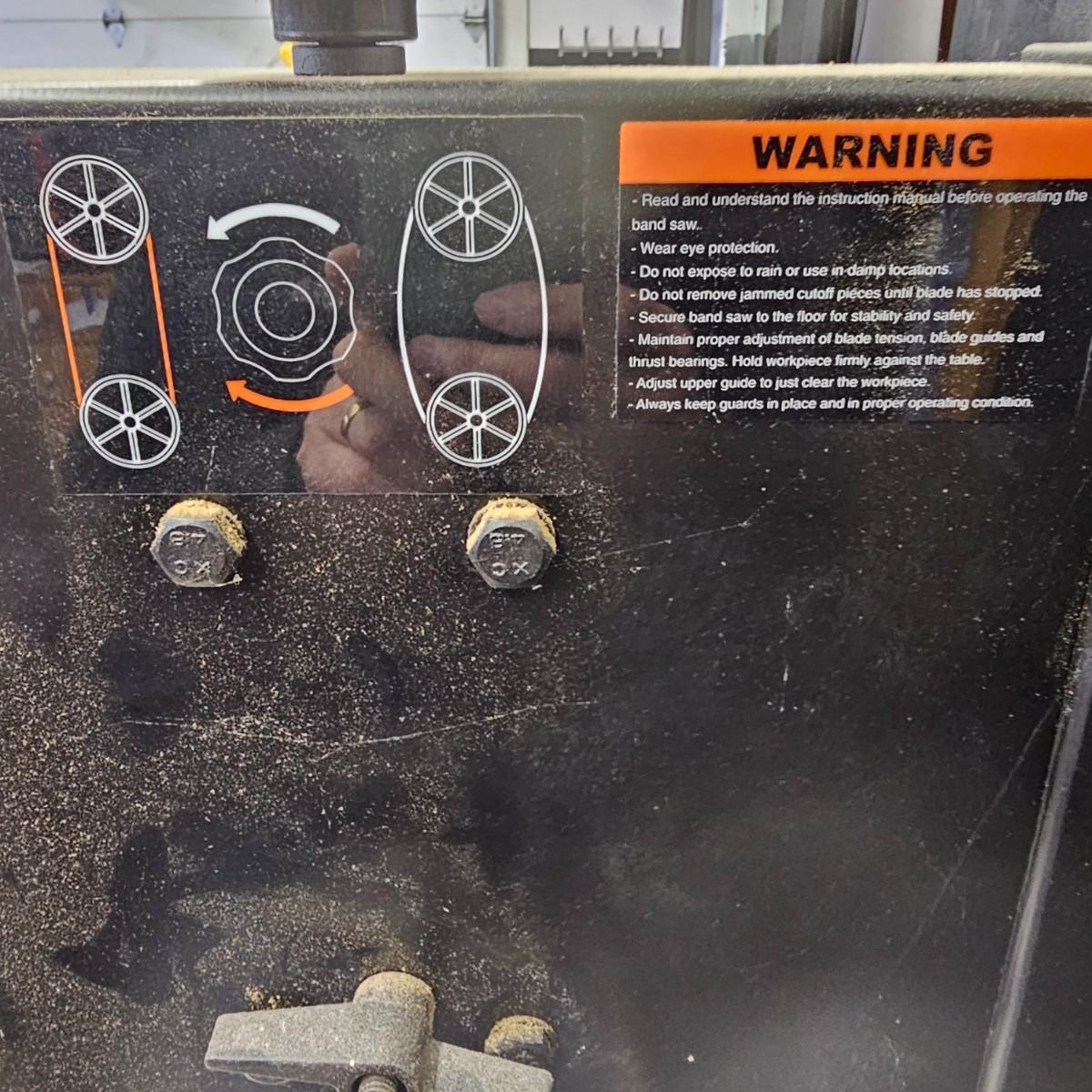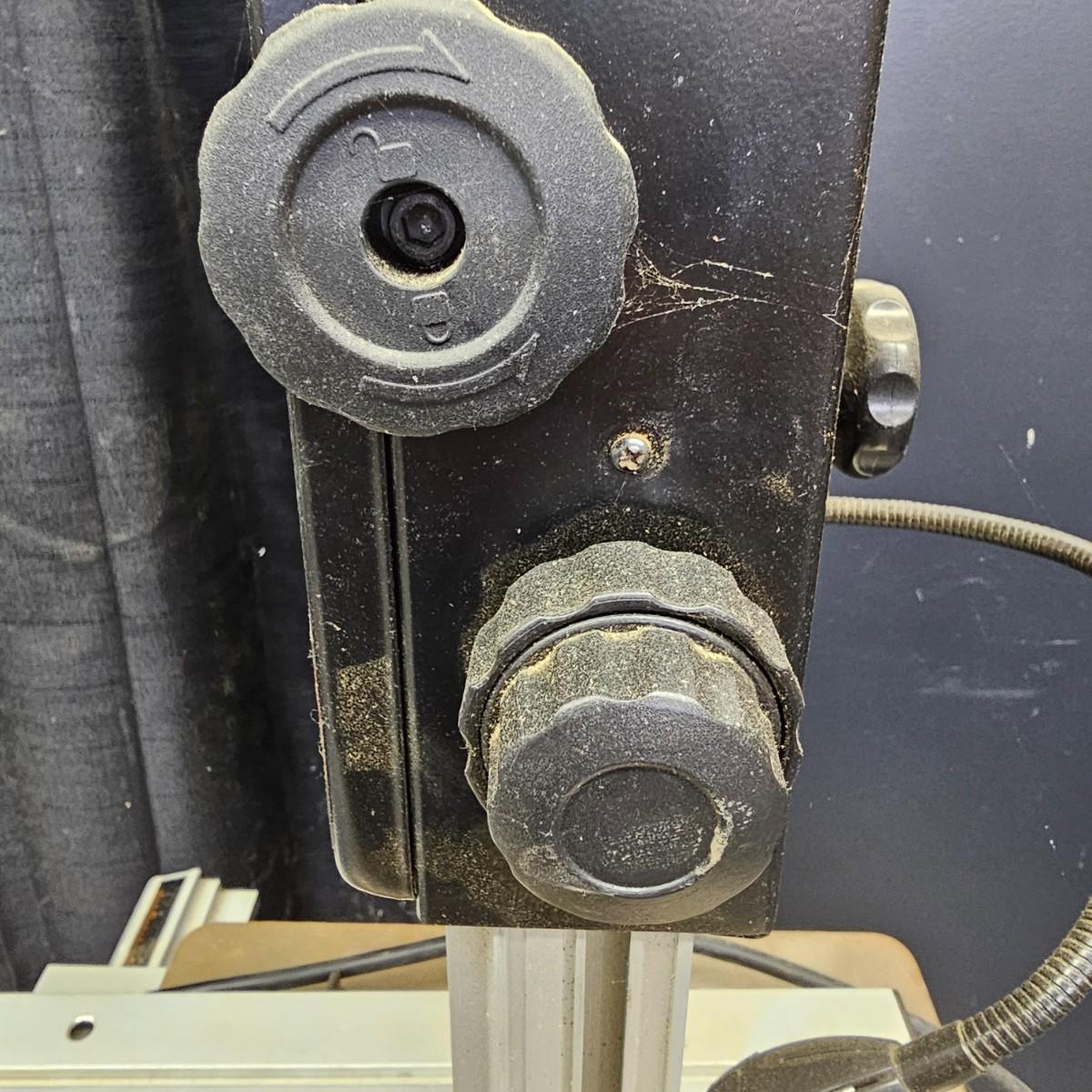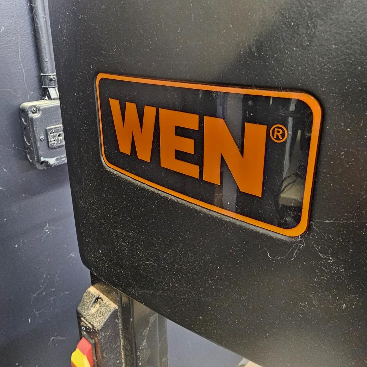 Wen brand 10" band saw on Ironton rolling stand with locking wheels. Saw has auxiliary light at cutting head, adjustable for speed and blade tension. Unit measures 24" x 31" x 59"H. Includes manual and three extra blades, one NIB. Unit and light powered on when plugged in. See photos for details. Local pickup only. Winning bidder must bring assistance to help move and load this item due to its weight and/or size.