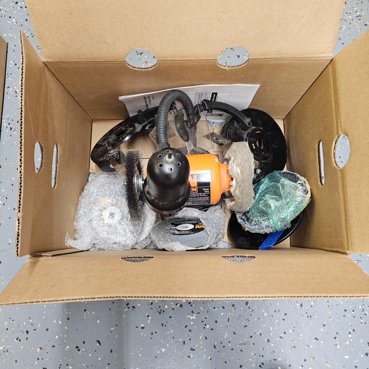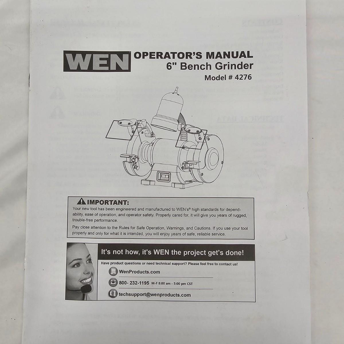 Wen lighted 6" double ended bench grinder with extra wheels and buffs. Grinder as shown measures 12" x 12" x 14"H, with guards attached would be about 6"-8" wider. Guards and shields included but not attached. Three additional stone wheels, a rag buff and one more piece, all new. Comes with instruction manual. Grinder and light powered on when plugged in. See photos for details. Local pickup only.