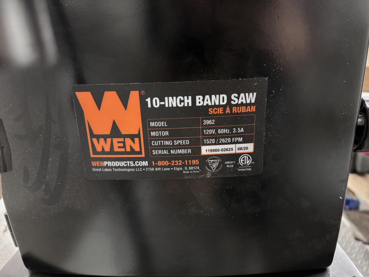 WEN 10" Band Saw- Model 3962 with cutting speed 1520/2620 FPM