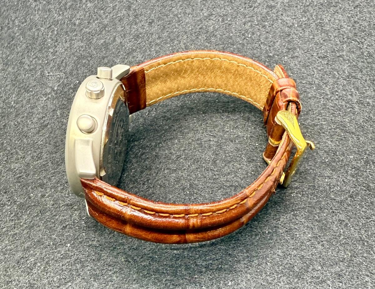 With leather band. White face with 3 inset dials, luminous hands and numbers and a red sweep second hand. Date window at the 4 position. Not running, most likely needs a new battery.