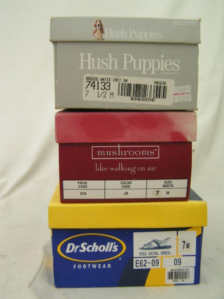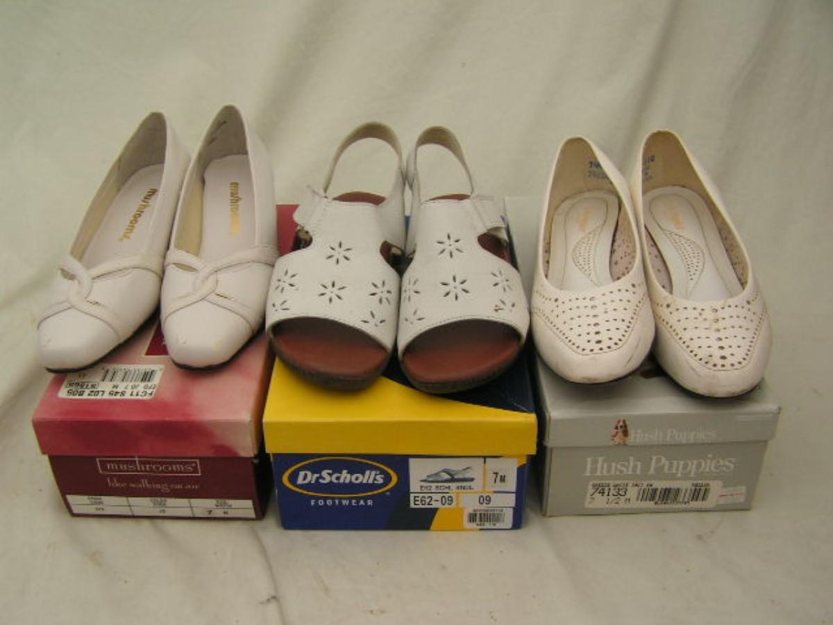 Three pair of ladies foot ware, 7M, 7-1/2M, nice & clean. In original boxes.