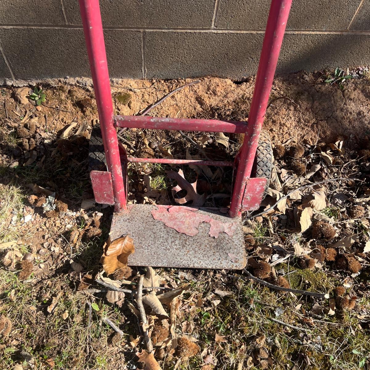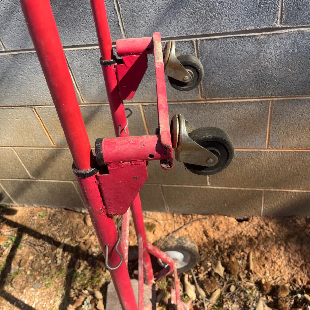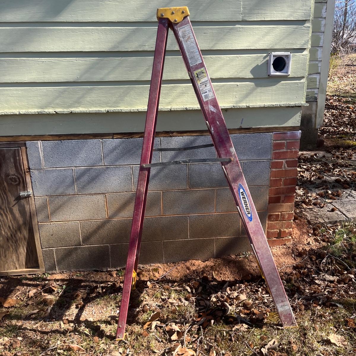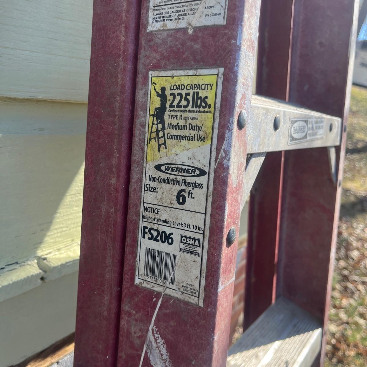 Lot includes a Werner 6’ fiberglass step ladder, metal Hendrick with non pneumatic tires and a plastic shelving unit that measures 36” x 18” x 60”H with one shelf not attached.