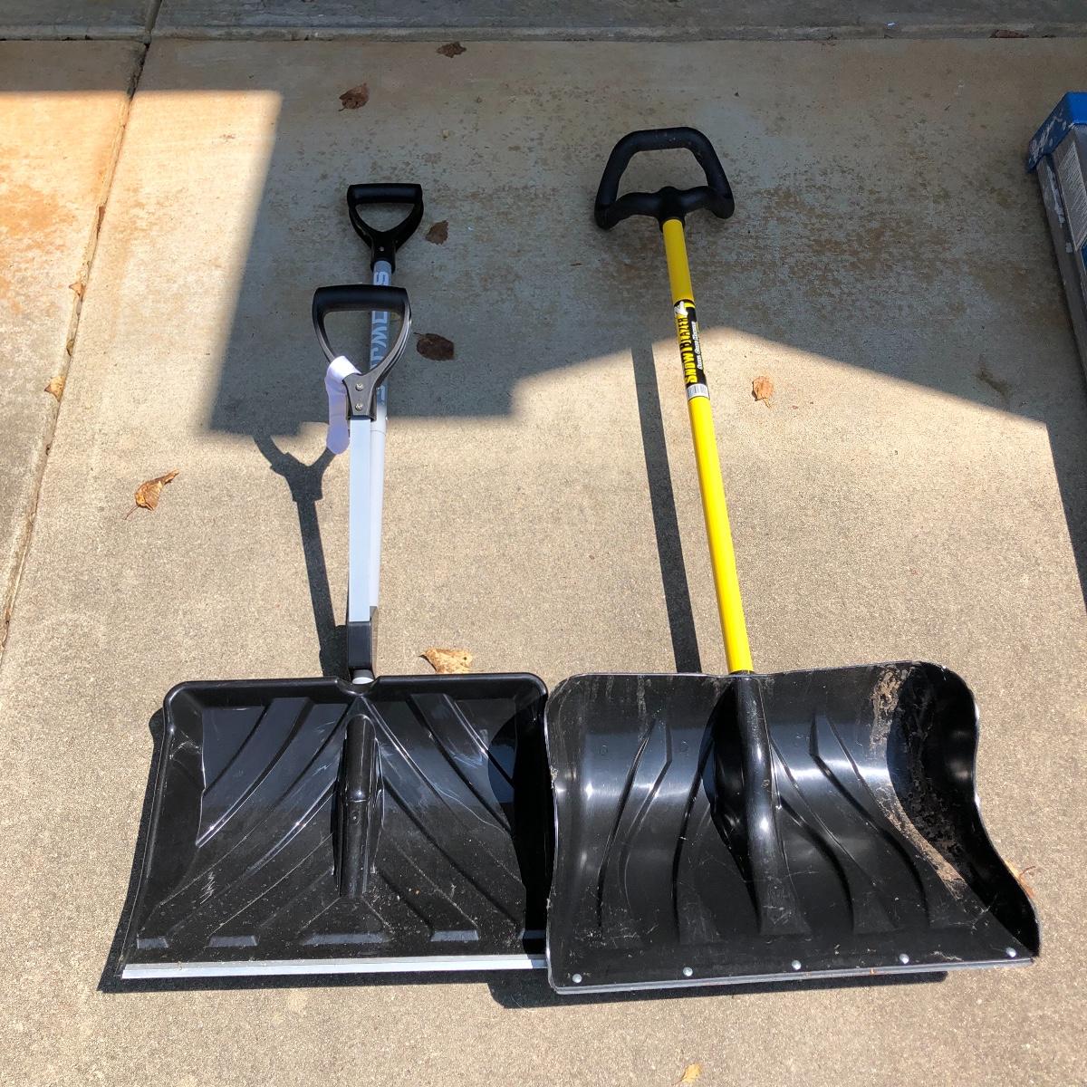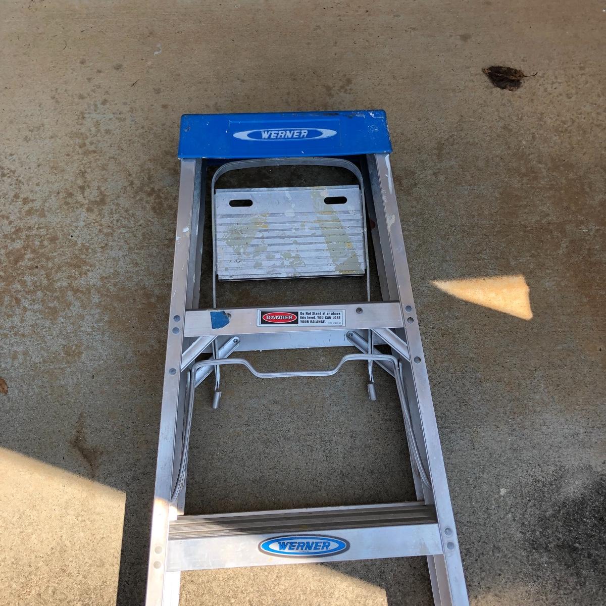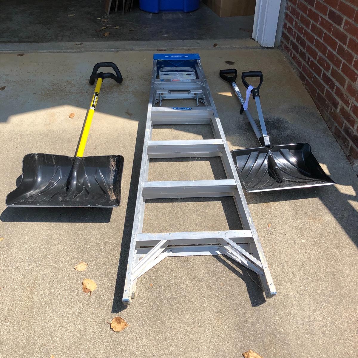 Lot includes Werner six foot aluminum step ladder and two snow shovels including one shovel by Snowjoe with two handles.