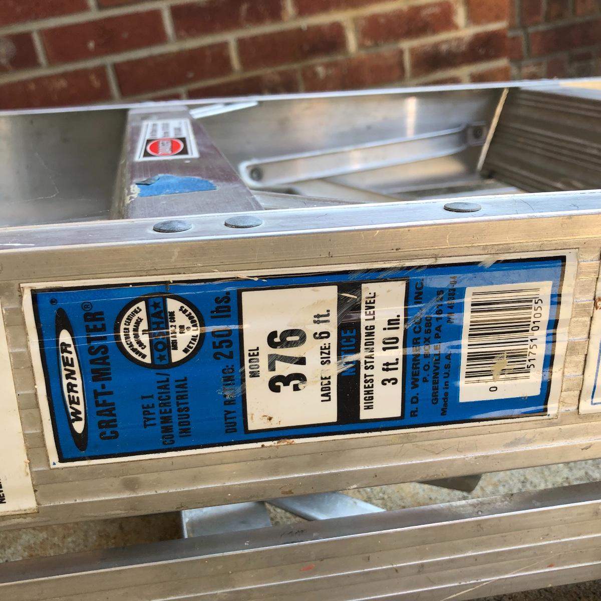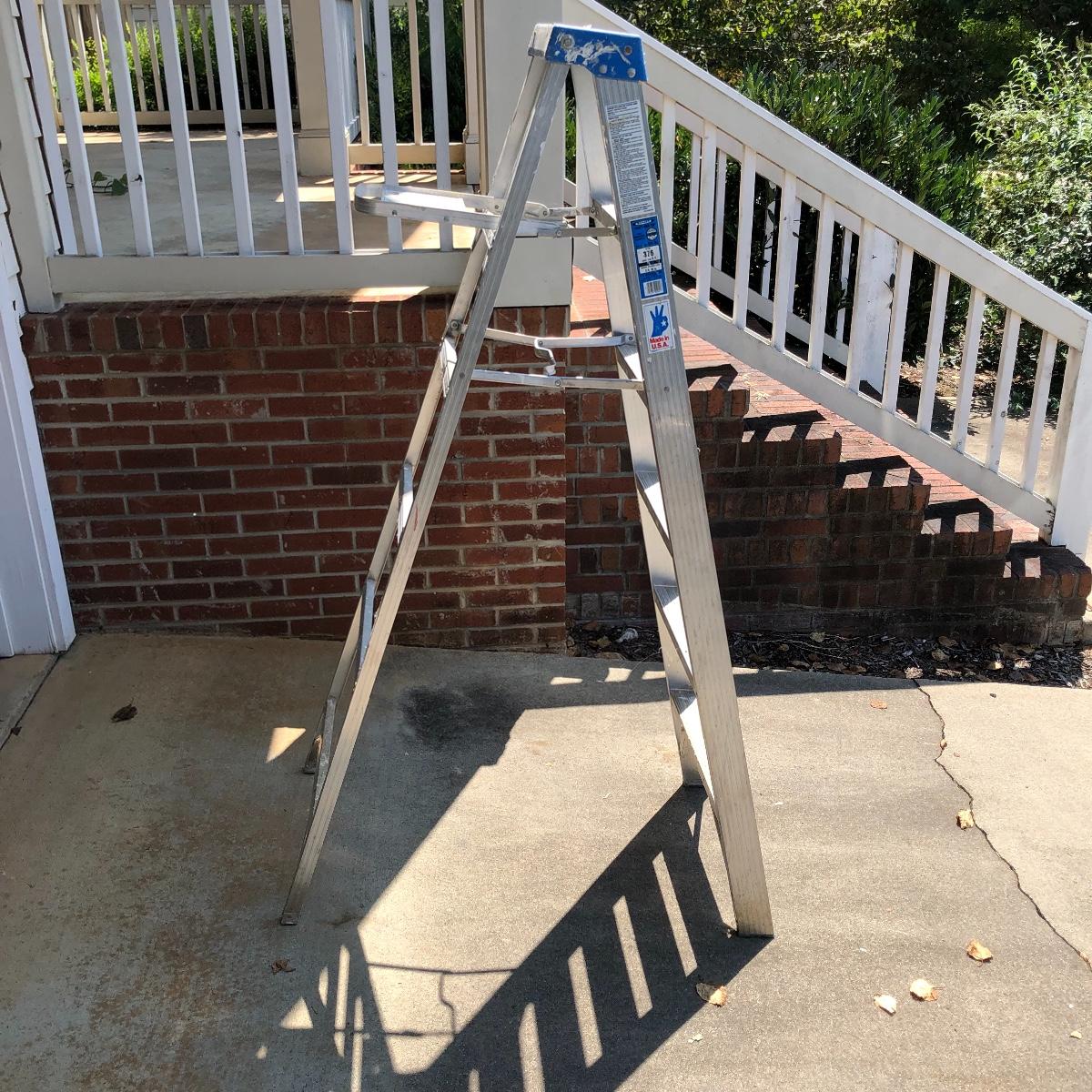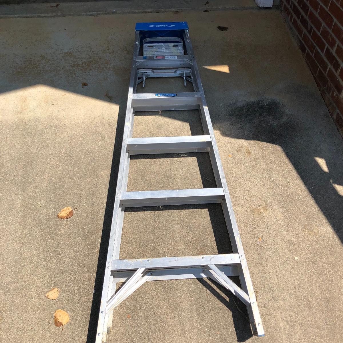 Lot includes Werner six foot aluminum step ladder and two snow shovels including one shovel by Snowjoe with two handles.