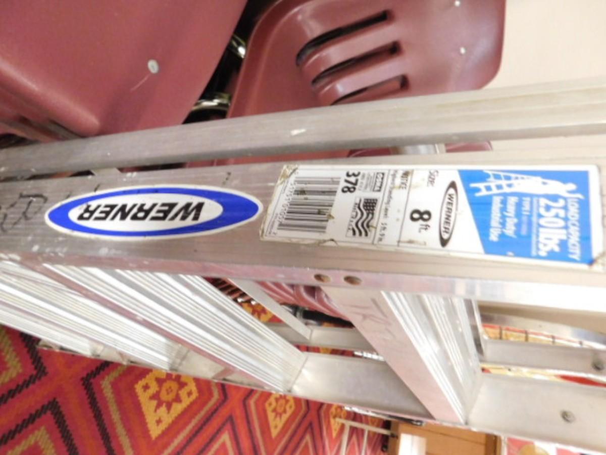 Werner 8' Aluminum Ladder Expect some wear or scratches to finish. Shipping option available via freight or local mover at Buyer's expense. Buyer must have all shipping scheduled within the stated dates and times of pickup. Recommended local mover is Beaty Bros. Moving 828-201-2982