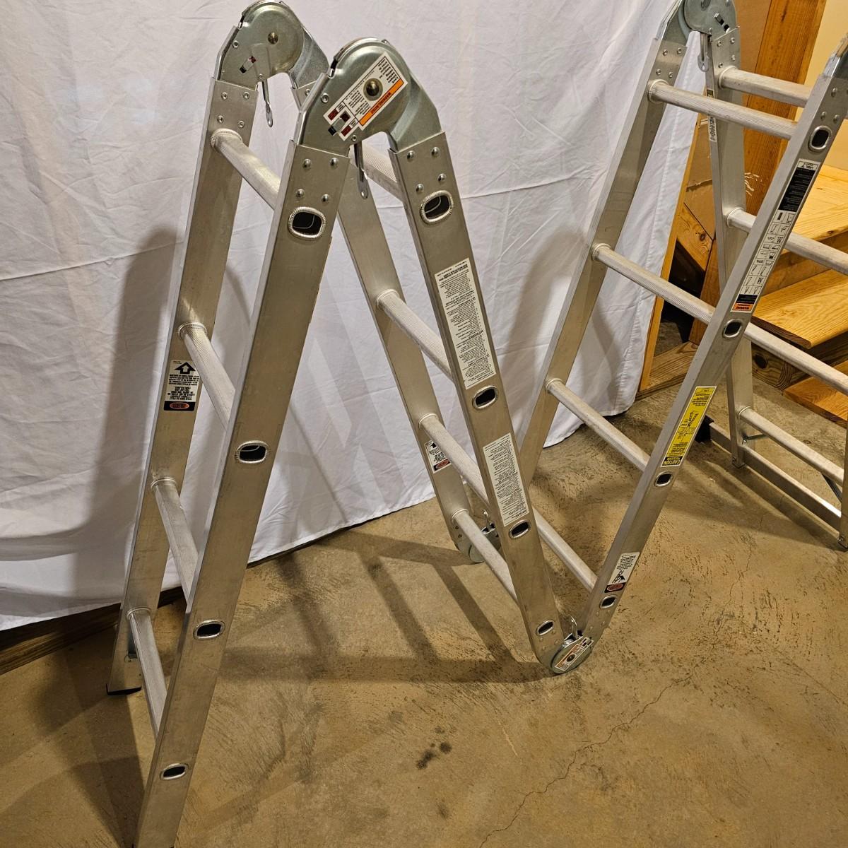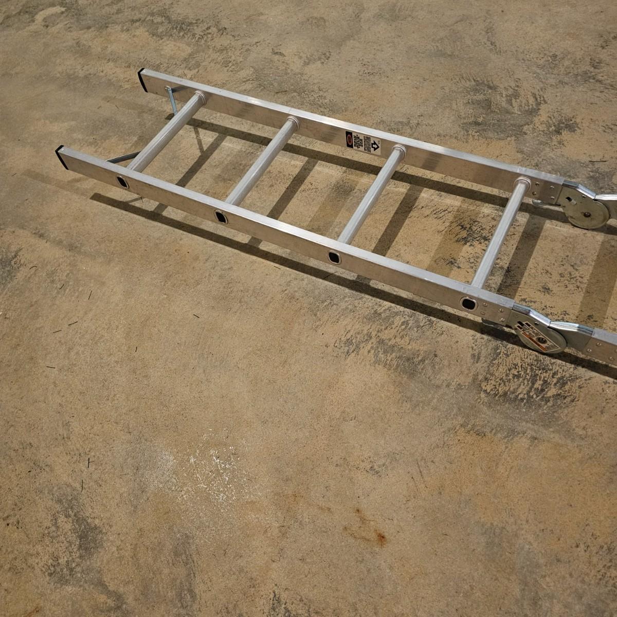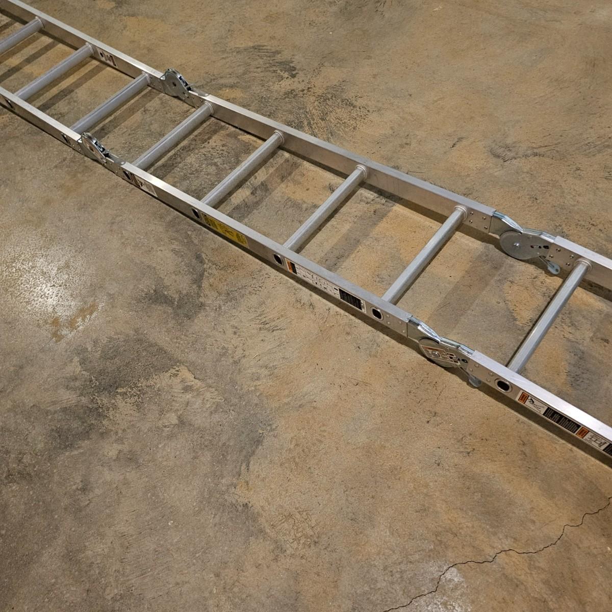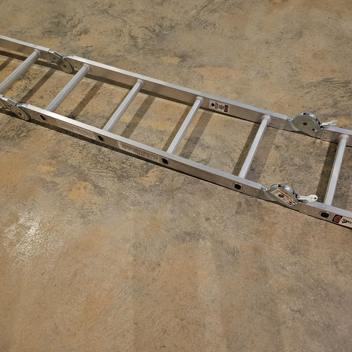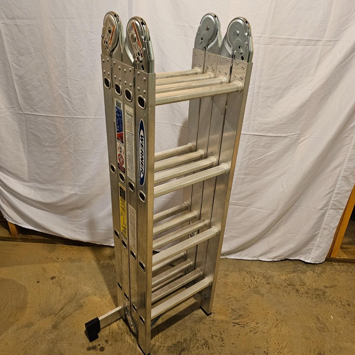 Multiple uses and positions available with this Werner extension ladder. Use as ladder, scaffold, more. Folds flat for storage at 29" x 11" x 52"H. Fully extends to 16 feet. Has snap lock safety paddles at each joint to securely hold ladder in position and rubber feet on bottom bar. See photos for details. Local pickup only.