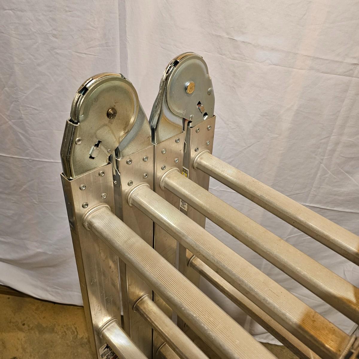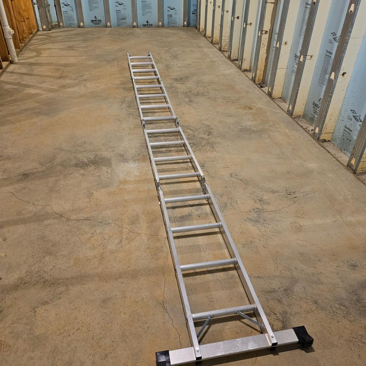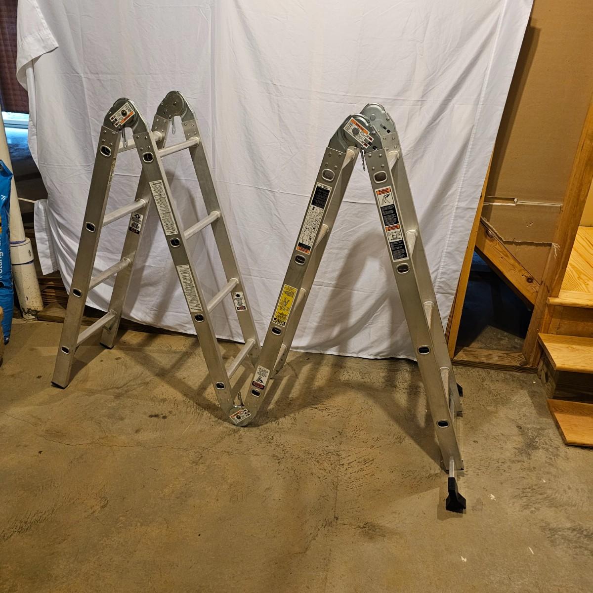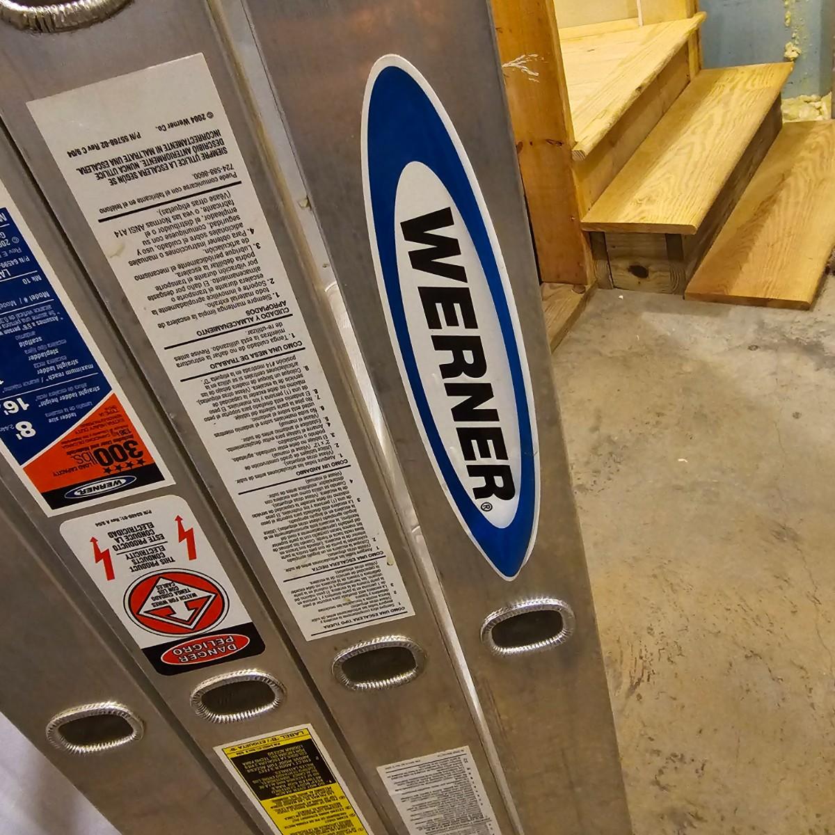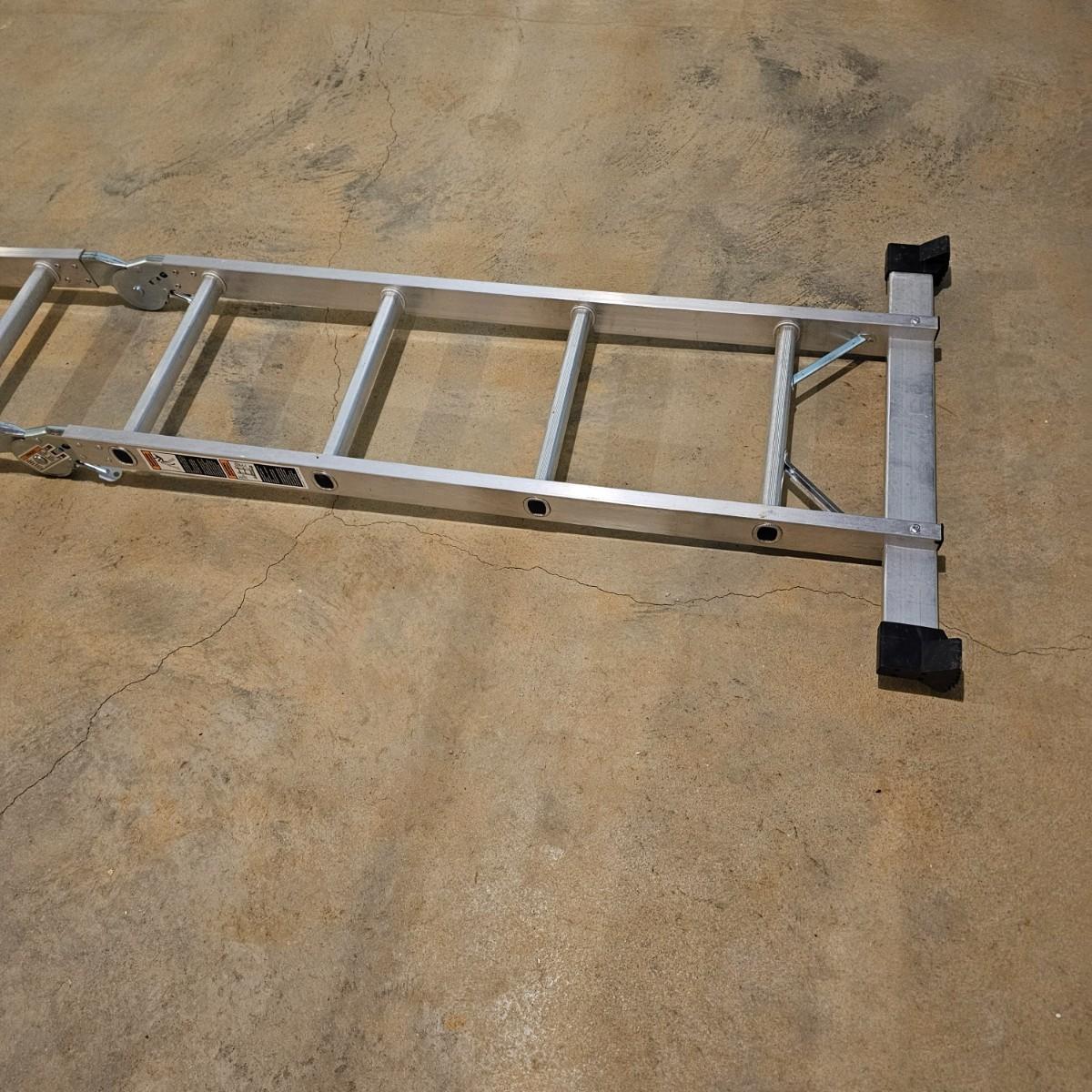 Multiple uses and positions available with this Werner extension ladder. Use as ladder, scaffold, more. Folds flat for storage at 29" x 11" x 52"H. Fully extends to 16 feet. Has snap lock safety paddles at each joint to securely hold ladder in position and rubber feet on bottom bar. See photos for details. Local pickup only.