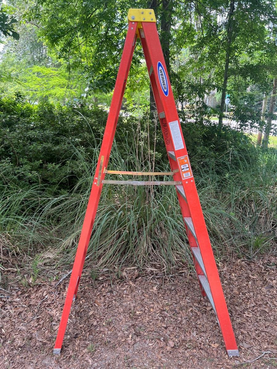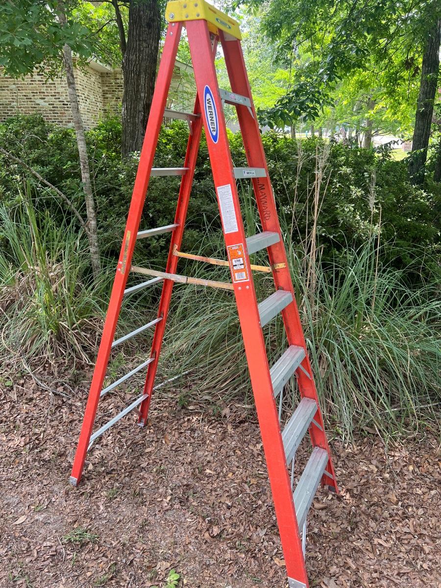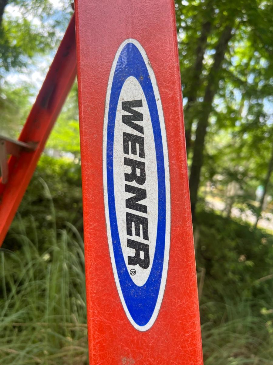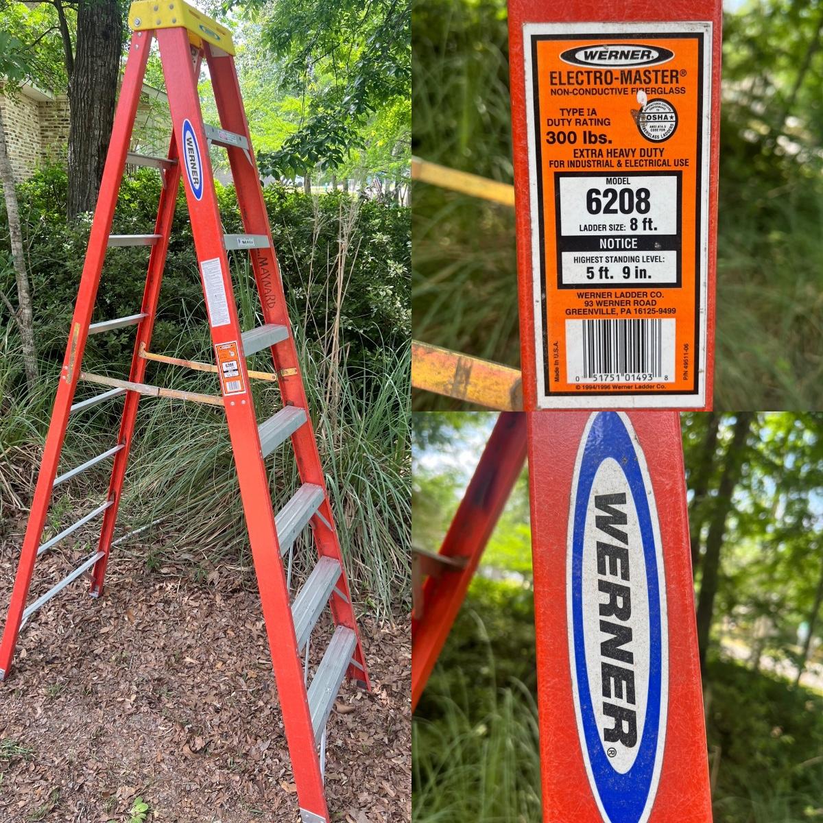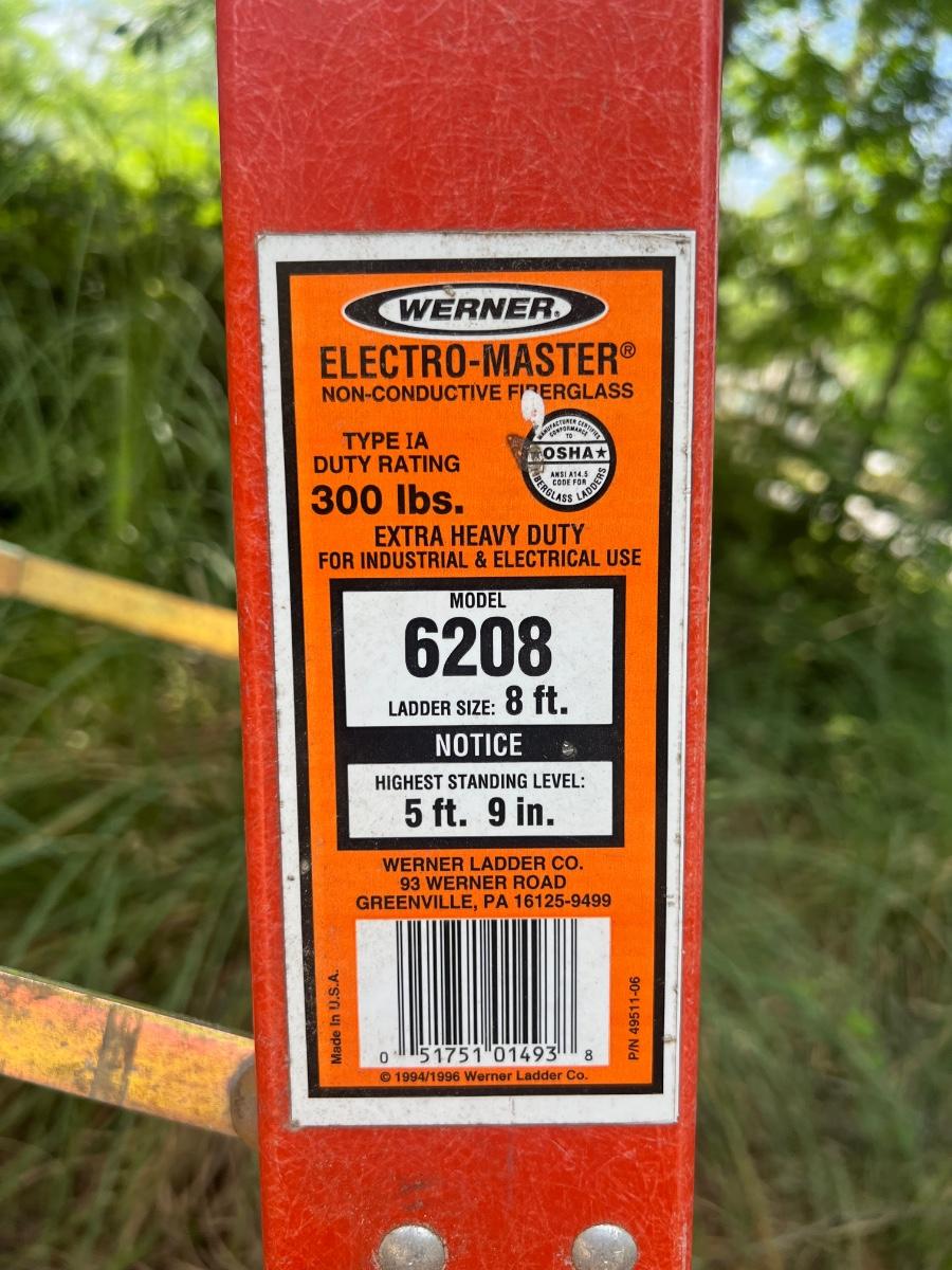 Model 6208. Electro master non conductive fiberglass ladder. 8ft. Good condition. Does have name written on inside.