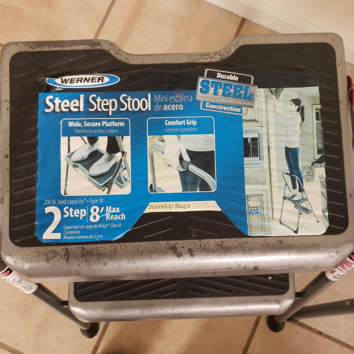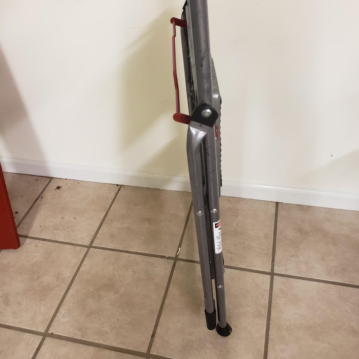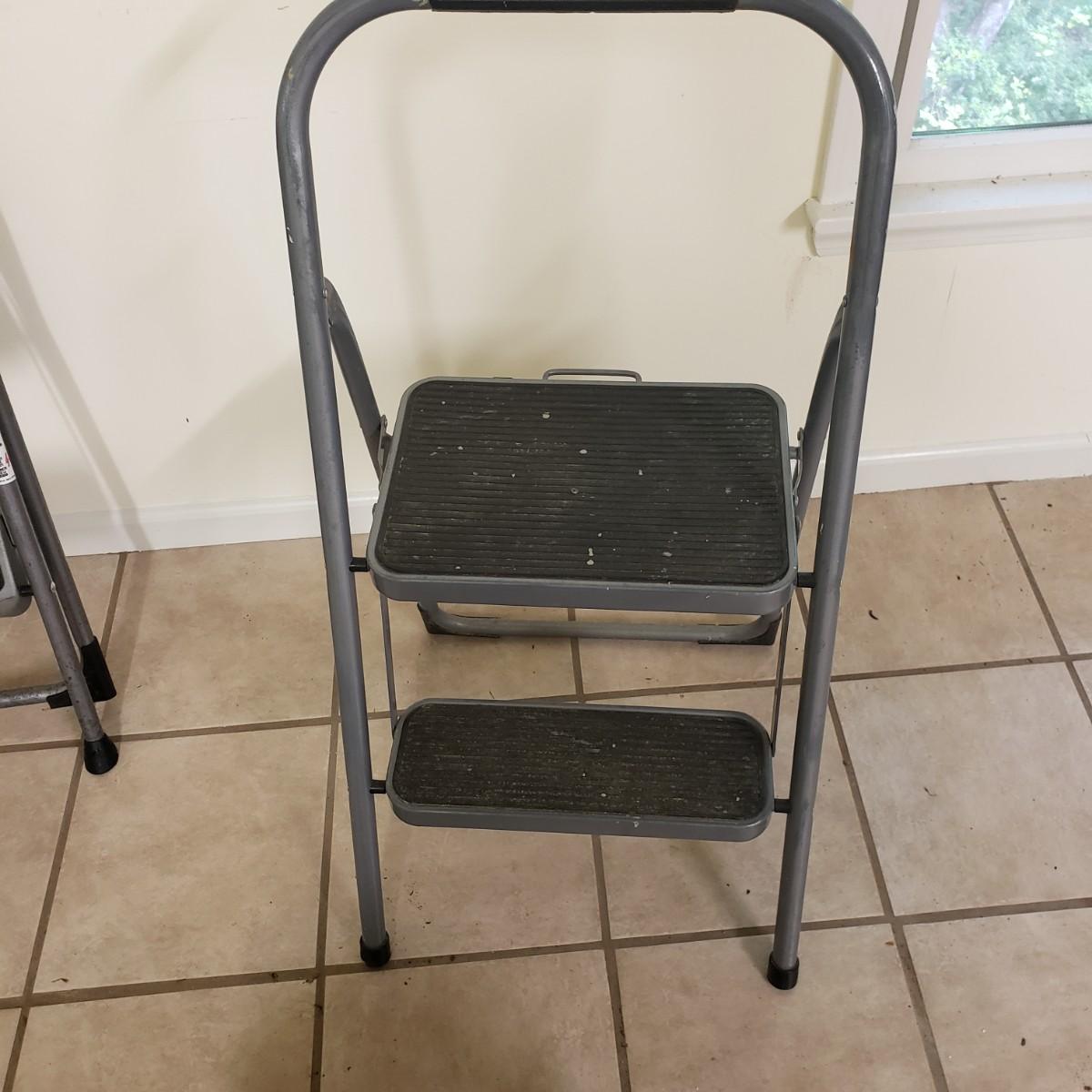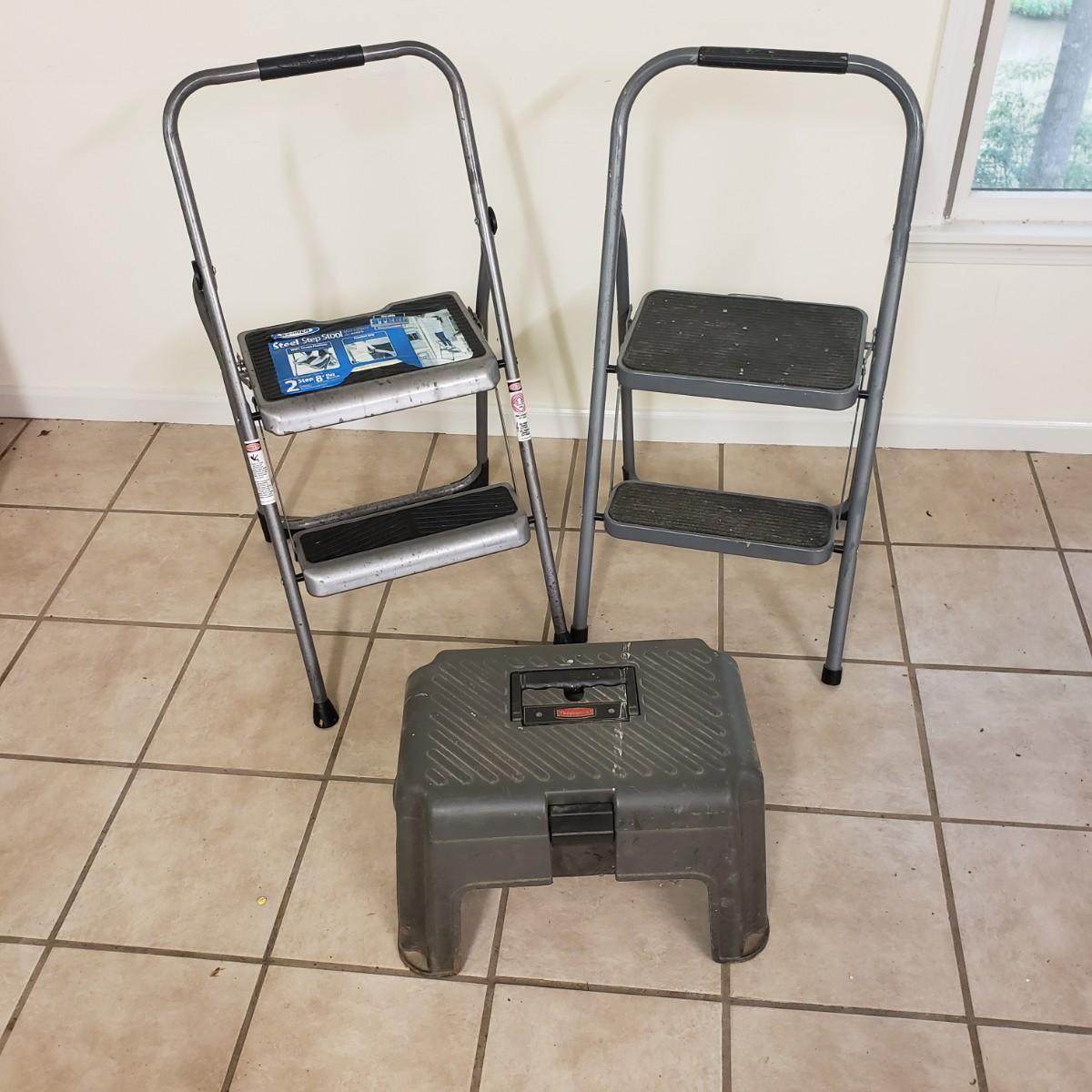 This lot contains three step ladders. The Werner step ladder made of metal can hold up to 200 pounds, see picture for ladder dimensions. It has an easy release bar in red. The Gorilla ladder, made of metal measures 18" x 15" x 36" H unfolded. It also has an easy fold up black button. The Rubbermaid step ladder measures 18" x 12" x 13" H and includes a hidden tool box with removable tray. There is paint on the Gorilla and Rubbermaid ladders, but does not impede its use.
