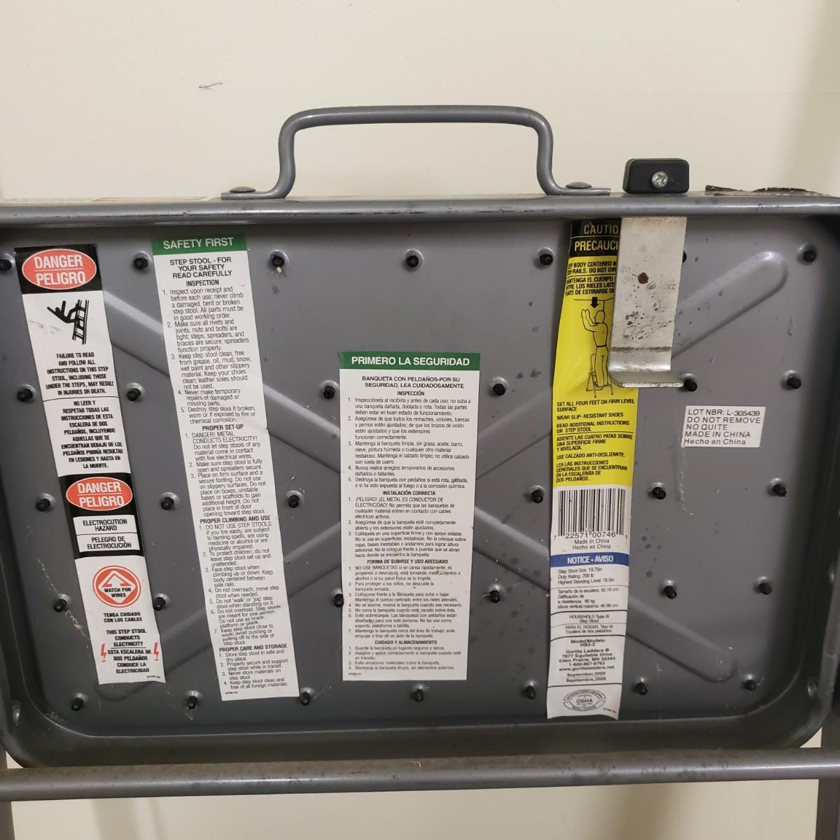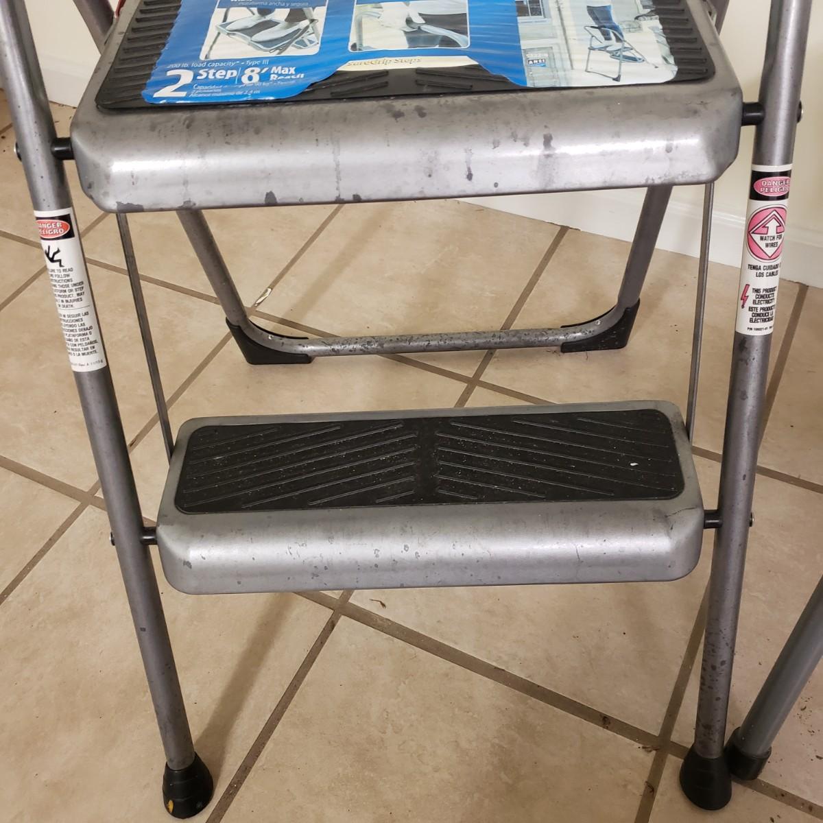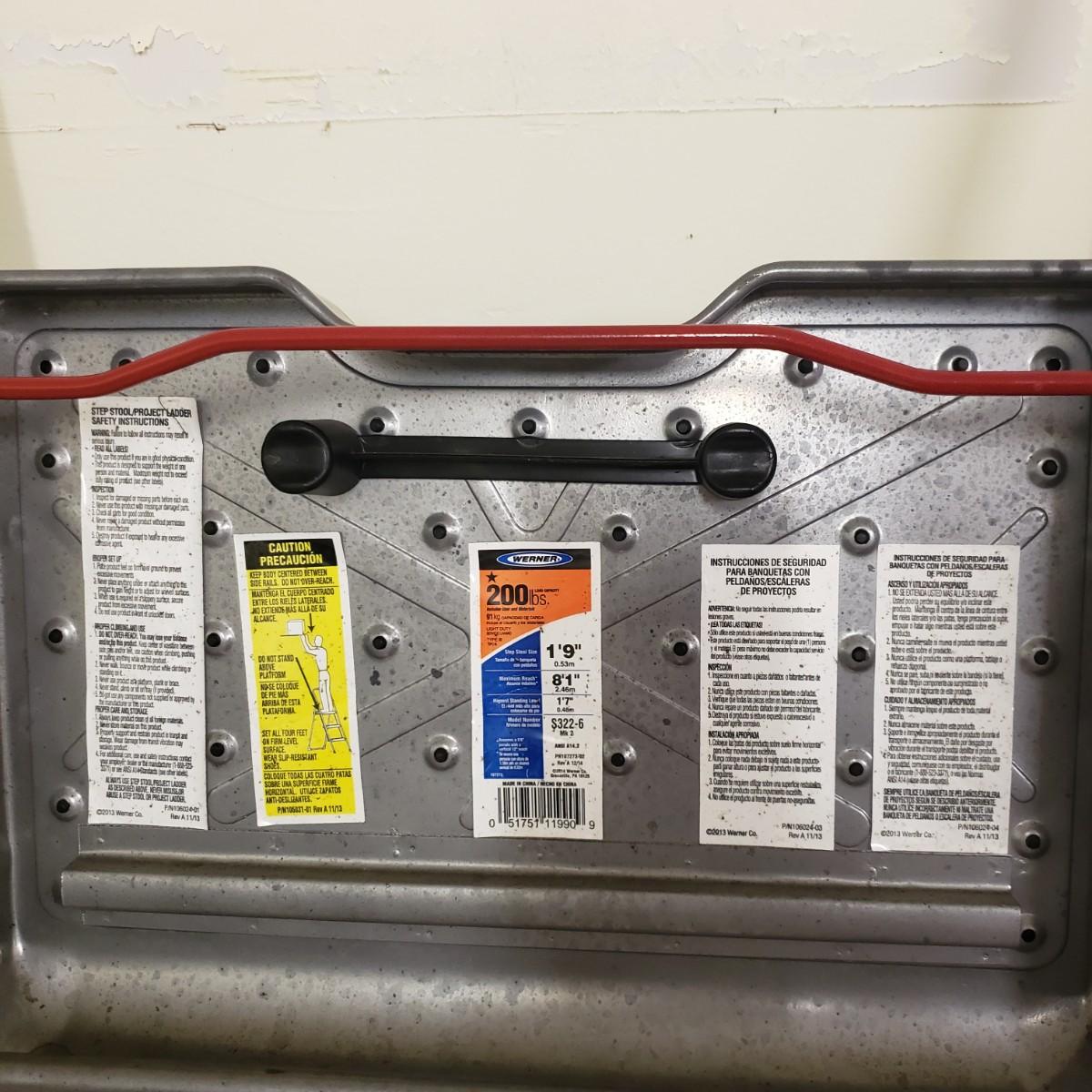 This lot contains three step ladders. The Werner step ladder made of metal can hold up to 200 pounds, see picture for ladder dimensions. It has an easy release bar in red. The Gorilla ladder, made of metal measures 18" x 15" x 36" H unfolded. It also has an easy fold up black button. The Rubbermaid step ladder measures 18" x 12" x 13" H and includes a hidden tool box with removable tray. There is paint on the Gorilla and Rubbermaid ladders, but does not impede its use.