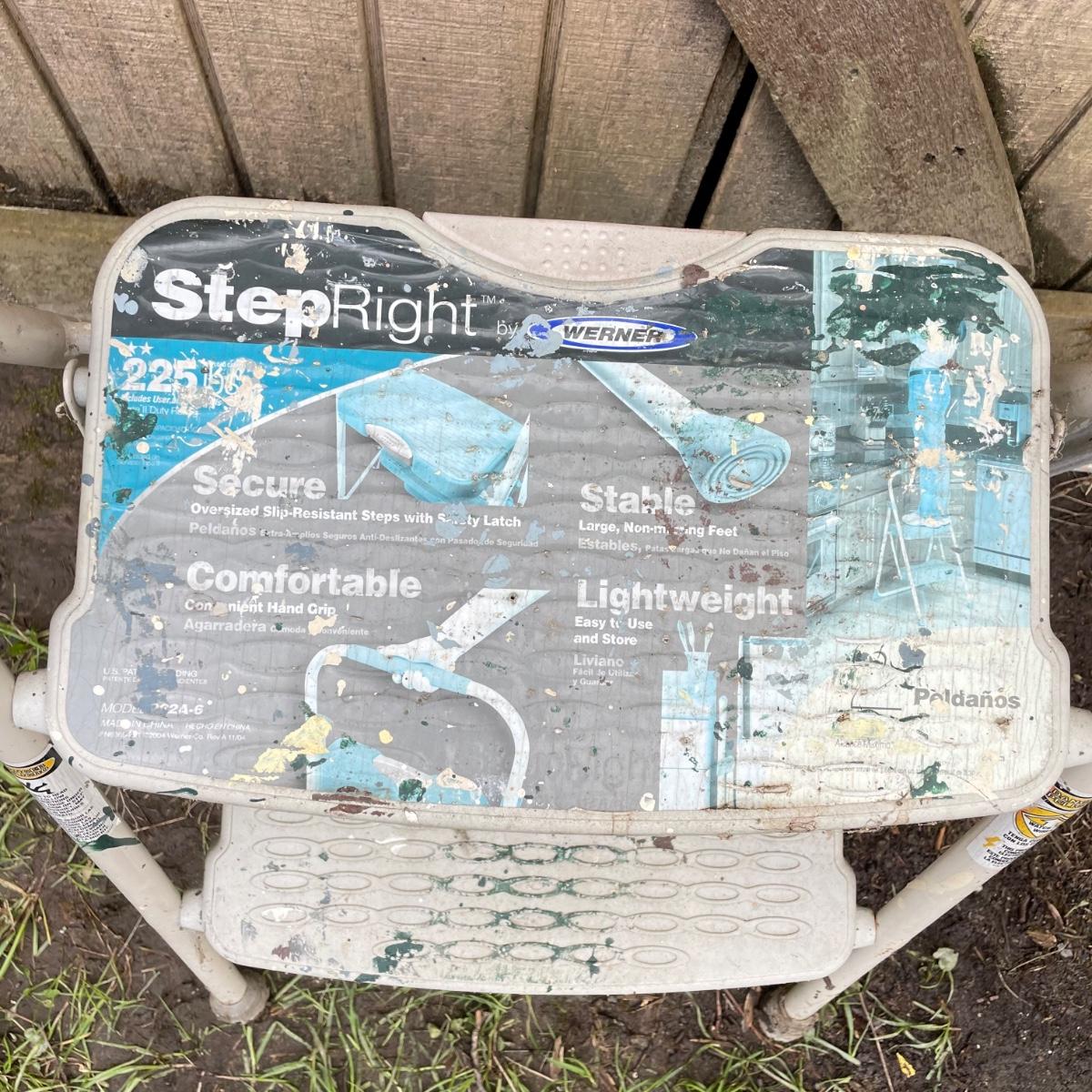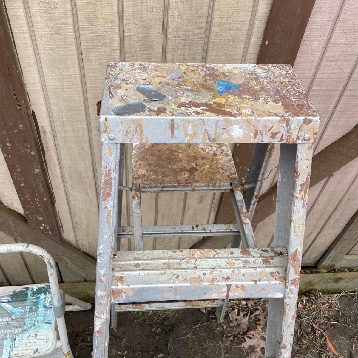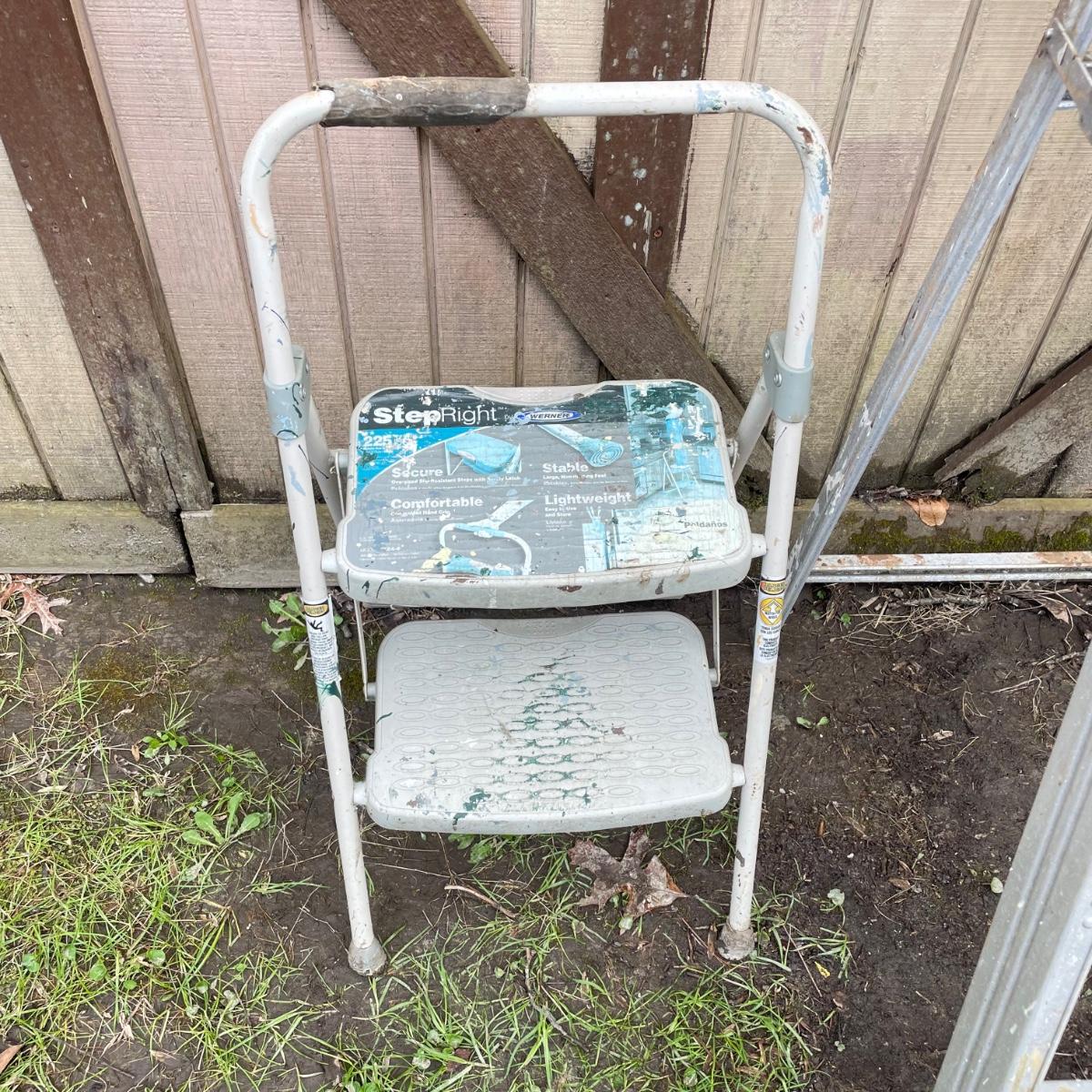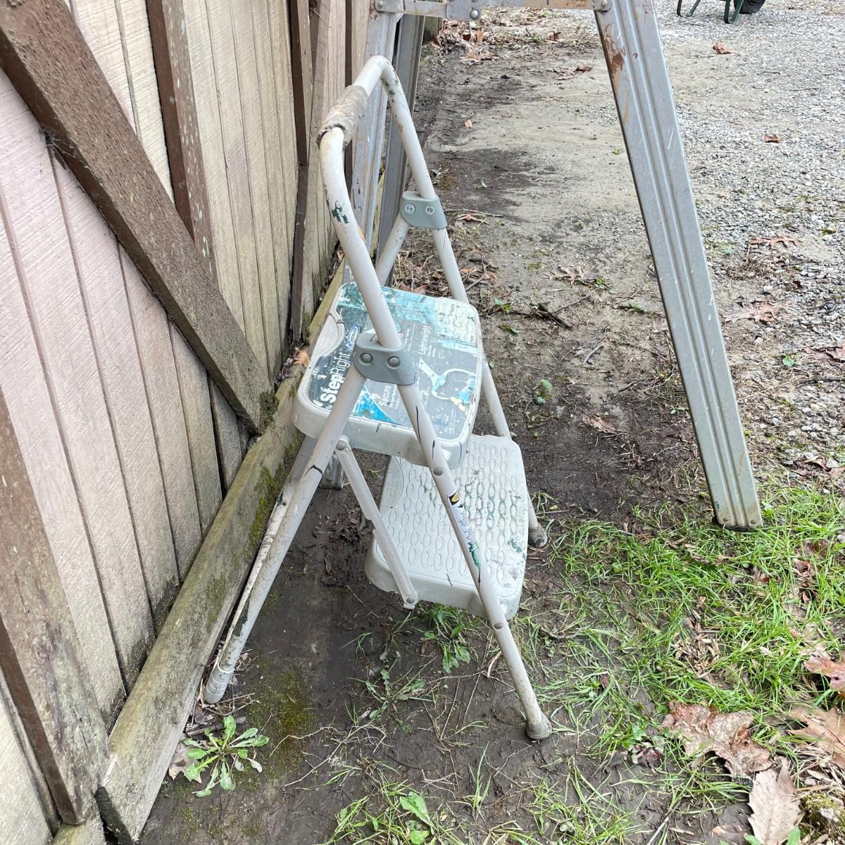 Werner Step Right stepladder with an aluminum painter’s ladder. The painter’s ladder’s third step up (usually the last safe step to use) sits up about 36”. Both ladders show wear and use, but seem sturdy enough for a lot more use. See images. Local pick up only.