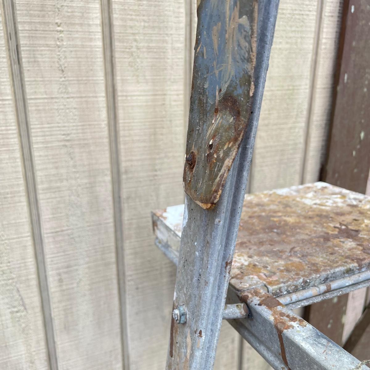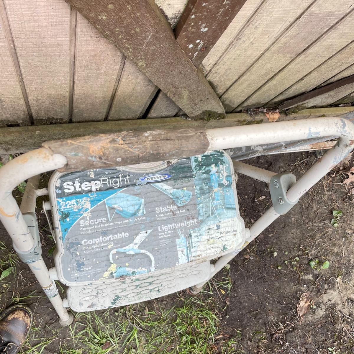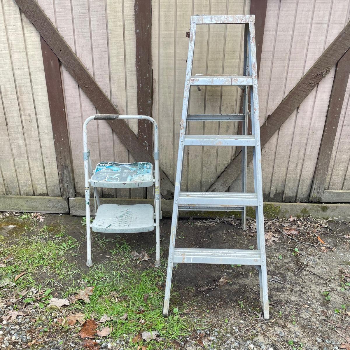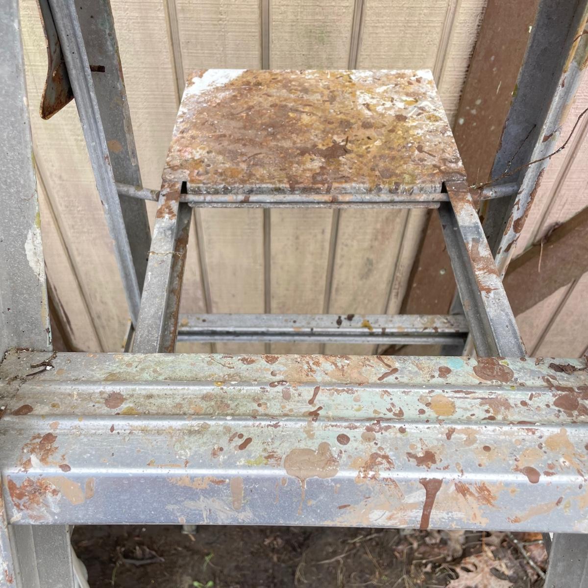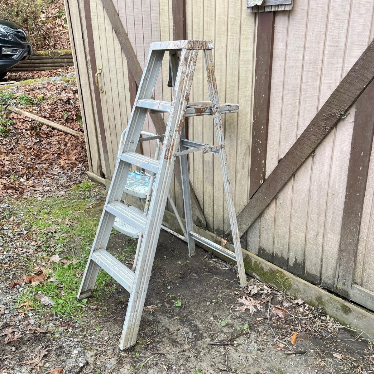 Werner Step Right stepladder with an aluminum painter’s ladder. The painter’s ladder’s third step up (usually the last safe step to use) sits up about 36”. Both ladders show wear and use, but seem sturdy enough for a lot more use. See images. Local pick up only.