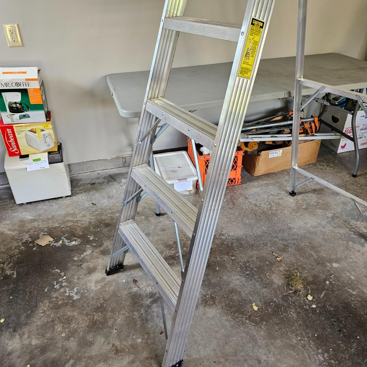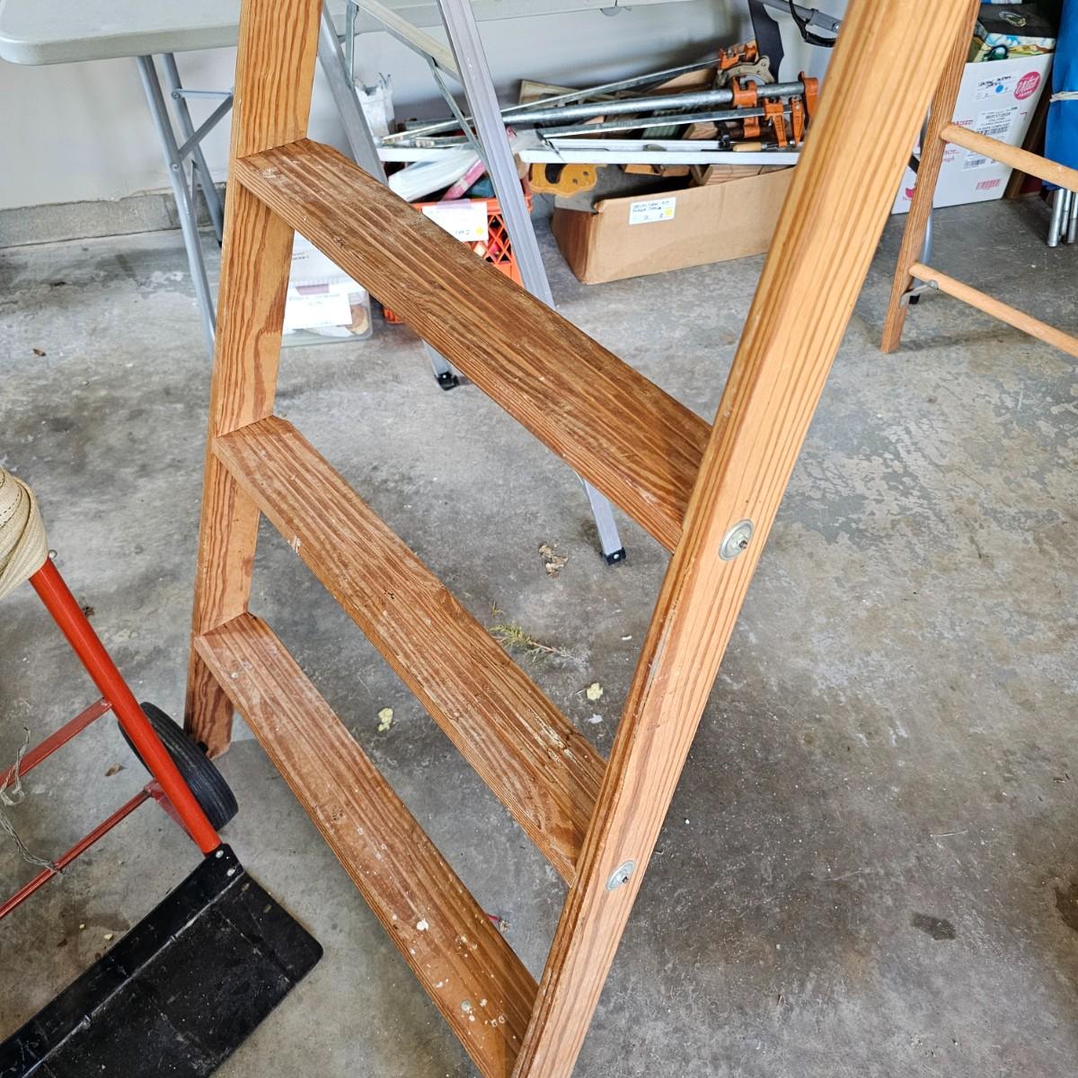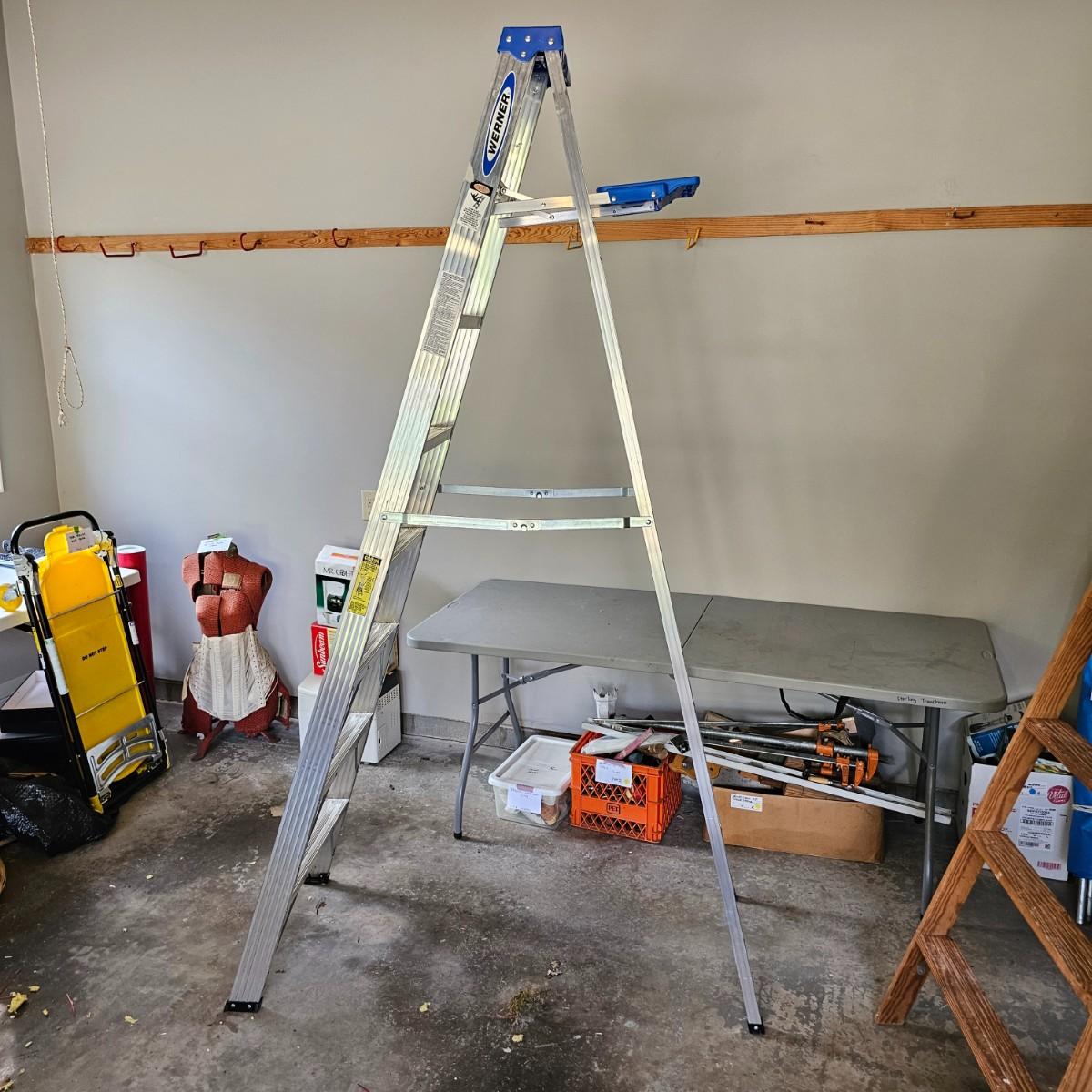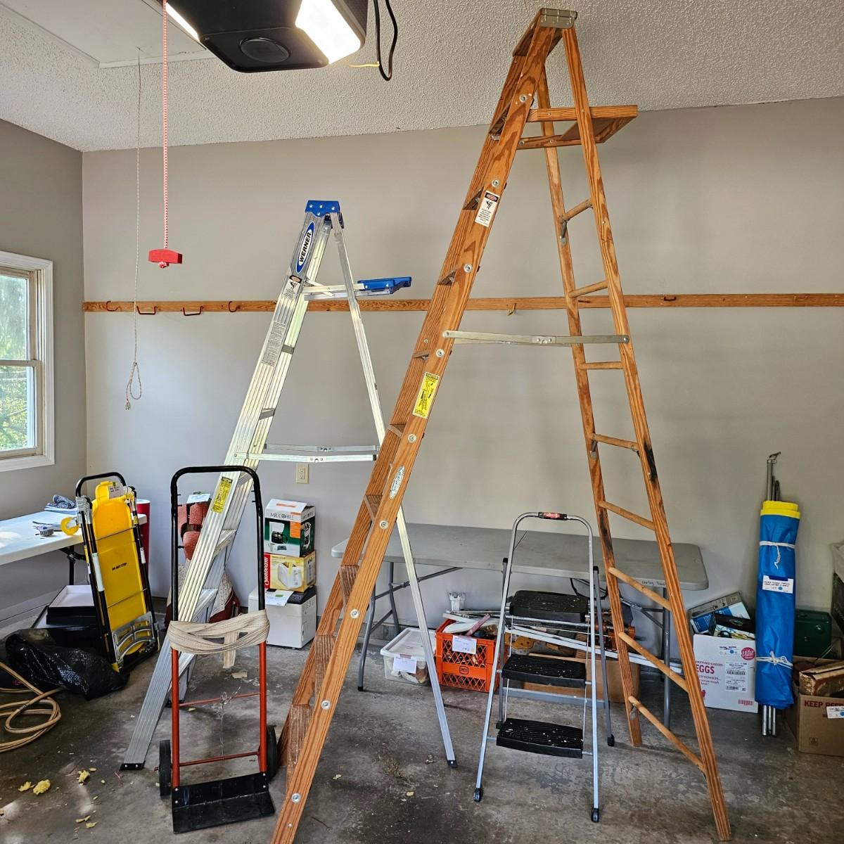 One aluminum 8' ladder and one wooden 10' ladder, both by Werner. Both have work tables at top to hold supplies. Wood-63" x 27" x 10'H, aluminum 53" x 24" x 8'H. Small folding stepstool is by Rubbermaid, measures 18" x 26" x 42"H. Light dolly converts to flat truck but no front wheels. 17" x 14" x 49"H. See photos for details. Local pickup only.