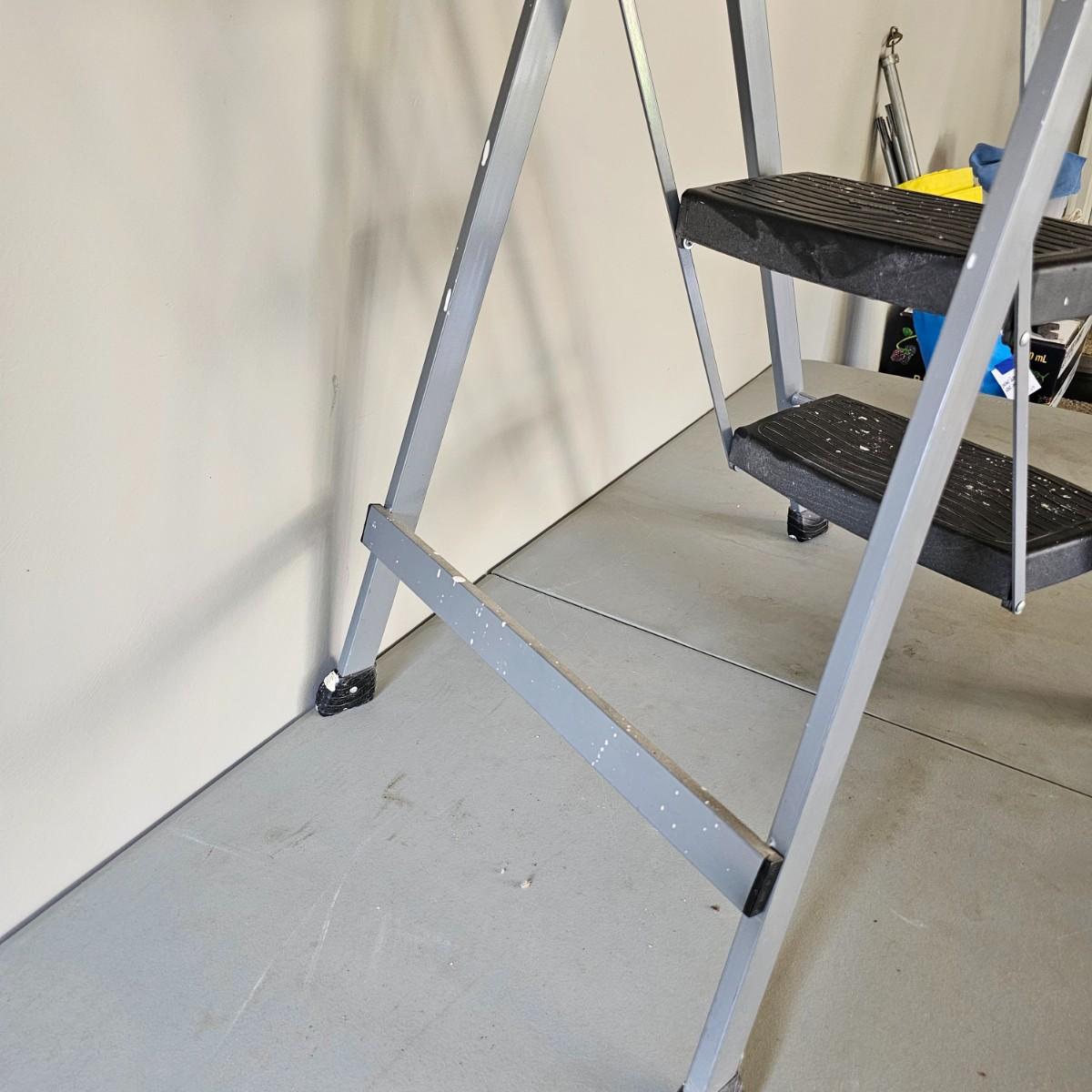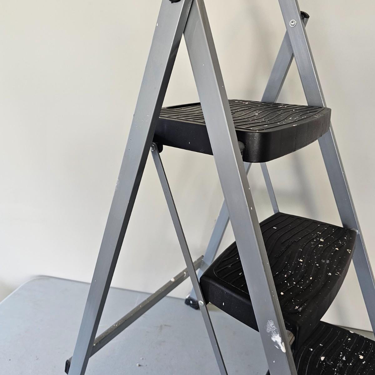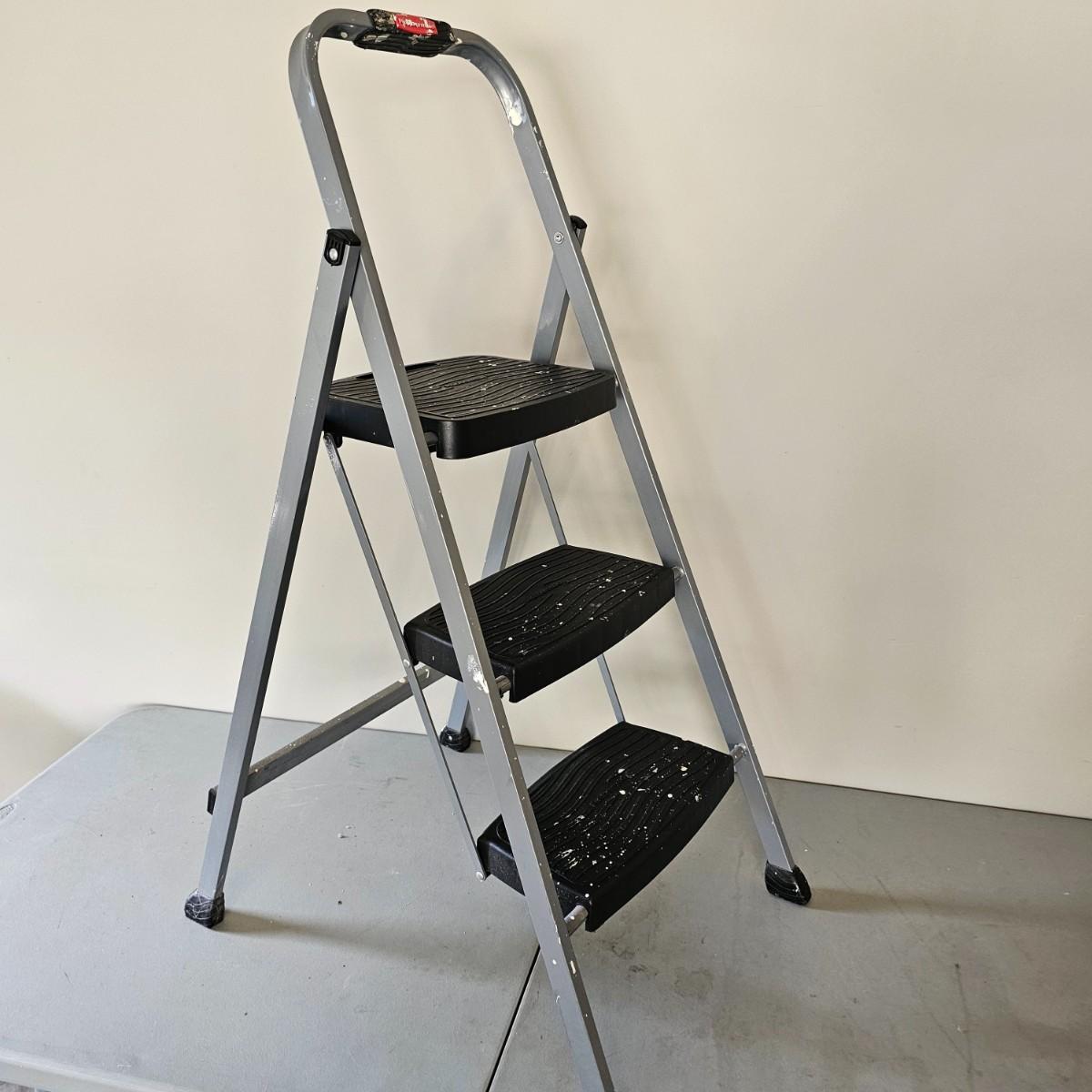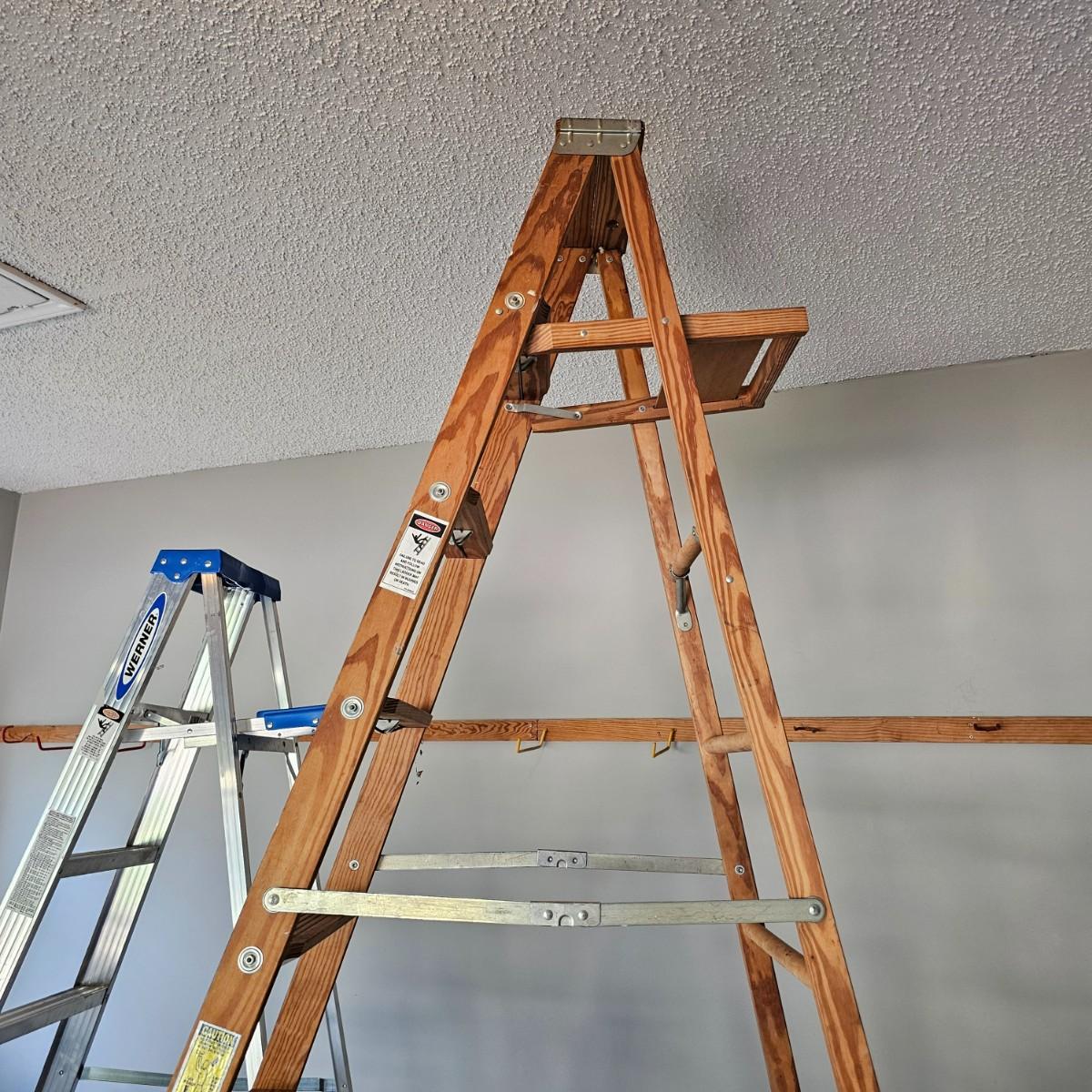 One aluminum 8' ladder and one wooden 10' ladder, both by Werner. Both have work tables at top to hold supplies. Wood-63" x 27" x 10'H, aluminum 53" x 24" x 8'H. Small folding stepstool is by Rubbermaid, measures 18" x 26" x 42"H. Light dolly converts to flat truck but no front wheels. 17" x 14" x 49"H. See photos for details. Local pickup only.