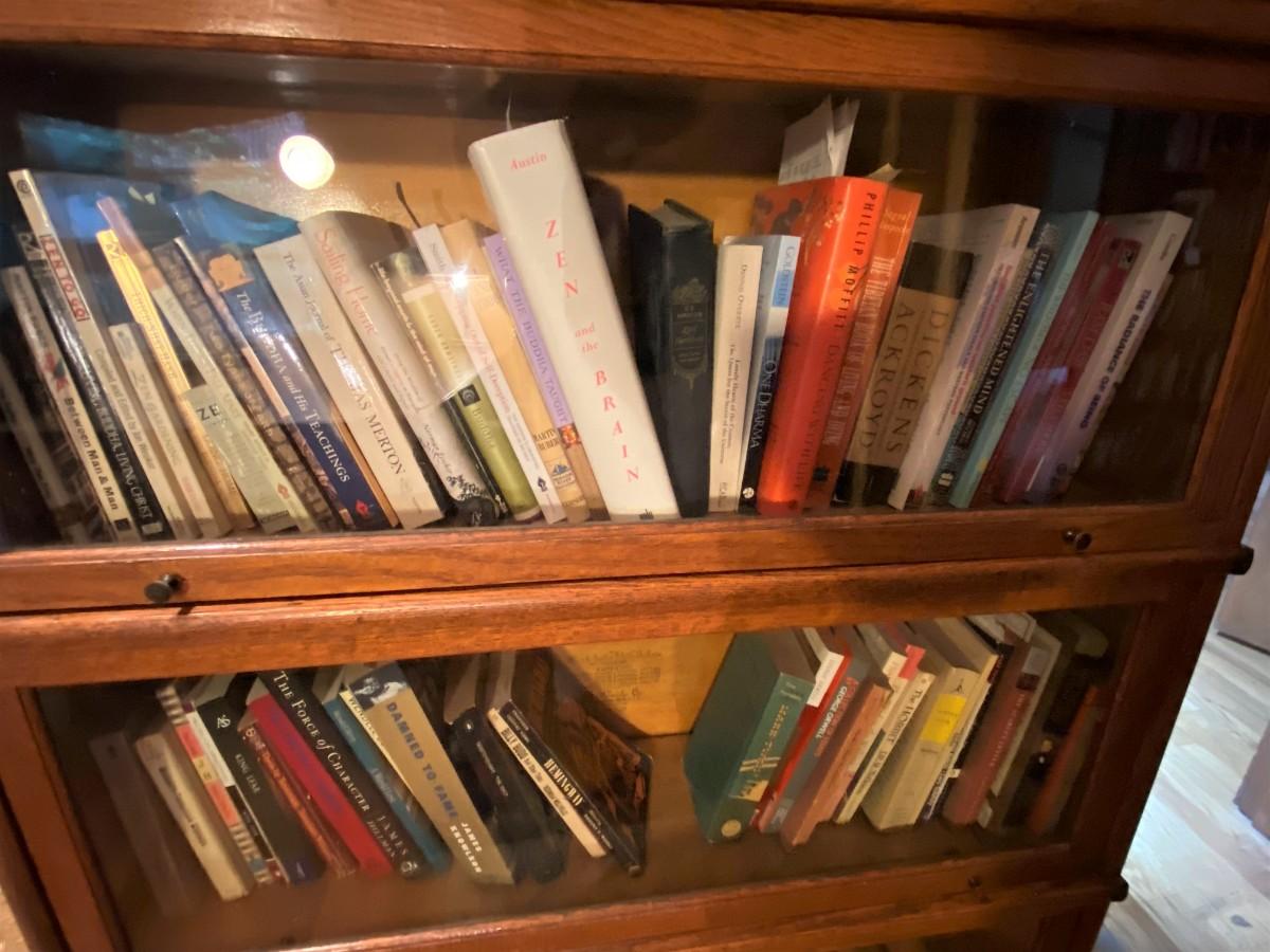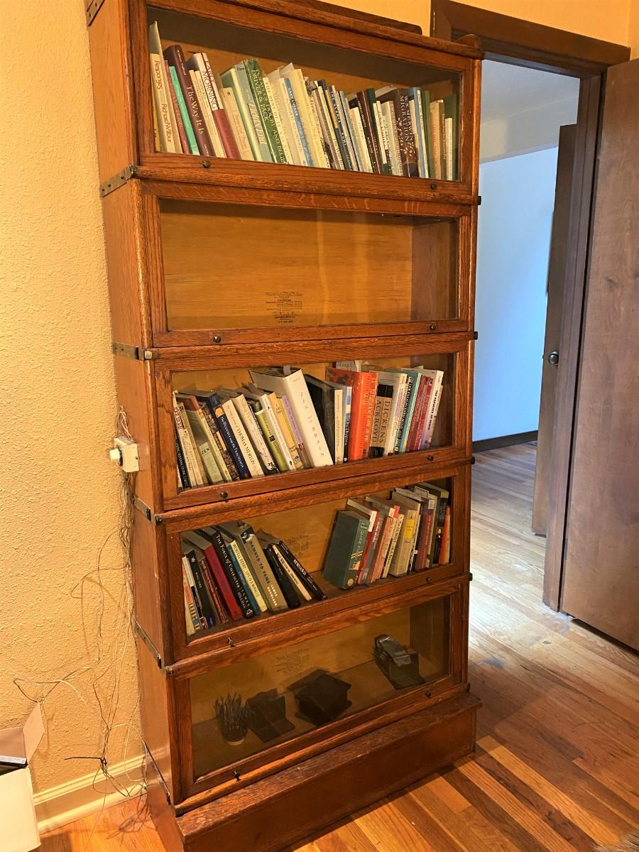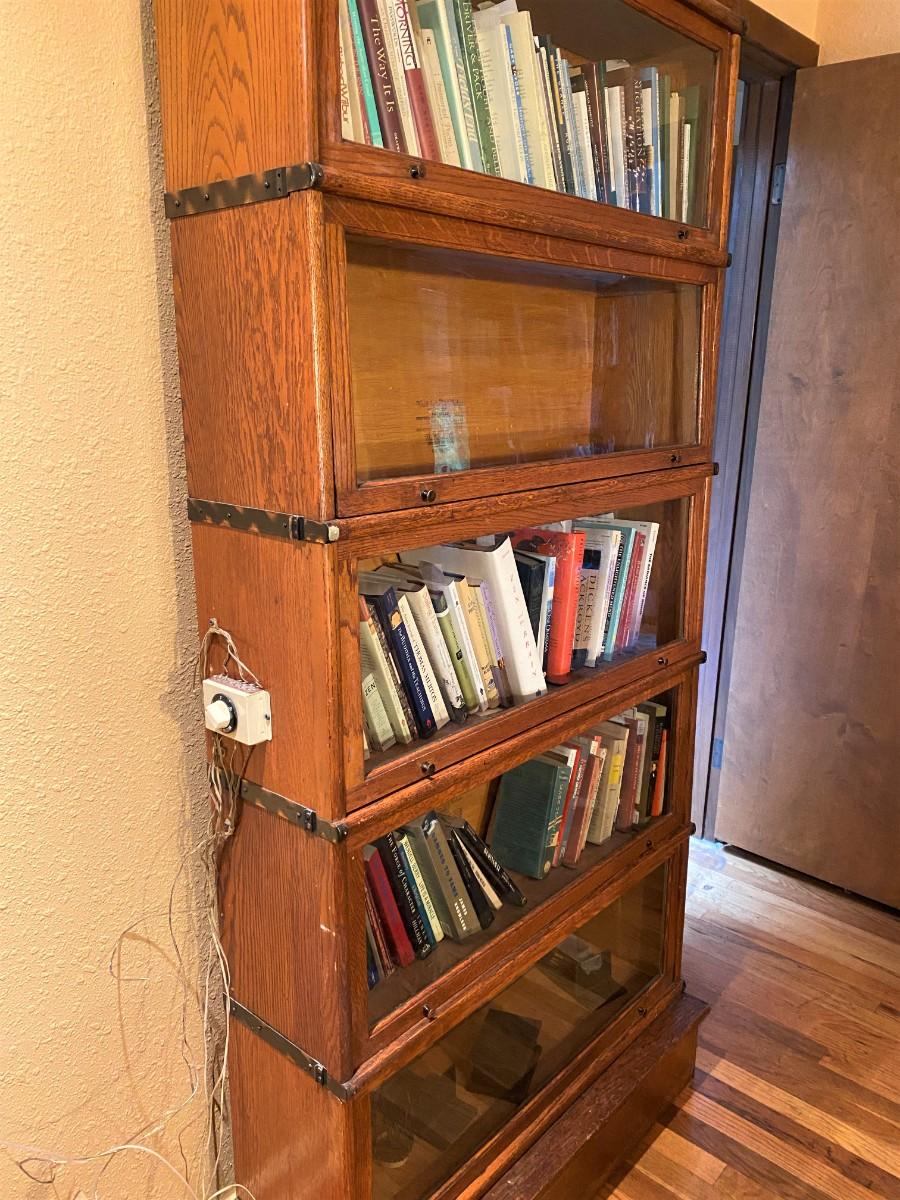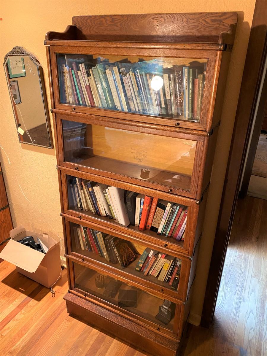 Wernicke Co Antique Barrister Bookcase with Five Stacking Shelves and Decorative Top. Glass front shelves, in good condition. In very good condition. Also includes as many of the books etc. in the shelves as the winner desires.