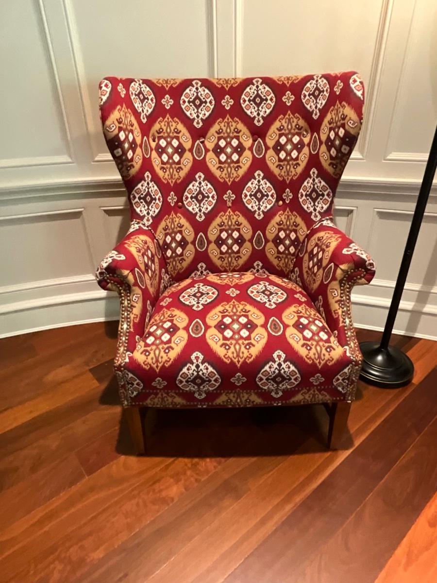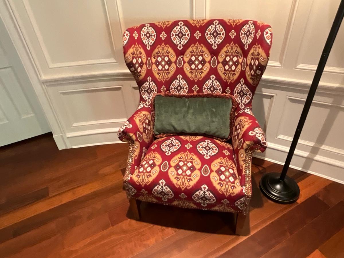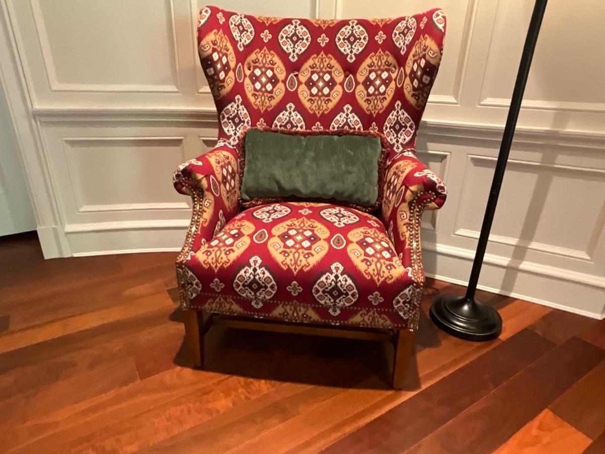 High back wing chair, 32 inches deep 45 tall, 33.5 inches wide. Without the decorative pillow seat depth is 21 inches is 22 inches and it’s 19 inches from the floor to the seat.