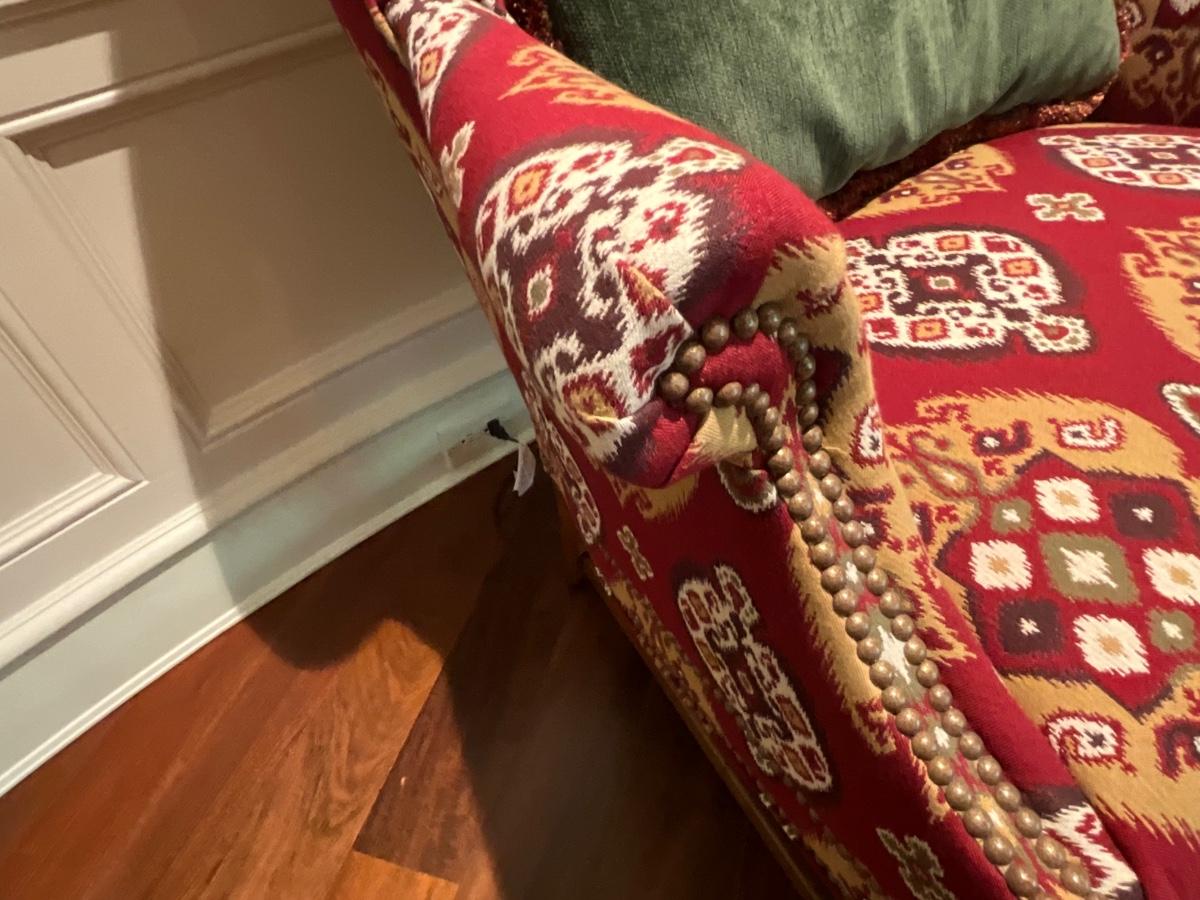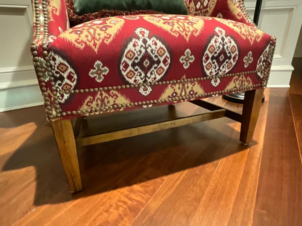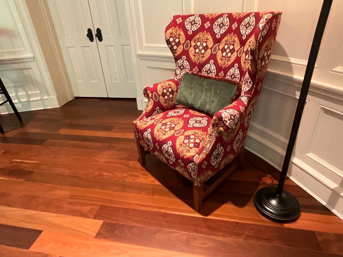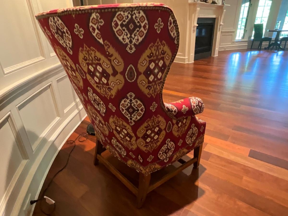 High back wing chair, 32 inches deep 45 tall, 33.5 inches wide. Without the decorative pillow seat depth is 21 inches is 22 inches and it’s 19 inches from the floor to the seat.