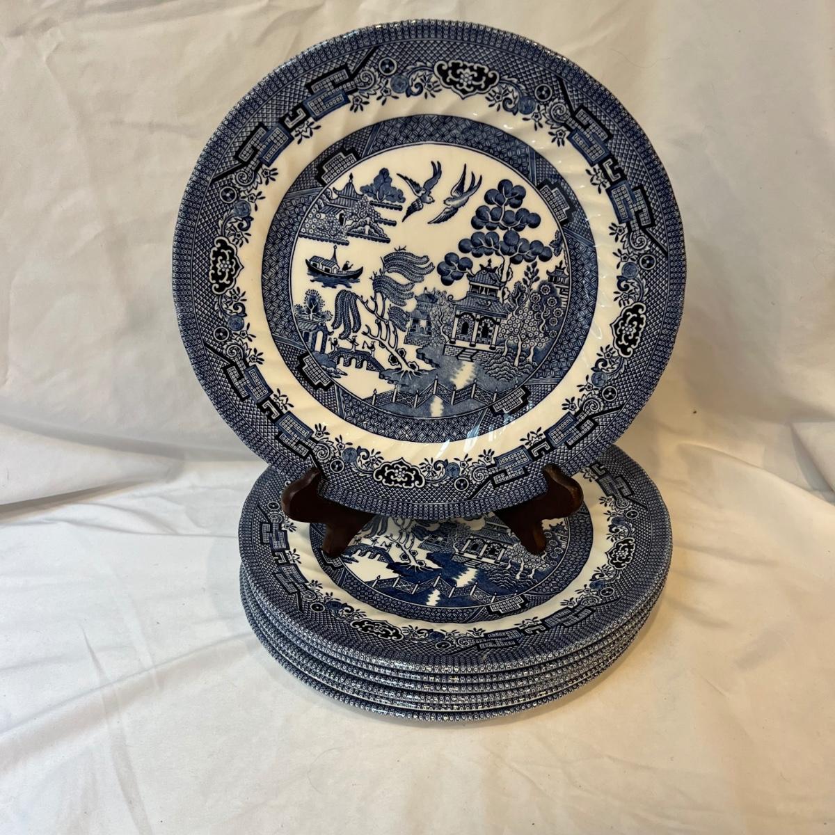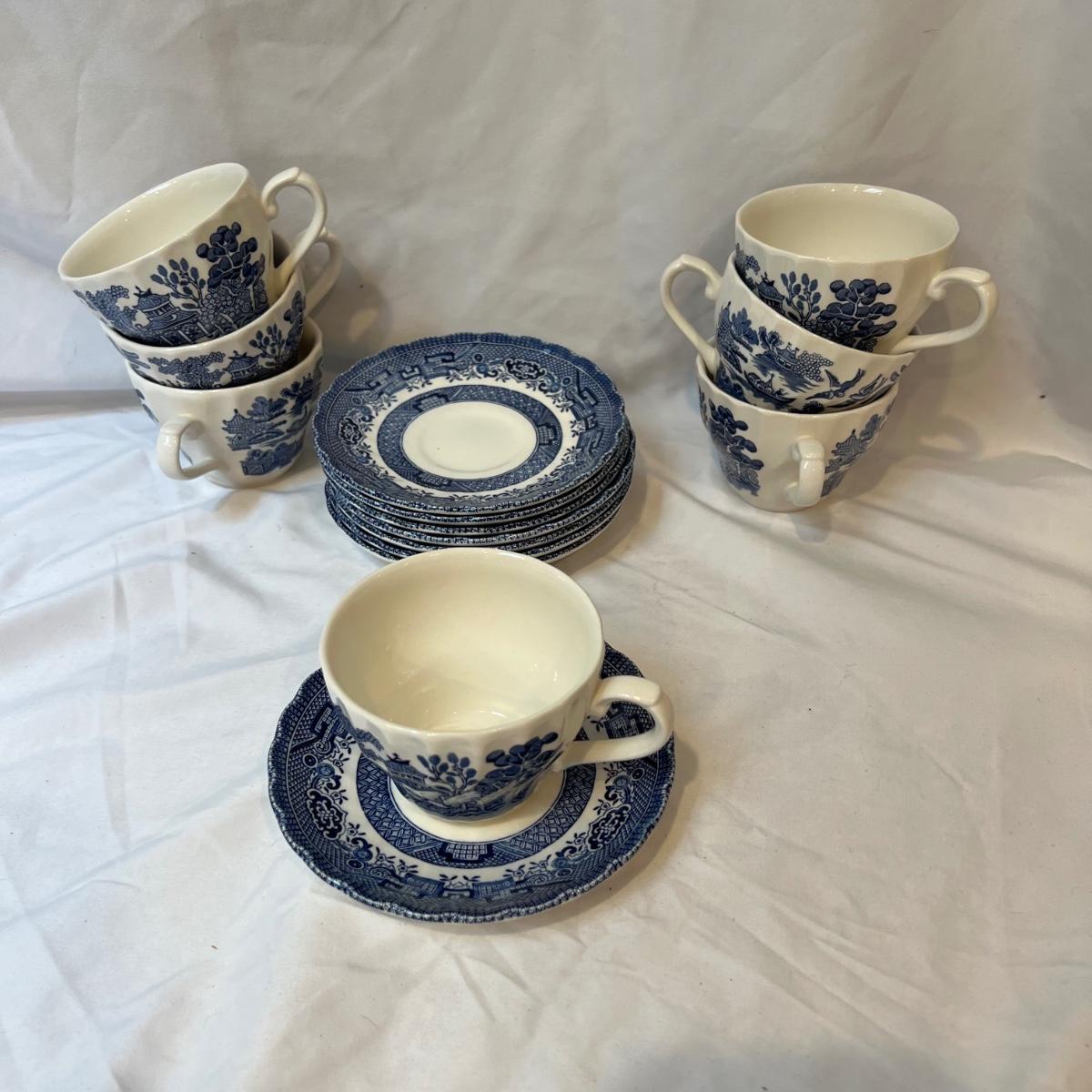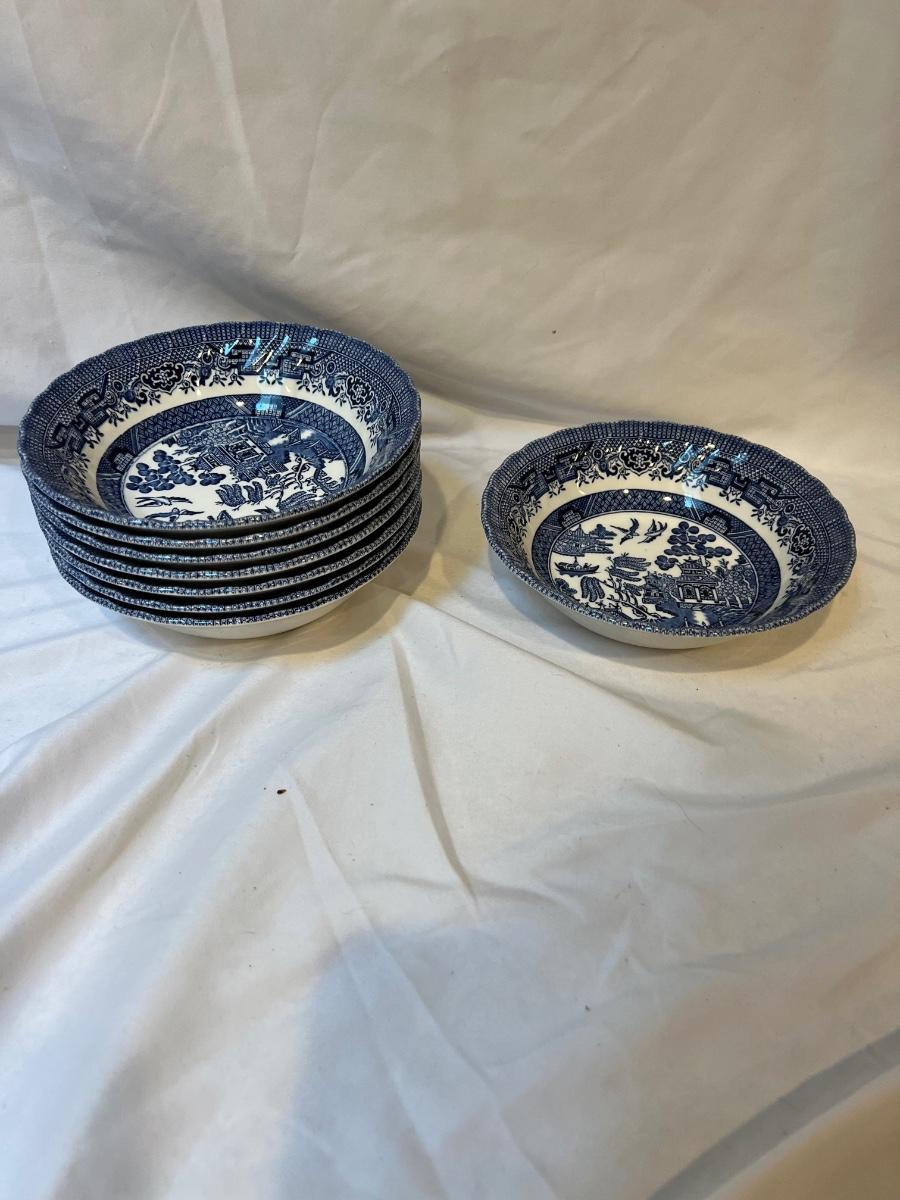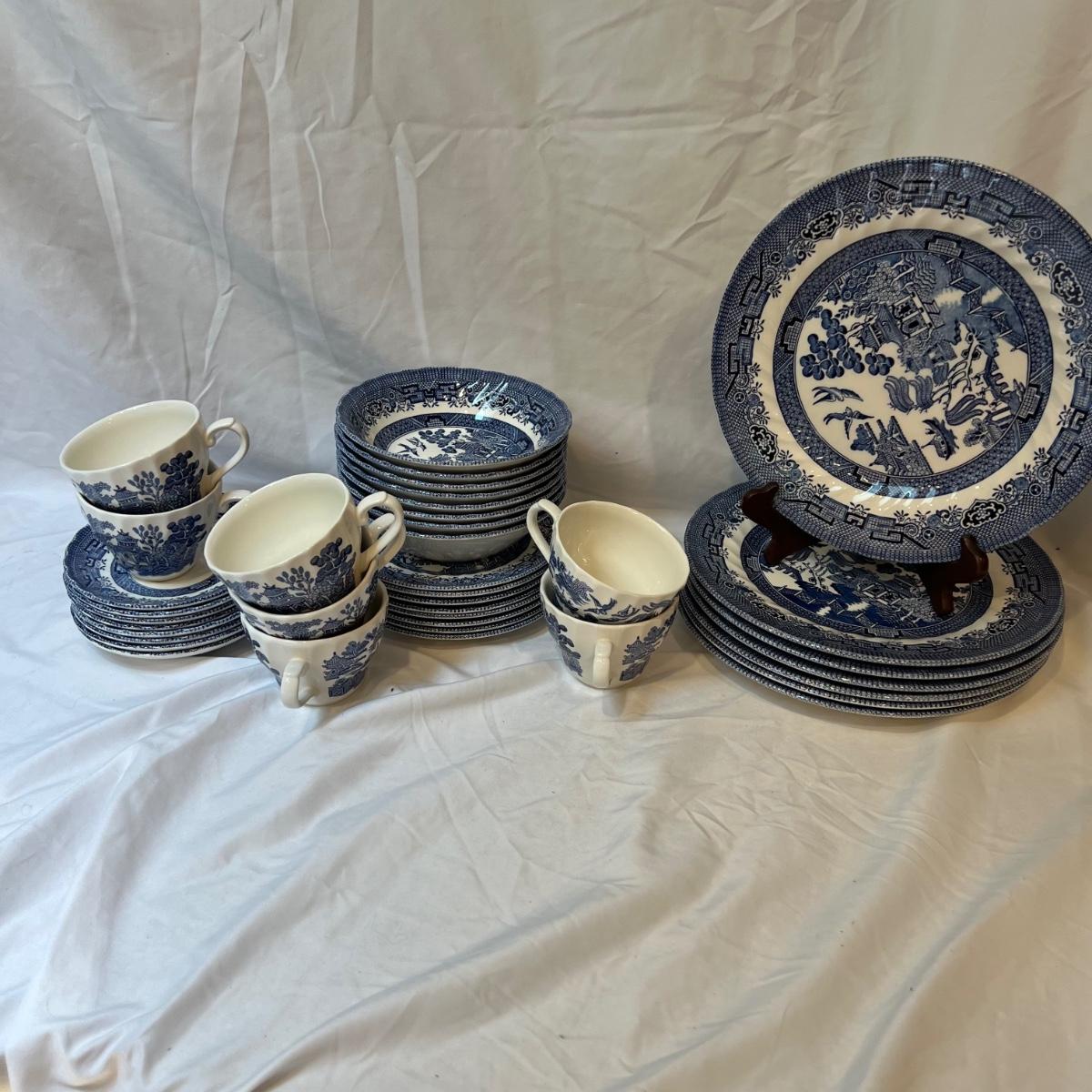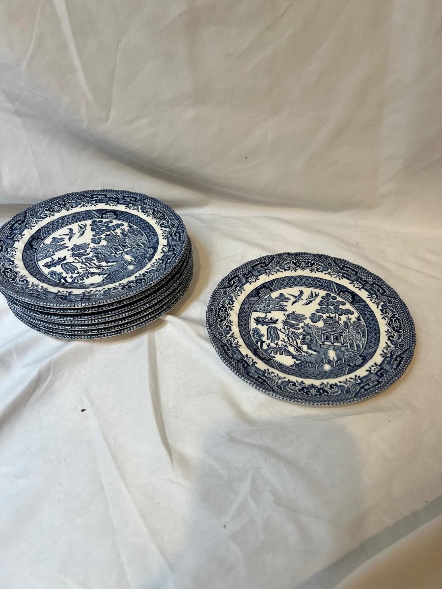 The set includes seven 10”D dinner plates. Also eight 5.5”D saucers and seven 3”D x 275”H cups. Eight 6.5”D bowls and eight 7”D plates.