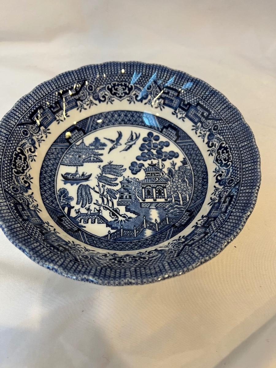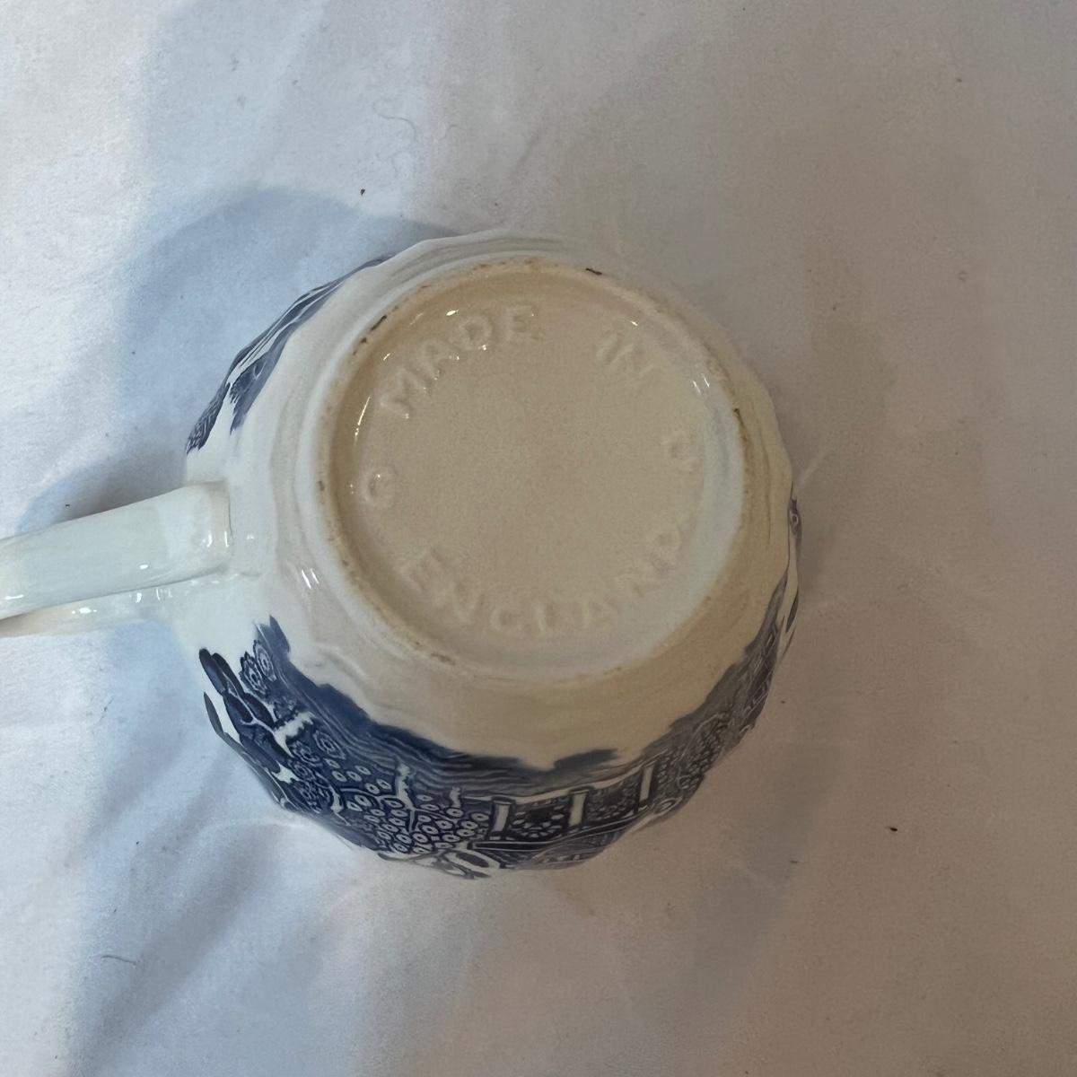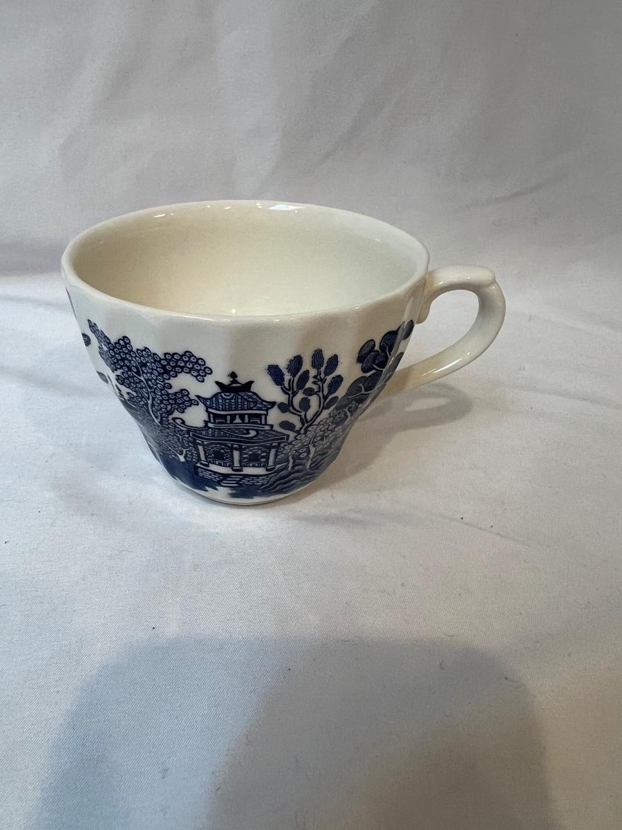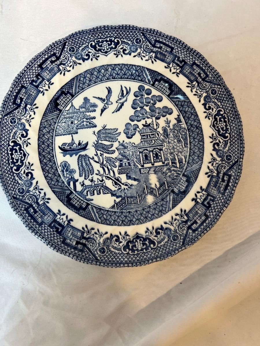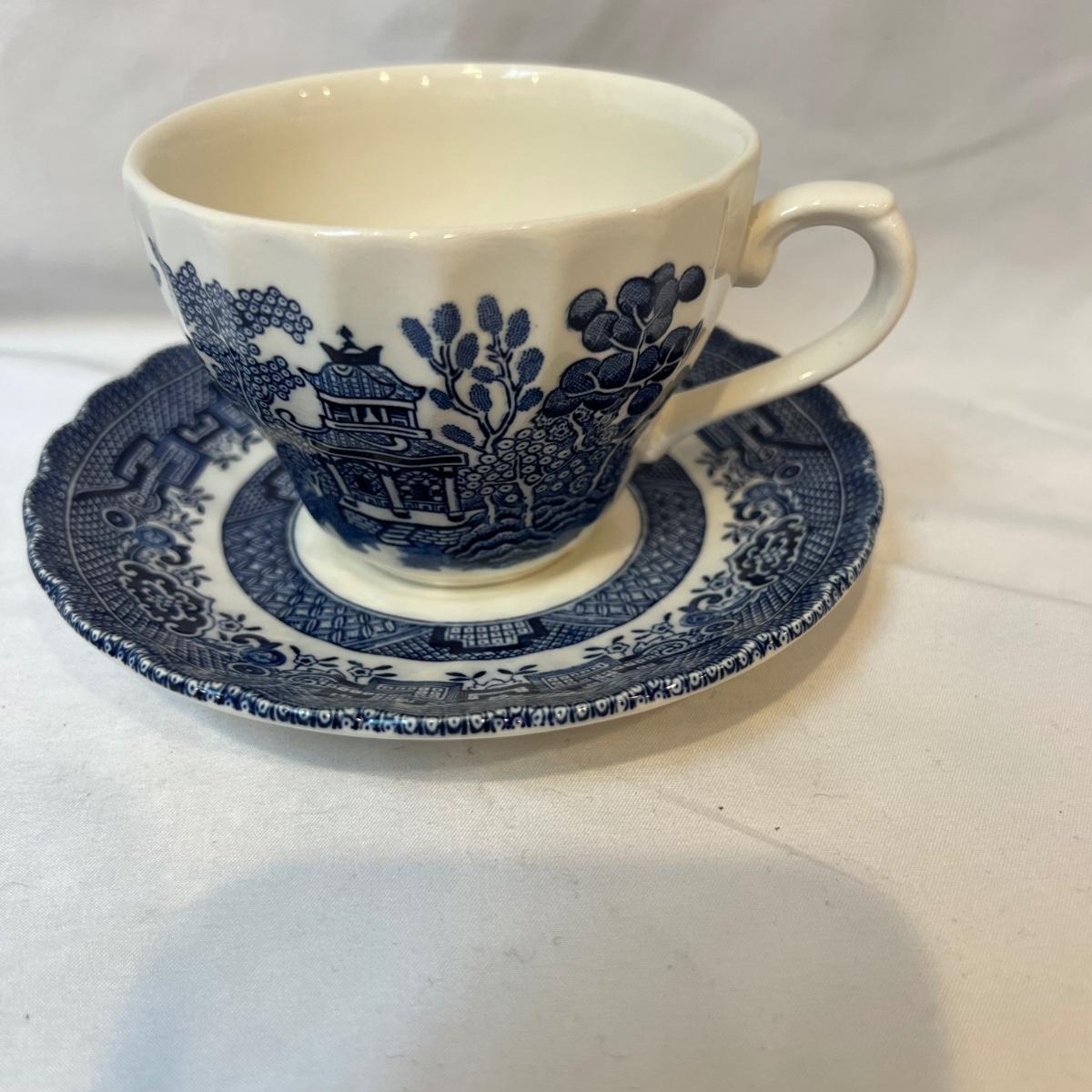 The set includes seven 10”D dinner plates. Also eight 5.5”D saucers and seven 3”D x 275”H cups. Eight 6.5”D bowls and eight 7”D plates.