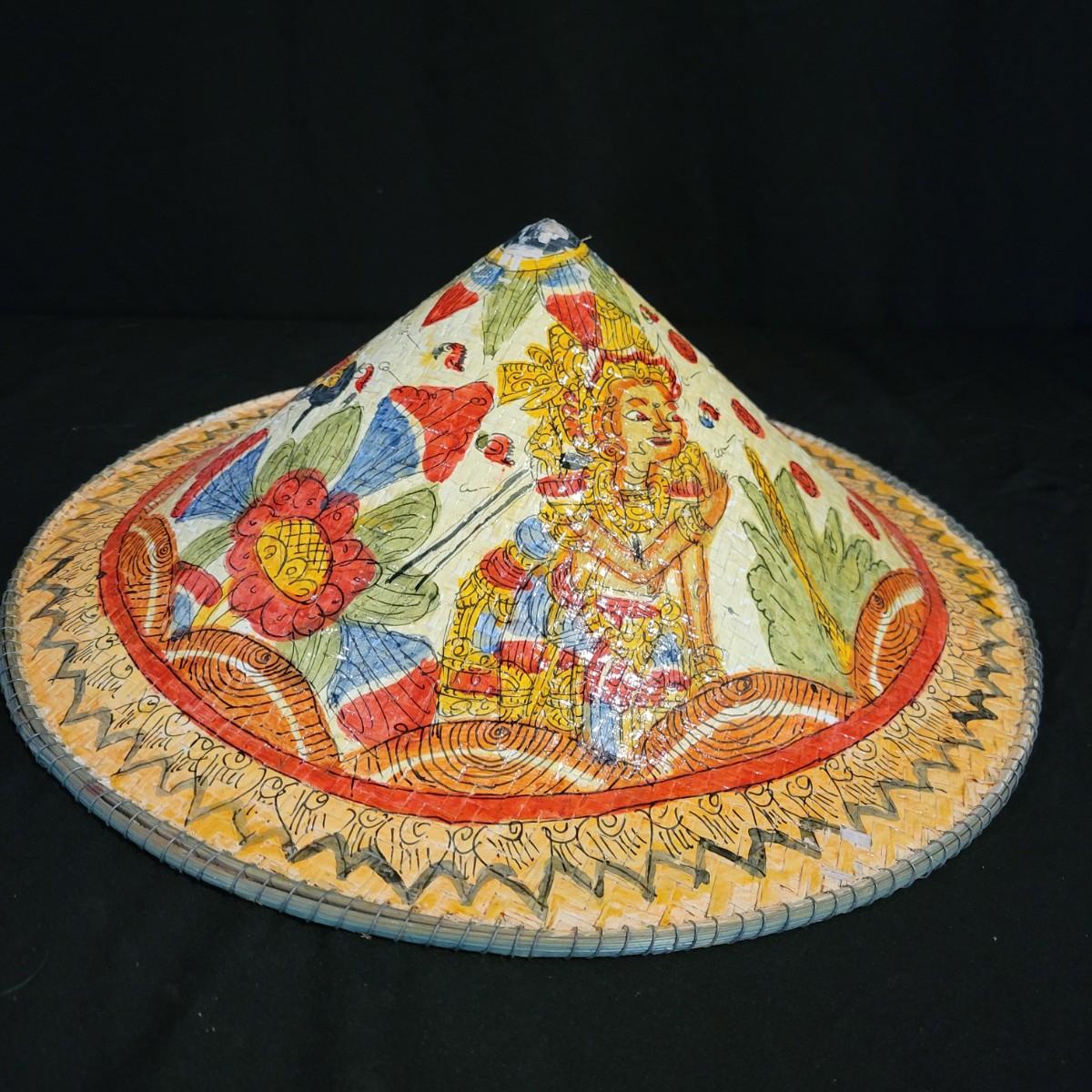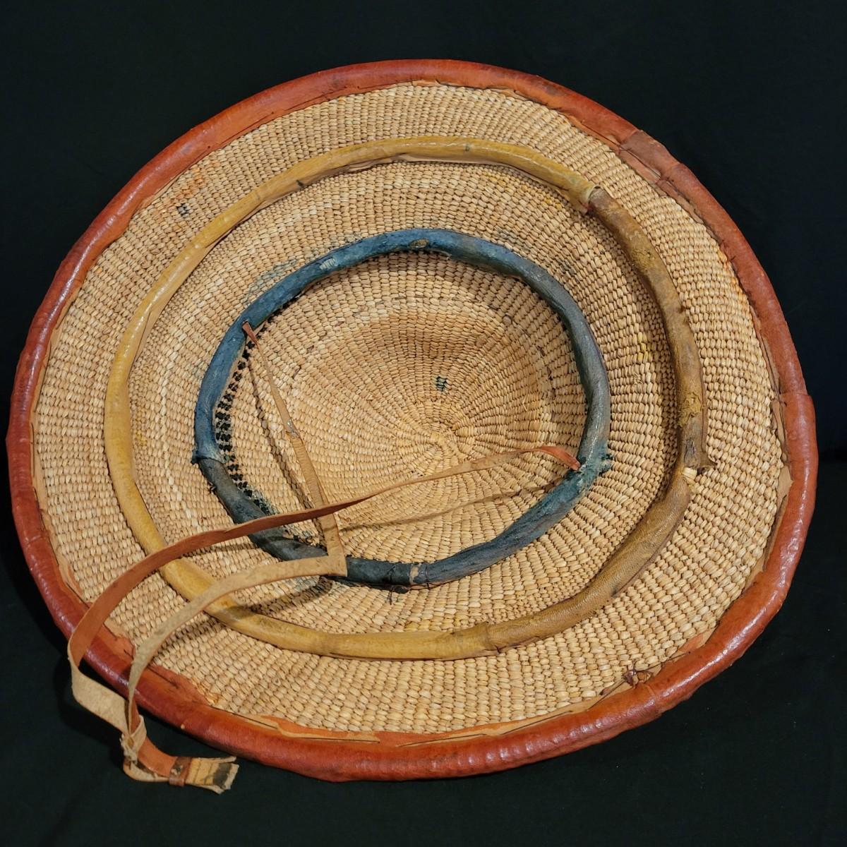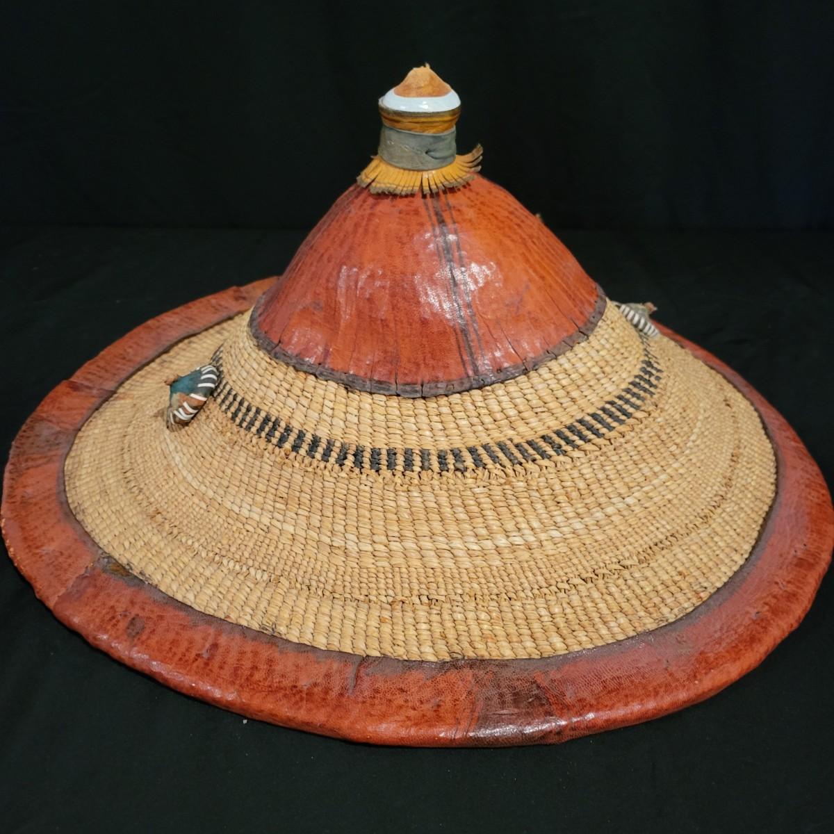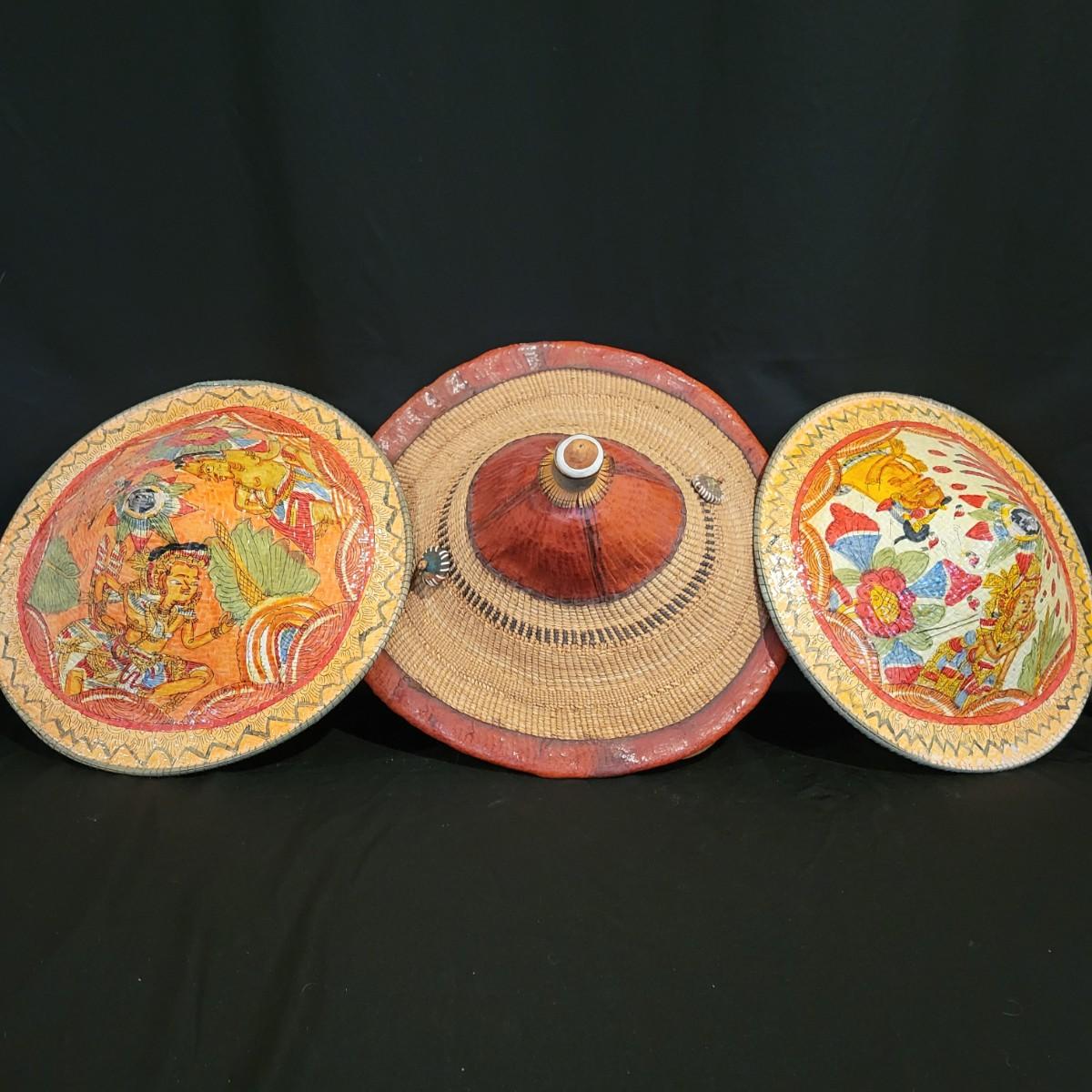 An assortment of three hats. One is a West African Fulani-style hat made of woven straw and a thin leather. It measures approximately 18"D x 8"H. Also included are two Chinese woven rattan hats that appear to be hand painted. Shipping available