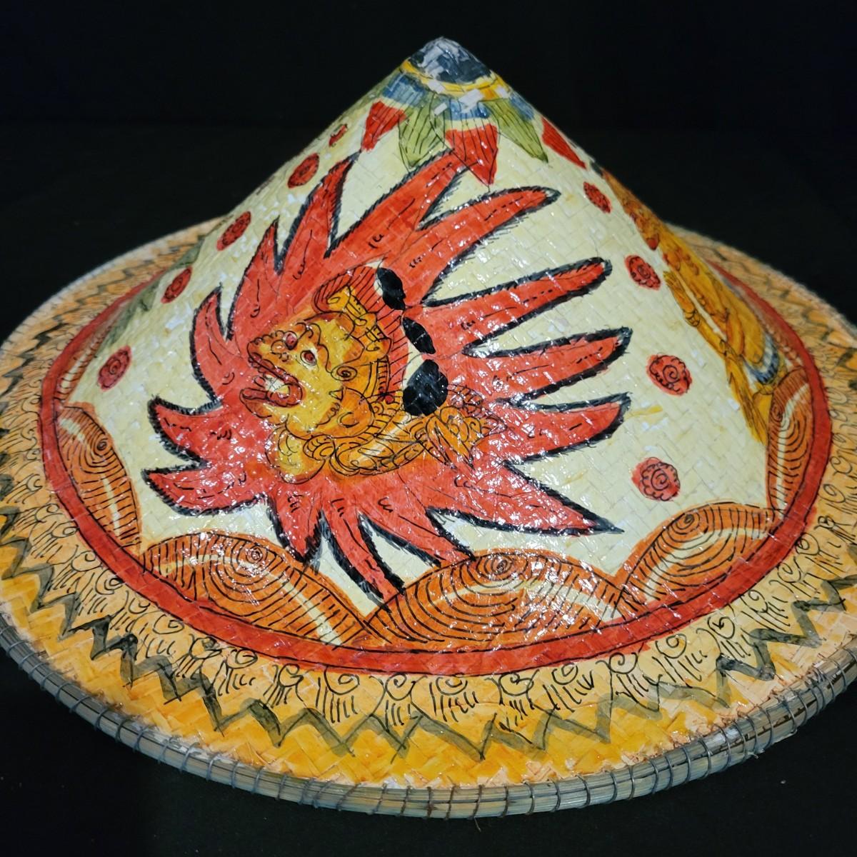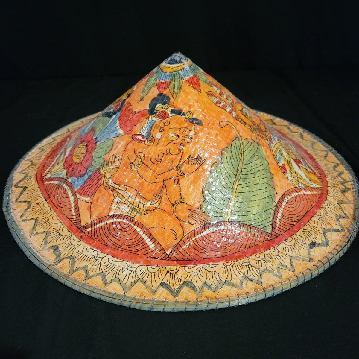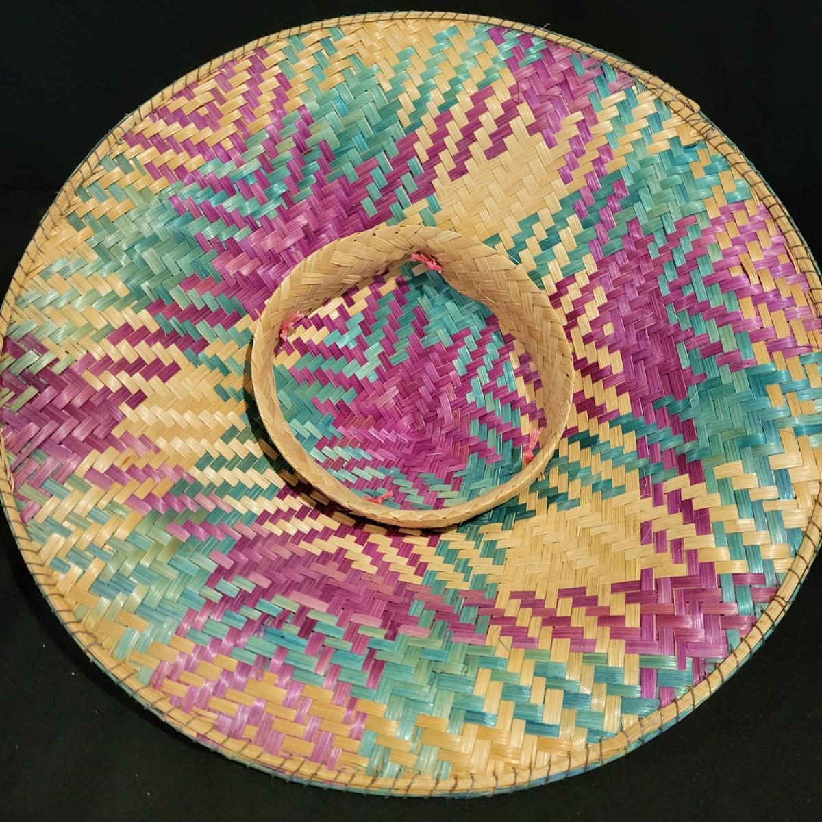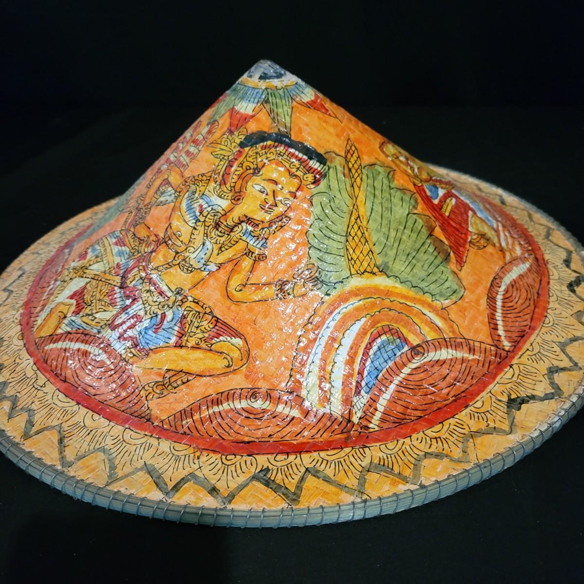An assortment of three hats. One is a West African Fulani-style hat made of woven straw and a thin leather. It measures approximately 18"D x 8"H. Also included are two Chinese woven rattan hats that appear to be hand painted. Shipping available