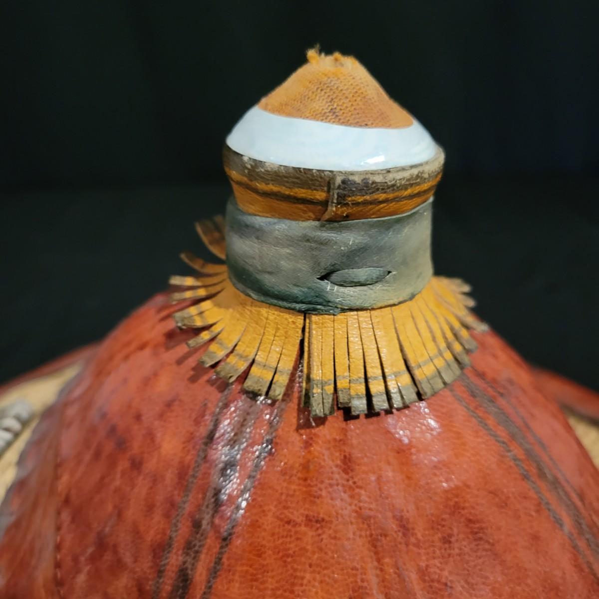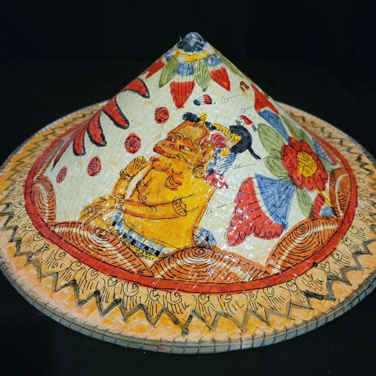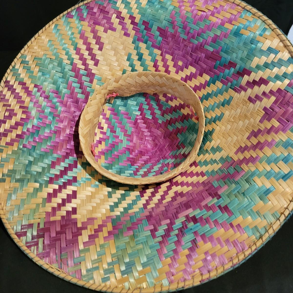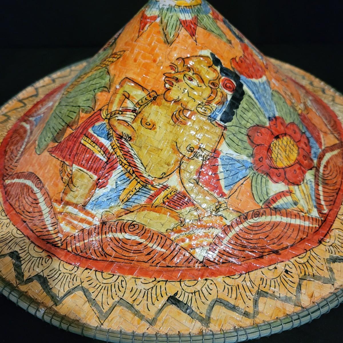 An assortment of three hats. One is a West African Fulani-style hat made of woven straw and a thin leather. It measures approximately 18"D x 8"H. Also included are two Chinese woven rattan hats that appear to be hand painted. Shipping available