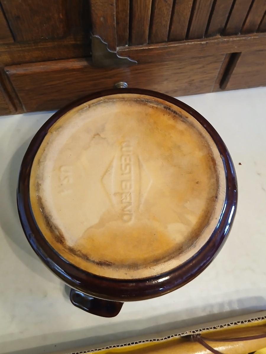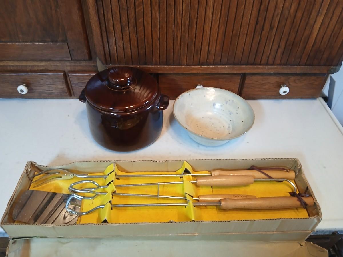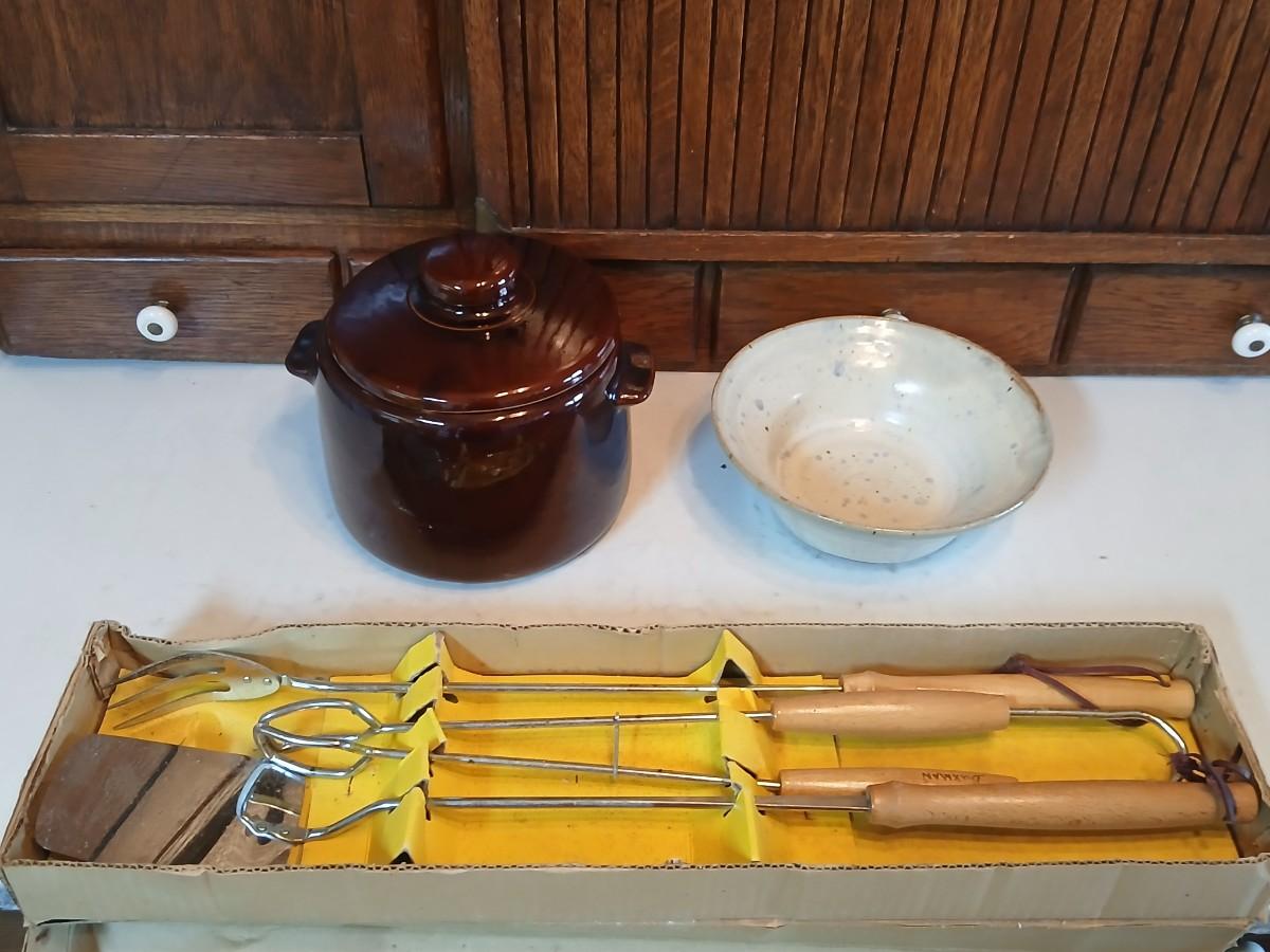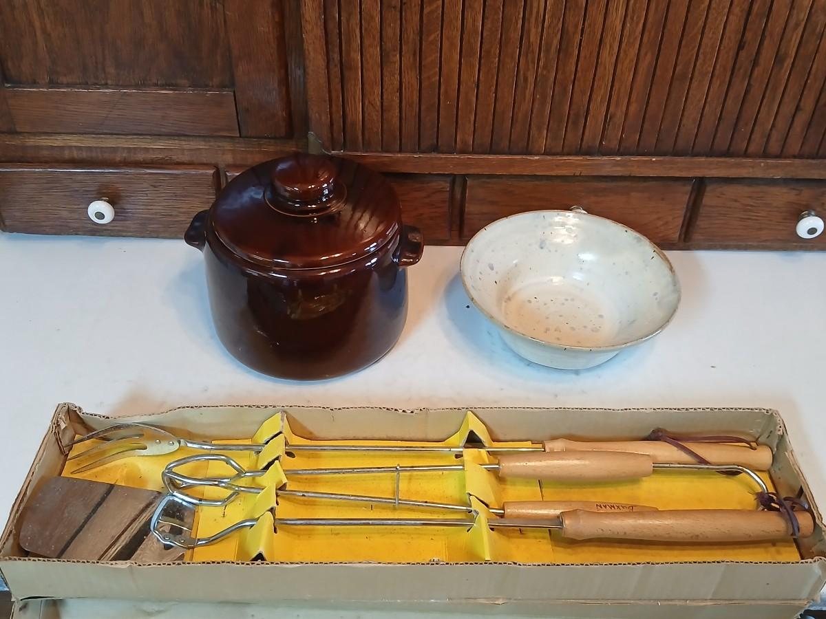 West bend bean pot - Signed Pottery bowl and a bbq utensil set