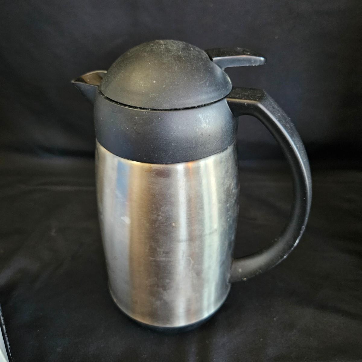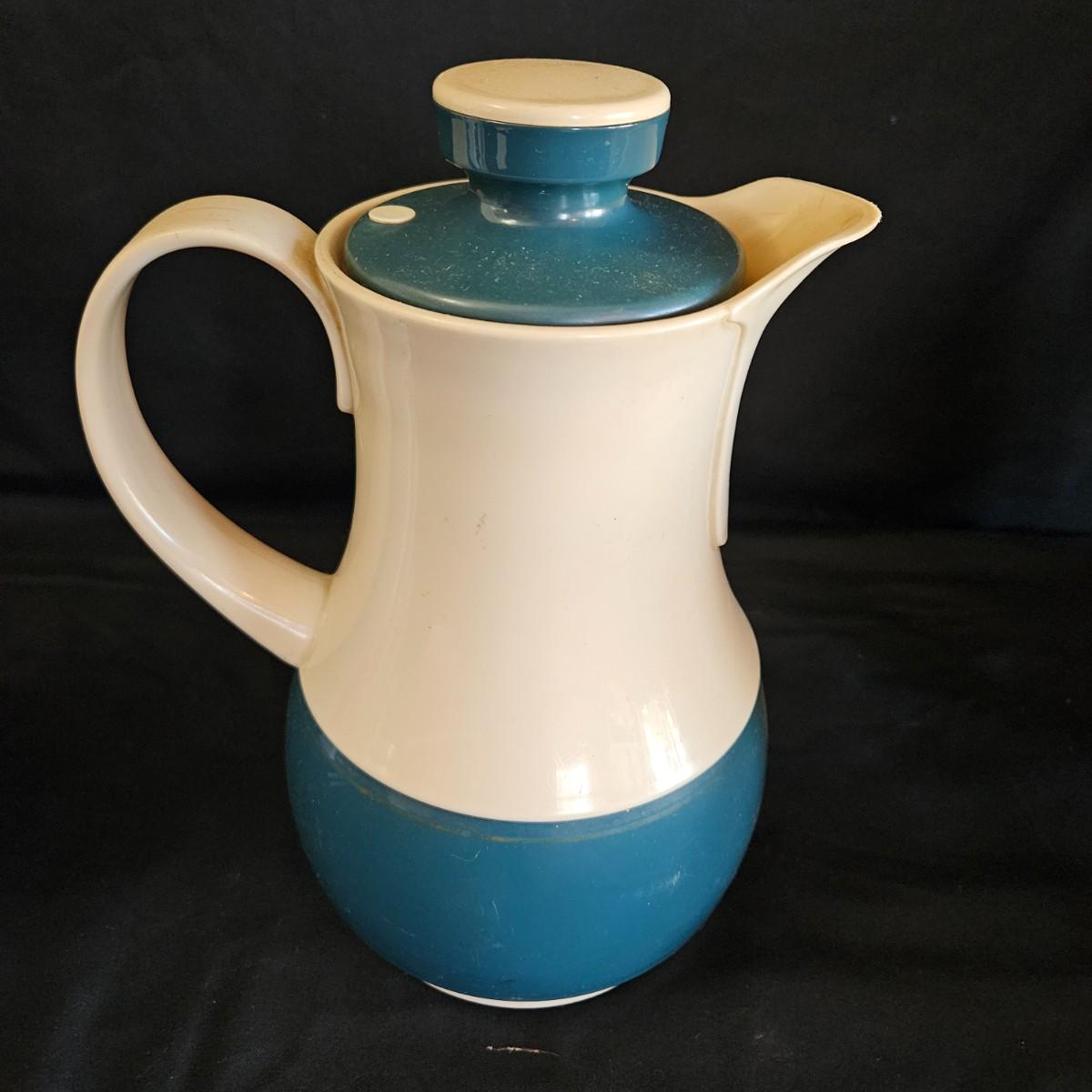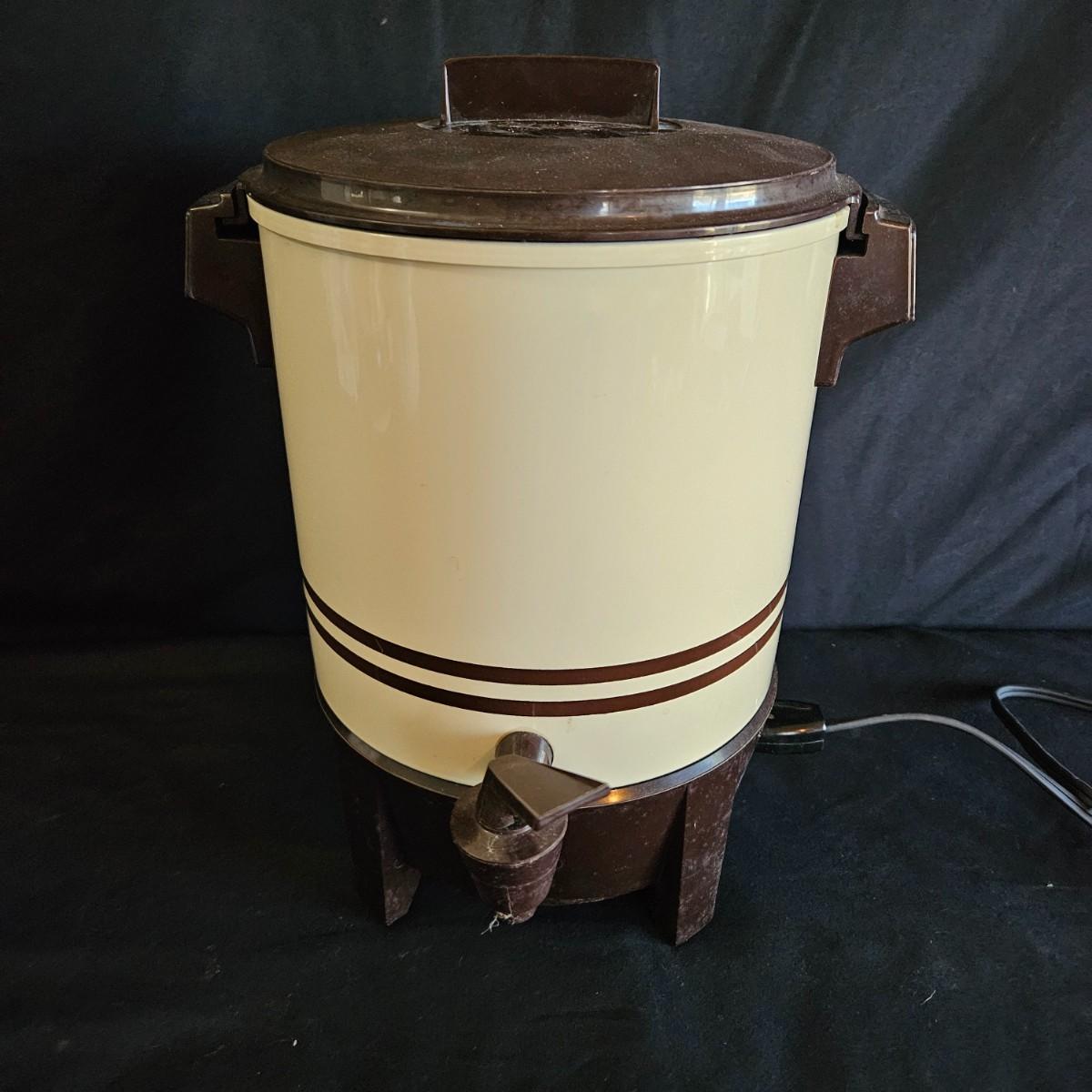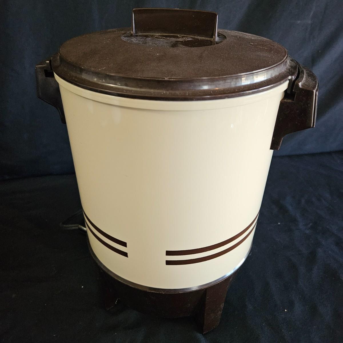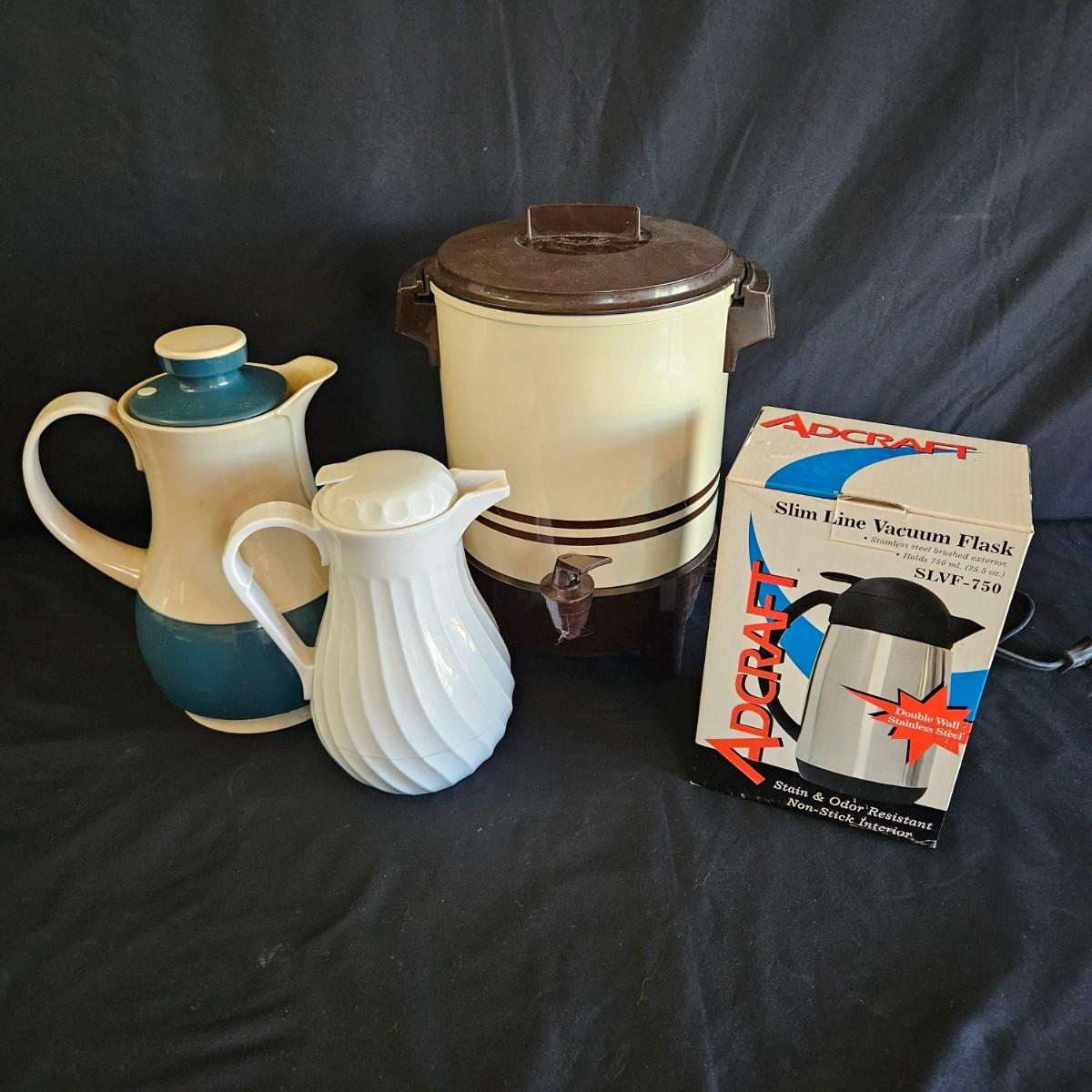 A West Bend party percolator that powered on when plugged in, it measures approximately 8"D x 12.5"H. Also included are three coffee carafes. One is made by Thermos and one is a vacuum flask in its original packaging. Shipping available.