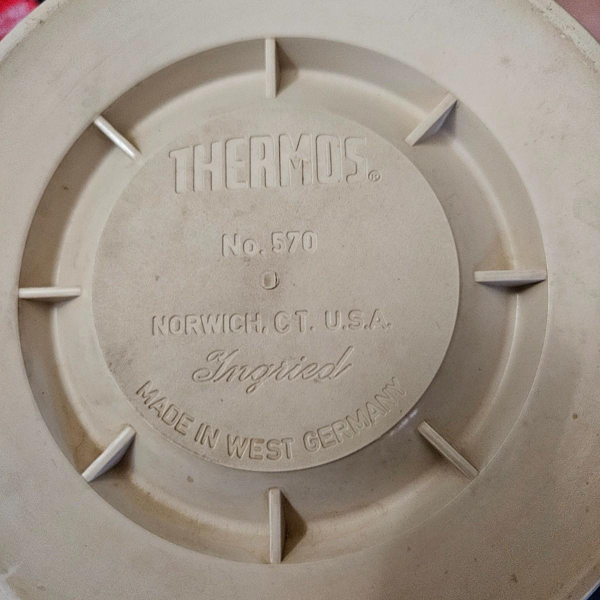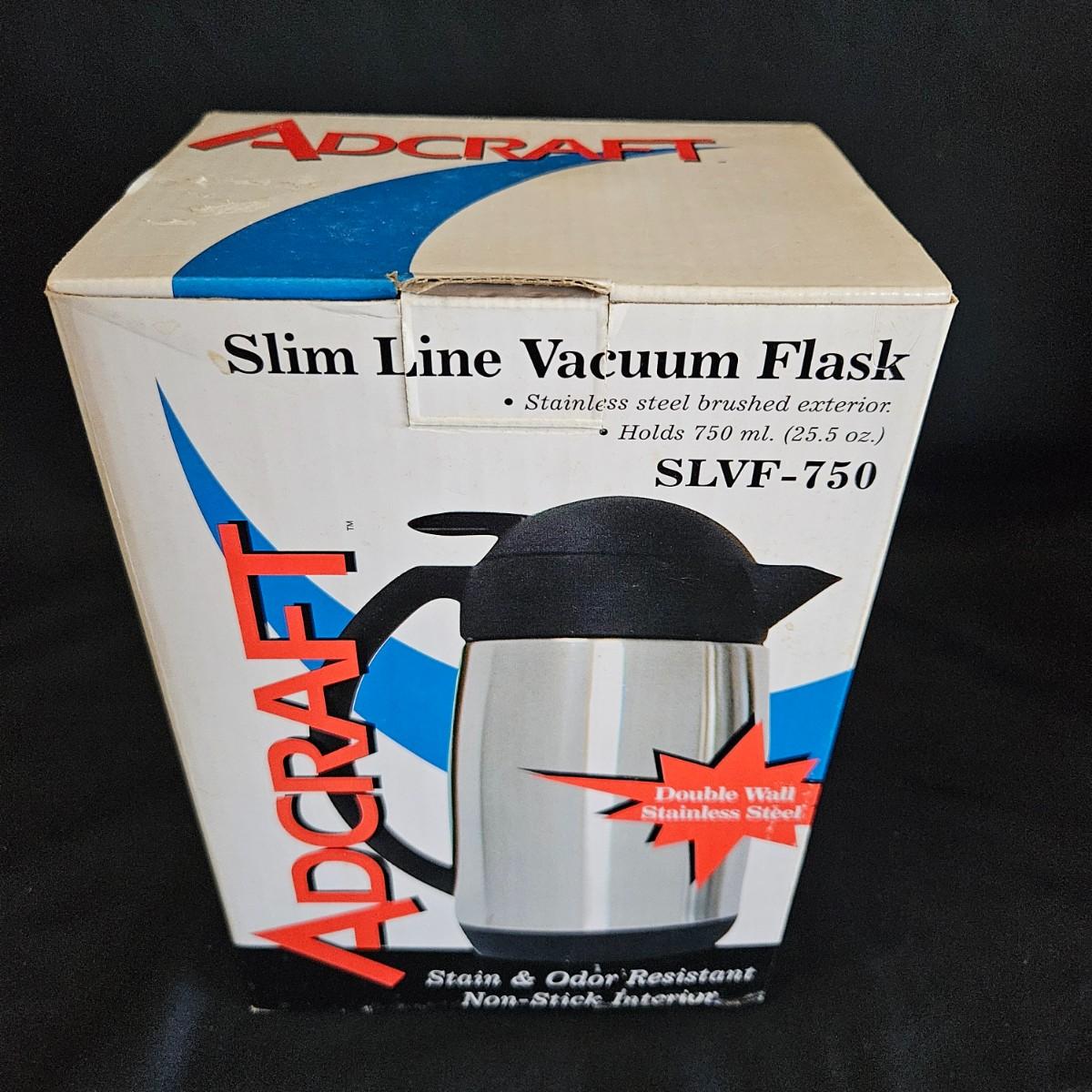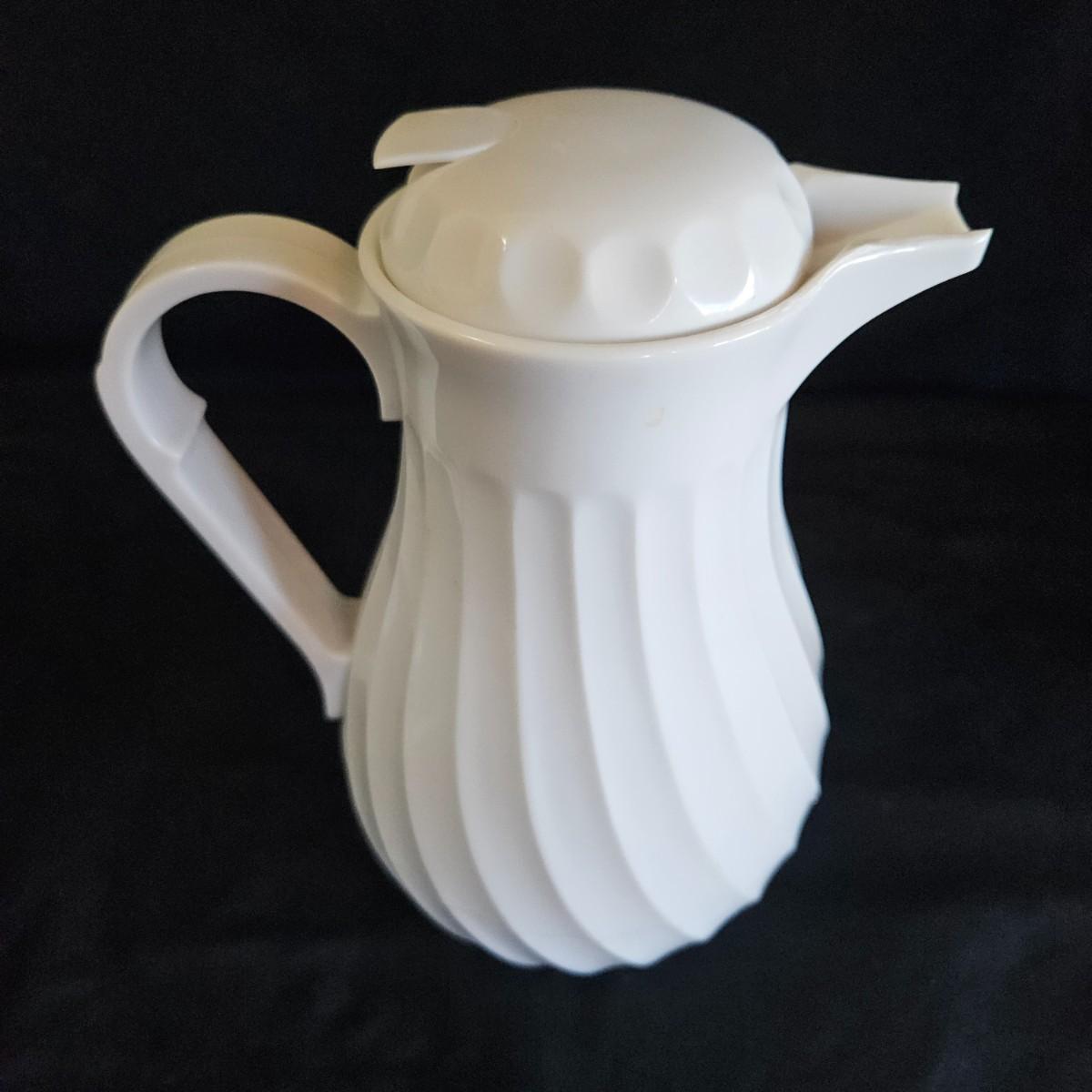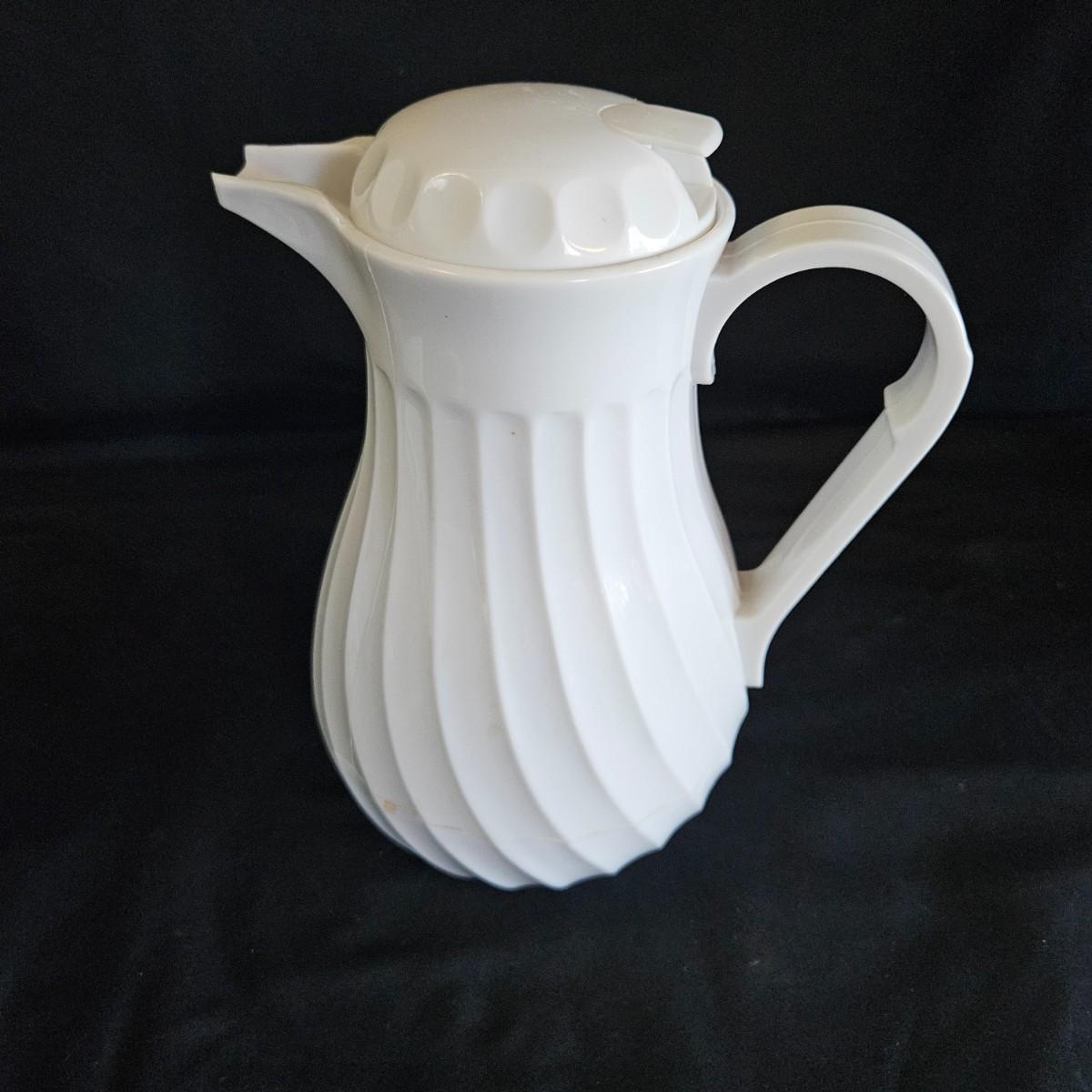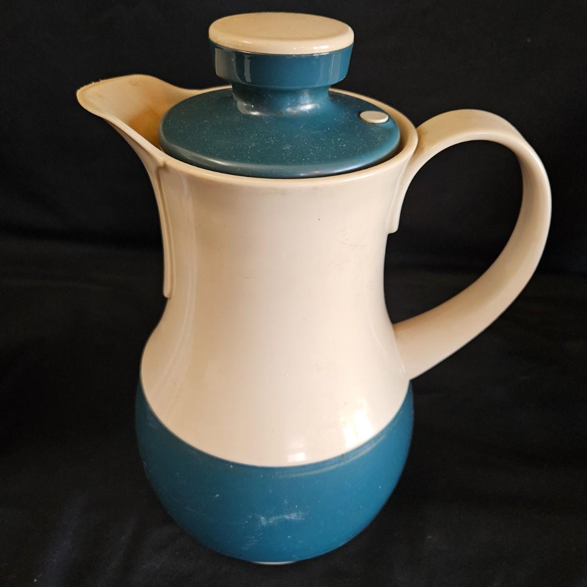 A West Bend party percolator that powered on when plugged in, it measures approximately 8"D x 12.5"H. Also included are three coffee carafes. One is made by Thermos and one is a vacuum flask in its original packaging. Shipping available.