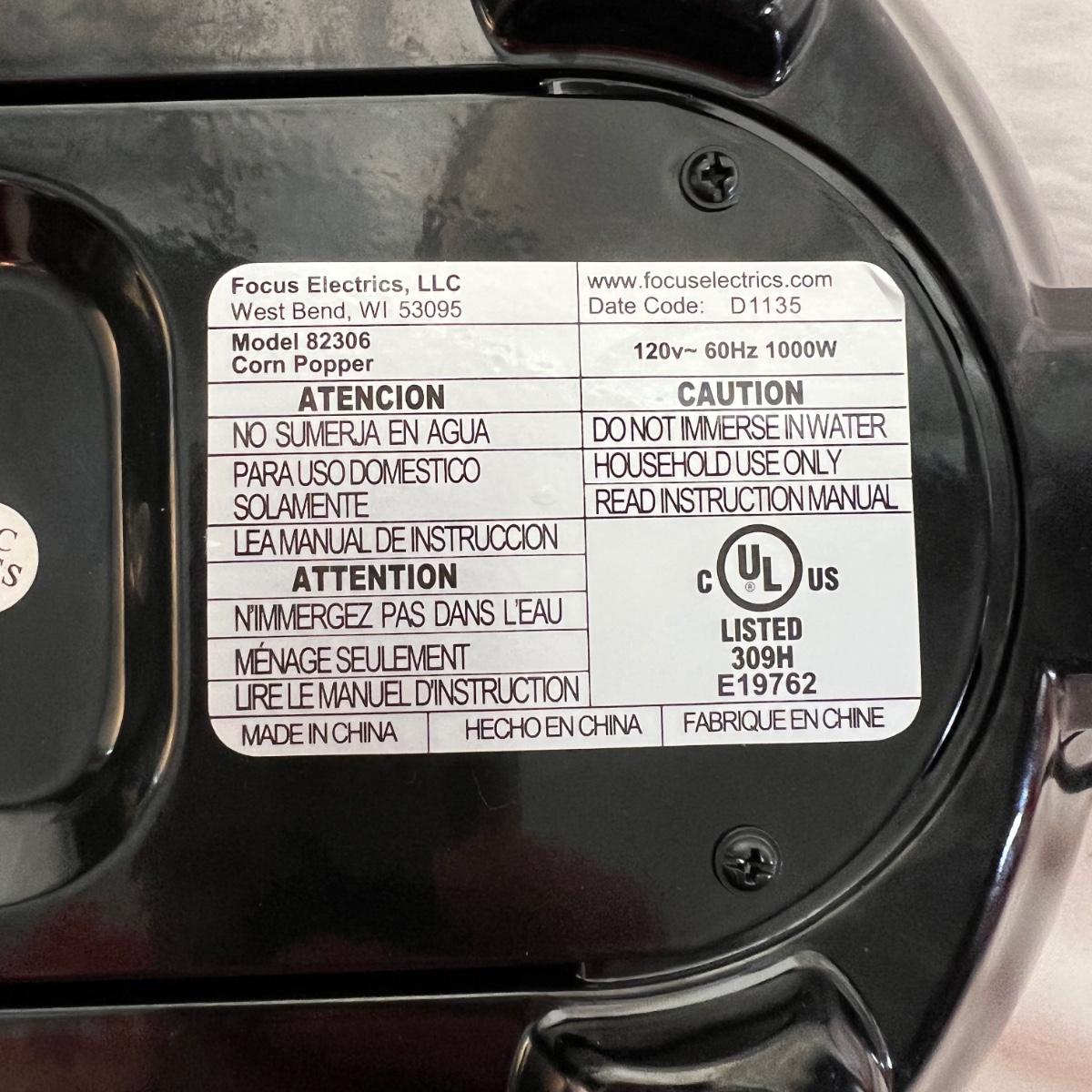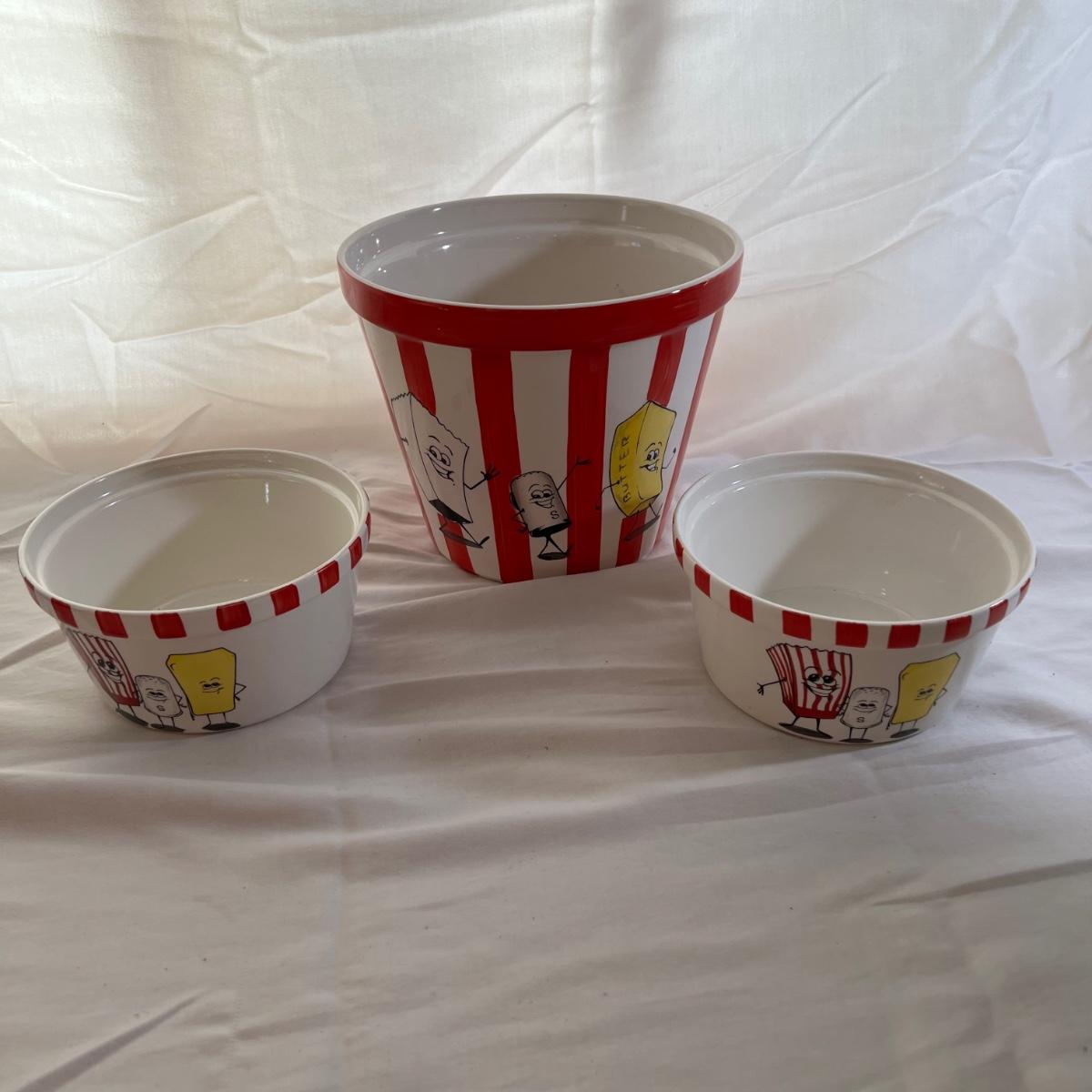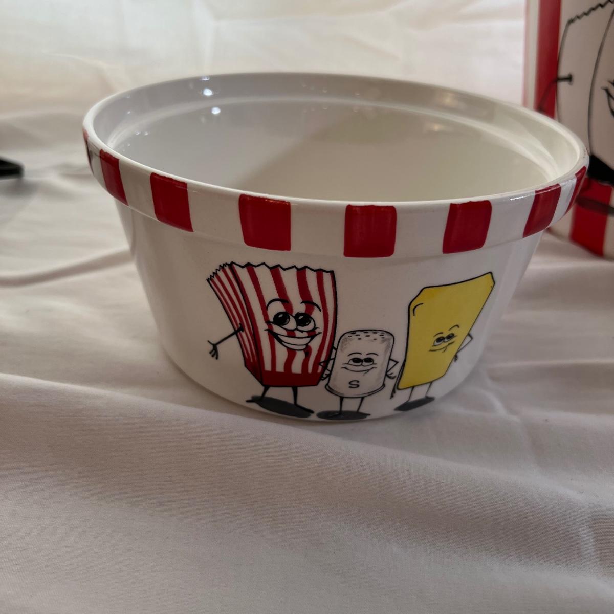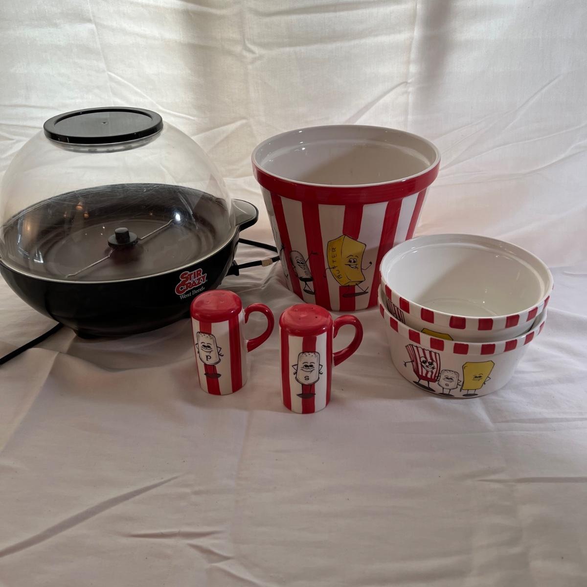 West Bend Stir Crazy popcorn popper (model 82306). Item was tested and works. Also includes a Kitchen Prep 101 ceramic popcorn serving set that has two serving bowls and one large popcorn bowl 7.5” x 9”. Set includes two refillable salt and pepper shakers. Shipping available.