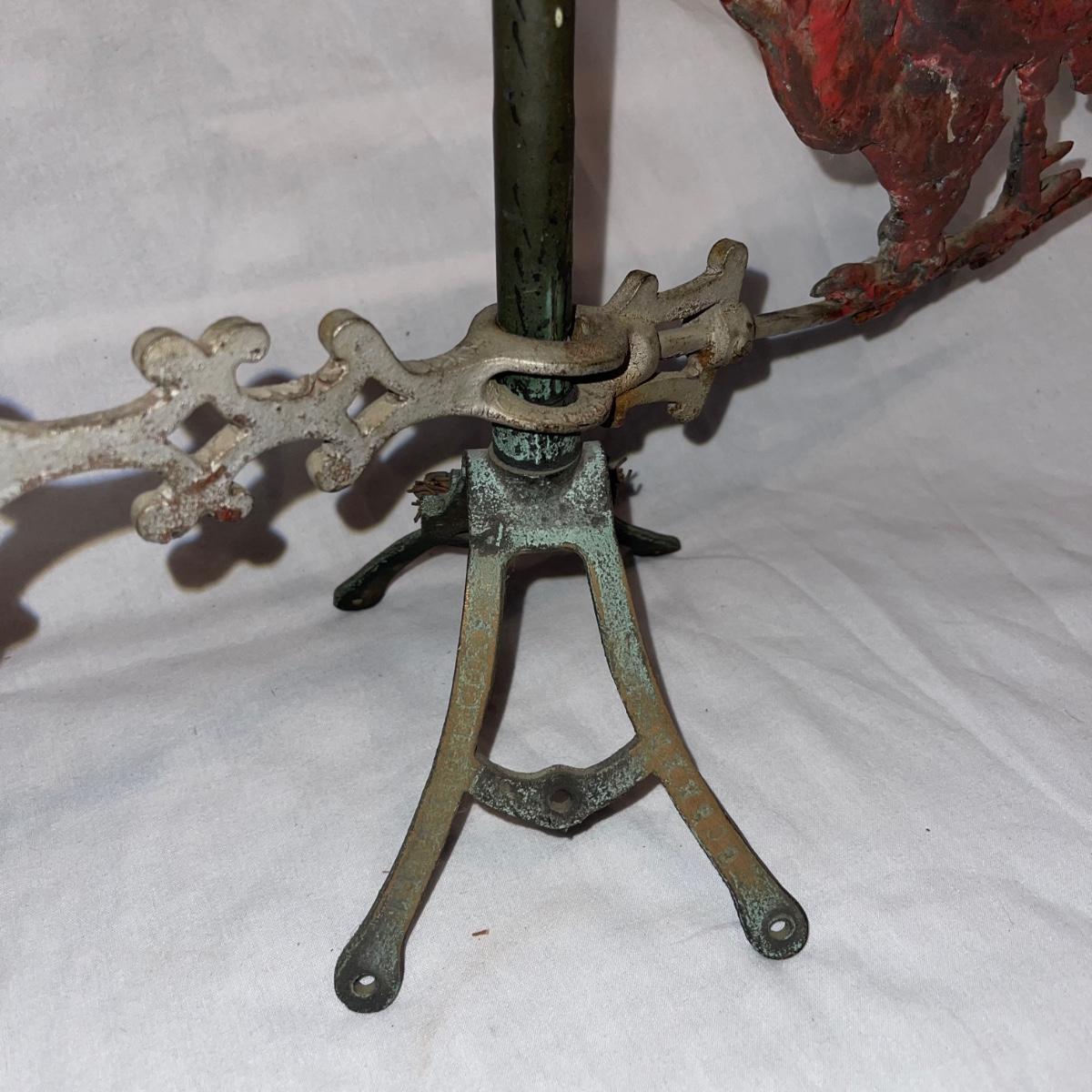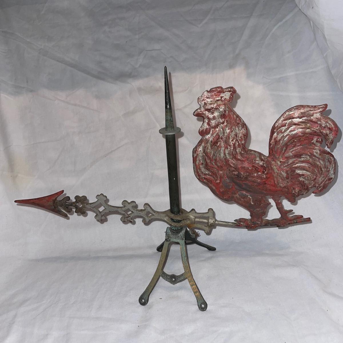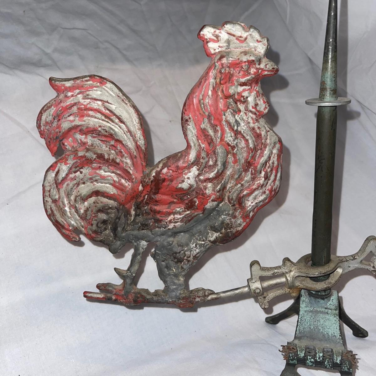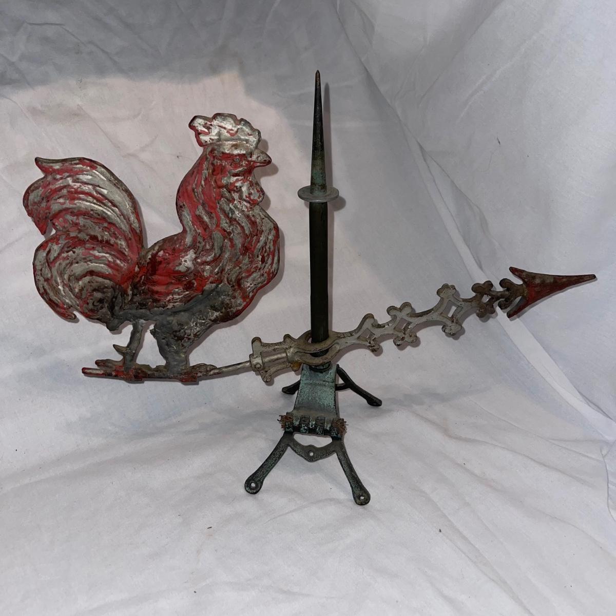 A West Dodd Corp. weathervane with a red rooster. It measures about 15.5 inches tall and 21 inches long. The rooster weighs down the arrow a bit so it sits crooked on the post, there is wear and discoloration from age.