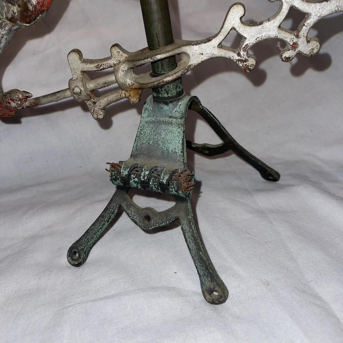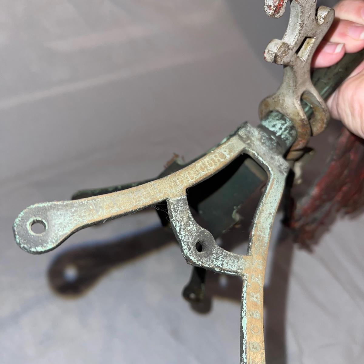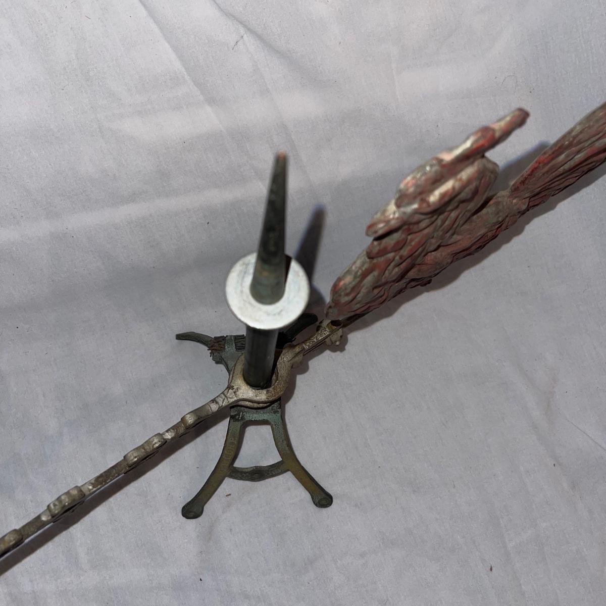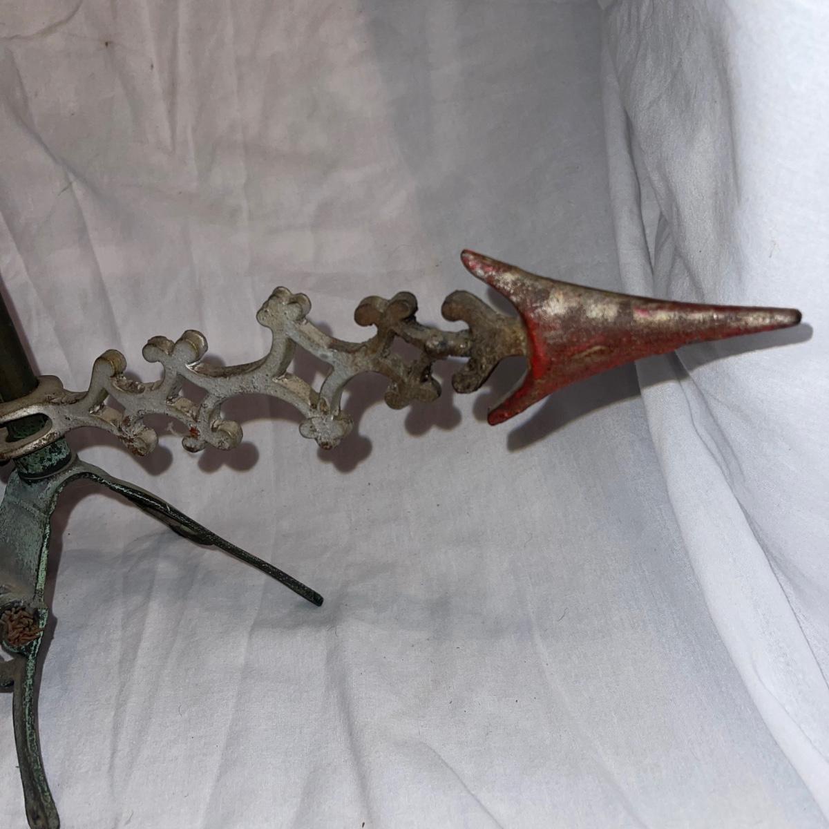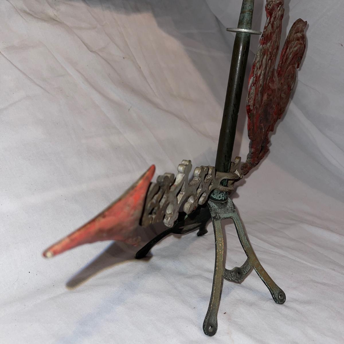 A West Dodd Corp. weathervane with a red rooster. It measures about 15.5 inches tall and 21 inches long. The rooster weighs down the arrow a bit so it sits crooked on the post, there is wear and discoloration from age.