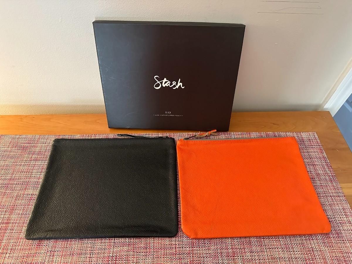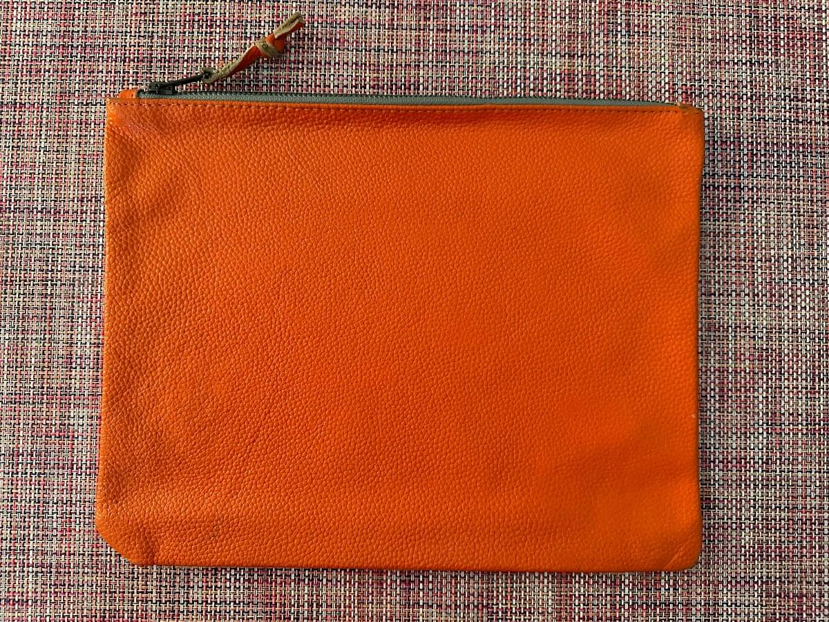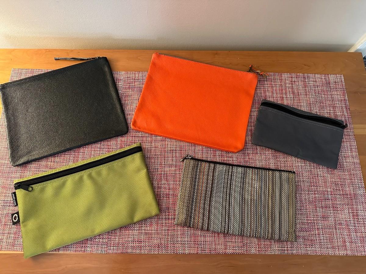 1 Black Leather Zipper Pouch from West Elm w/Box 9"x 11.5", Orange Leather Zipper Pouch - possibly West Elm9"x 11.5", 1 tech gear Green zipper pouch 12"x 7", 1 Cumberland Concepts gray medium all purpose zipper bag 8.5"x 5", 1 Crate & Barrel chilewich Melange zip bag 10.75"x 6.23".