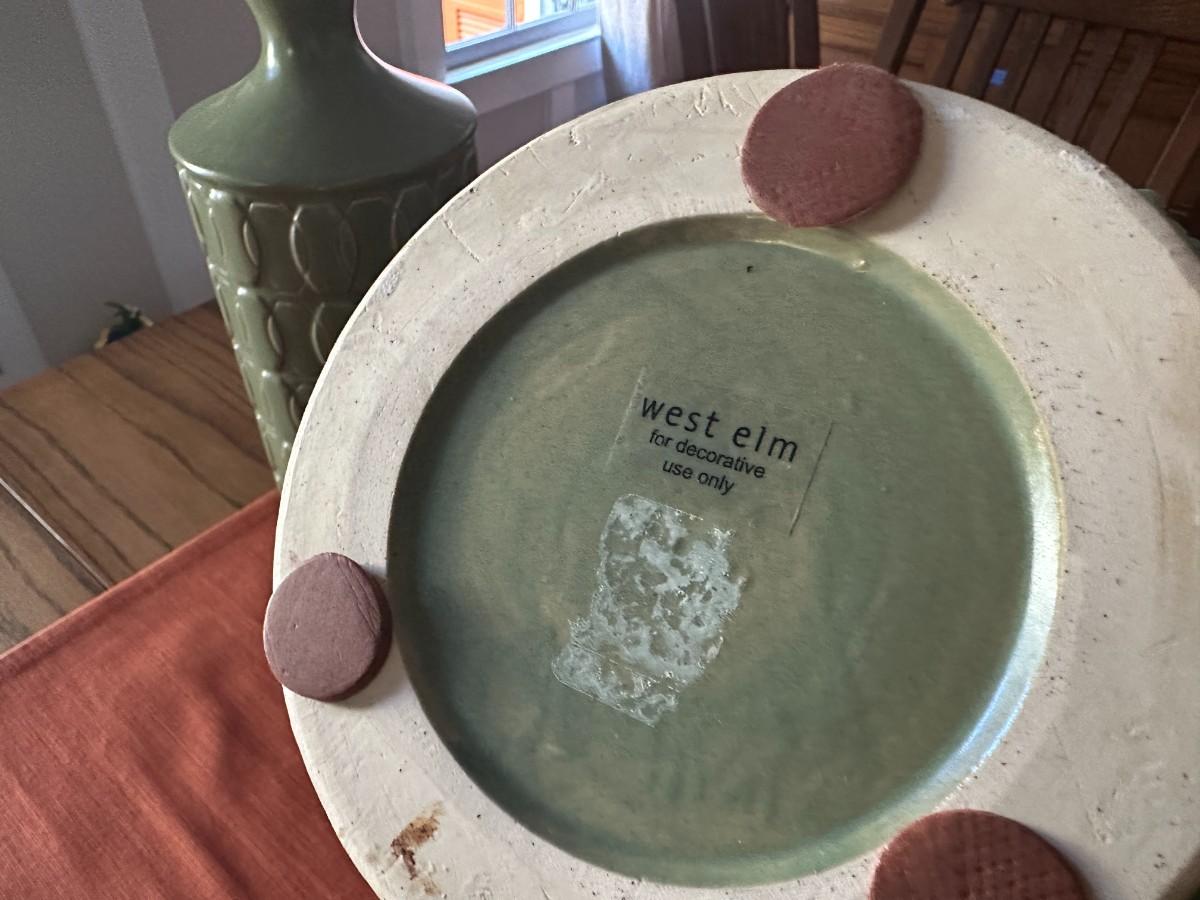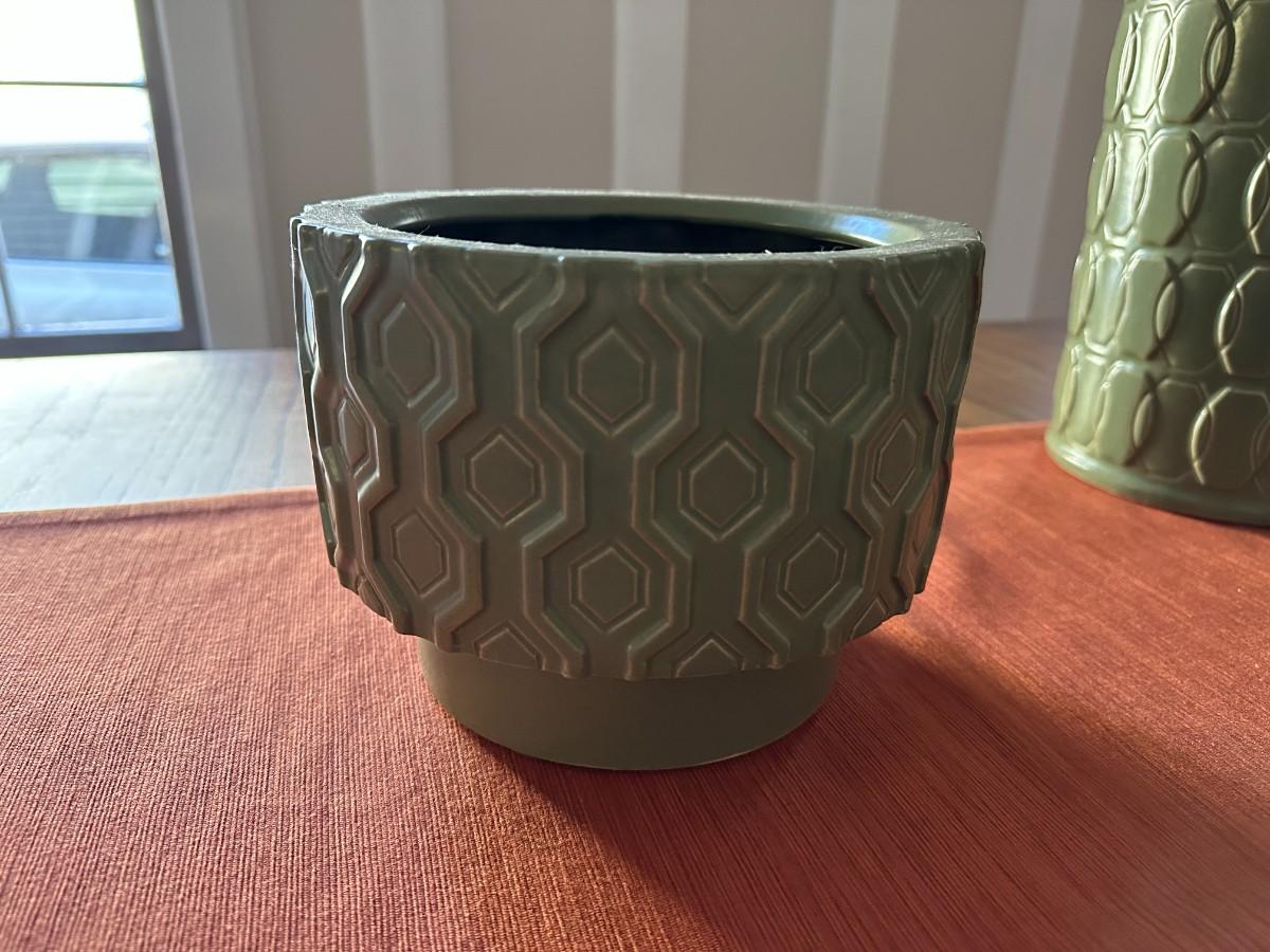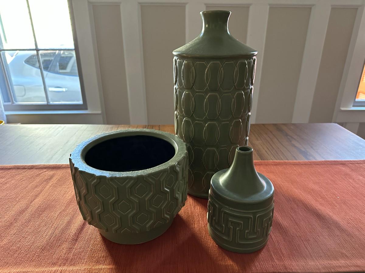 Set of 3 Green West Elm Pieces. Tall Vase 16"h, Small Vase 7"h & One Pot 6"h x 8"w
