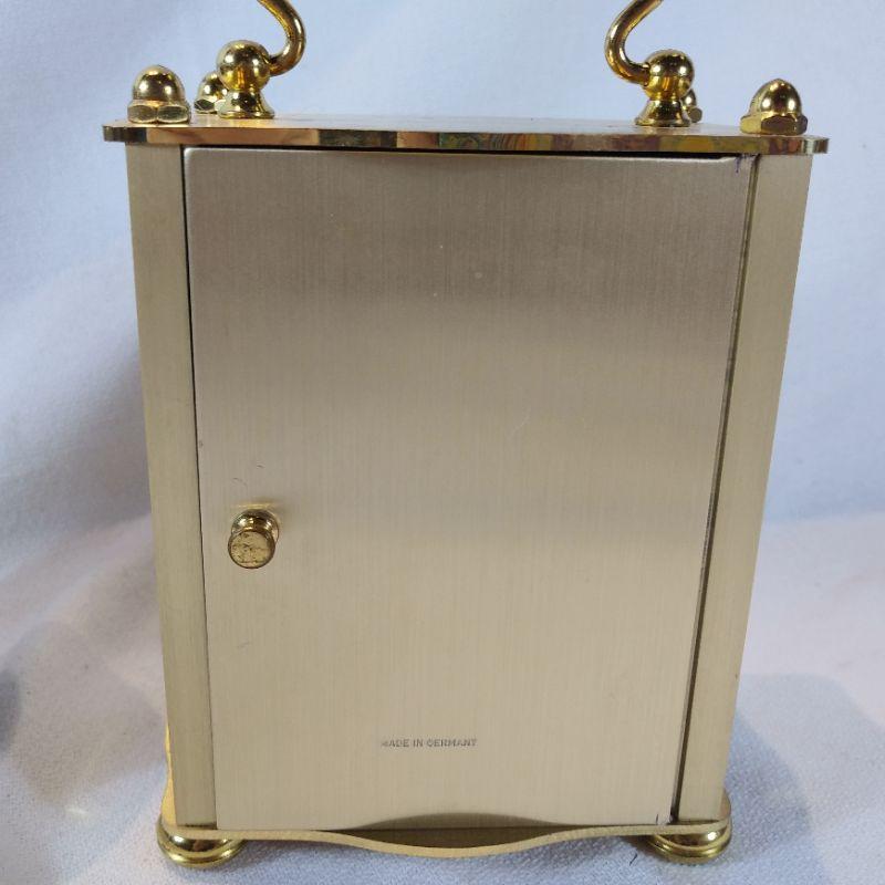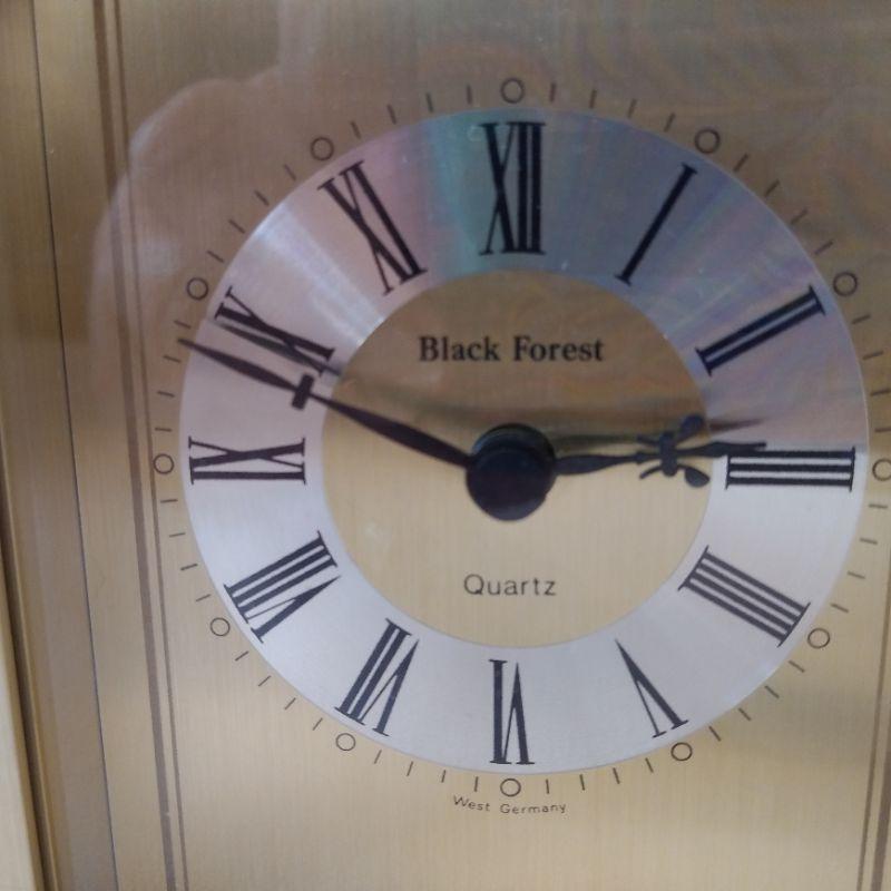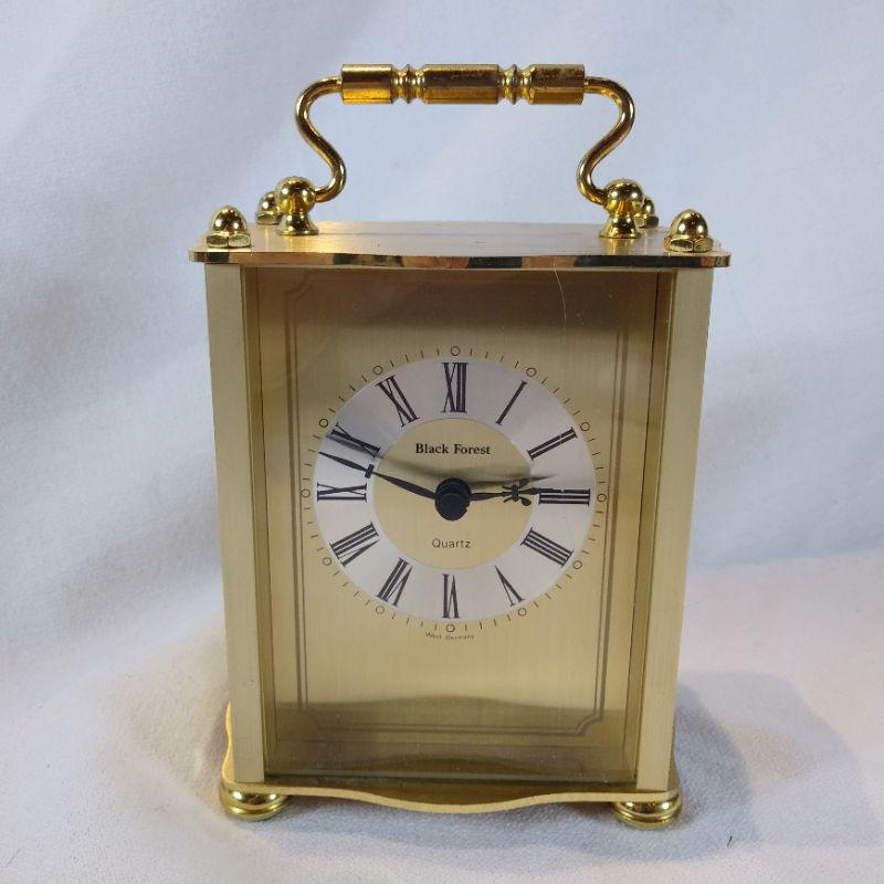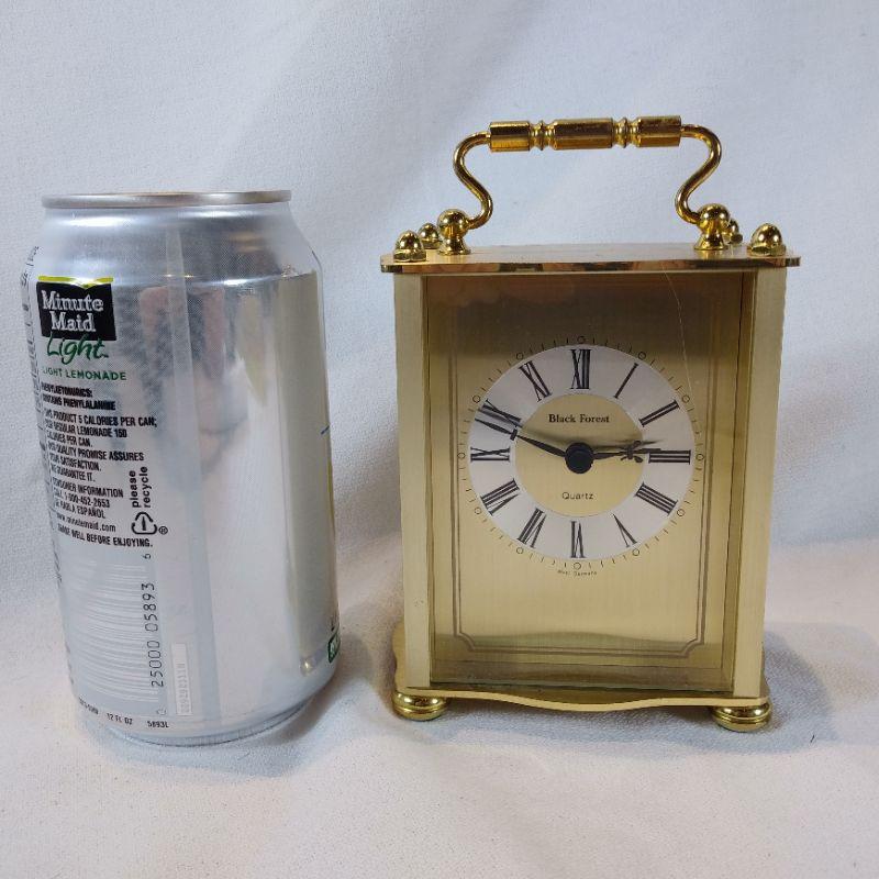 Small table-top quartz brass clock. Marked Black Forest and West German. We installed a new battery - works great! It is 5 1/2-inches tall X 3 3/4-inches wide X 2 1/2-inches deep. There are a few light blemishes on base, consistent with usage, overall in very good condition.